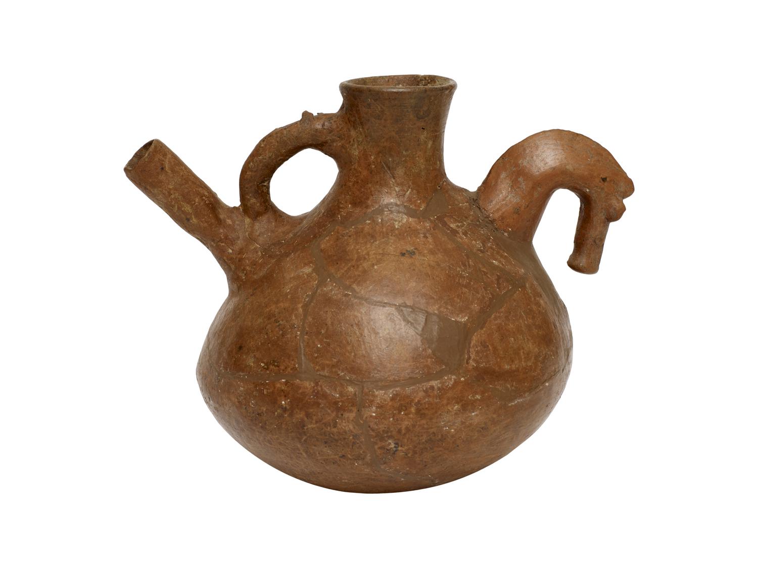 Brocca in terracotta rosso-bruno con becco versatoio tubolare raccordato alla bocca del vaso tramite un'ansa a sezione circolare. Dalla parte opposta del beccuccio è situata un'ansa modellata a testa di cavallo stilizzata, corpo lenticolare schiacciato, fondo piatto