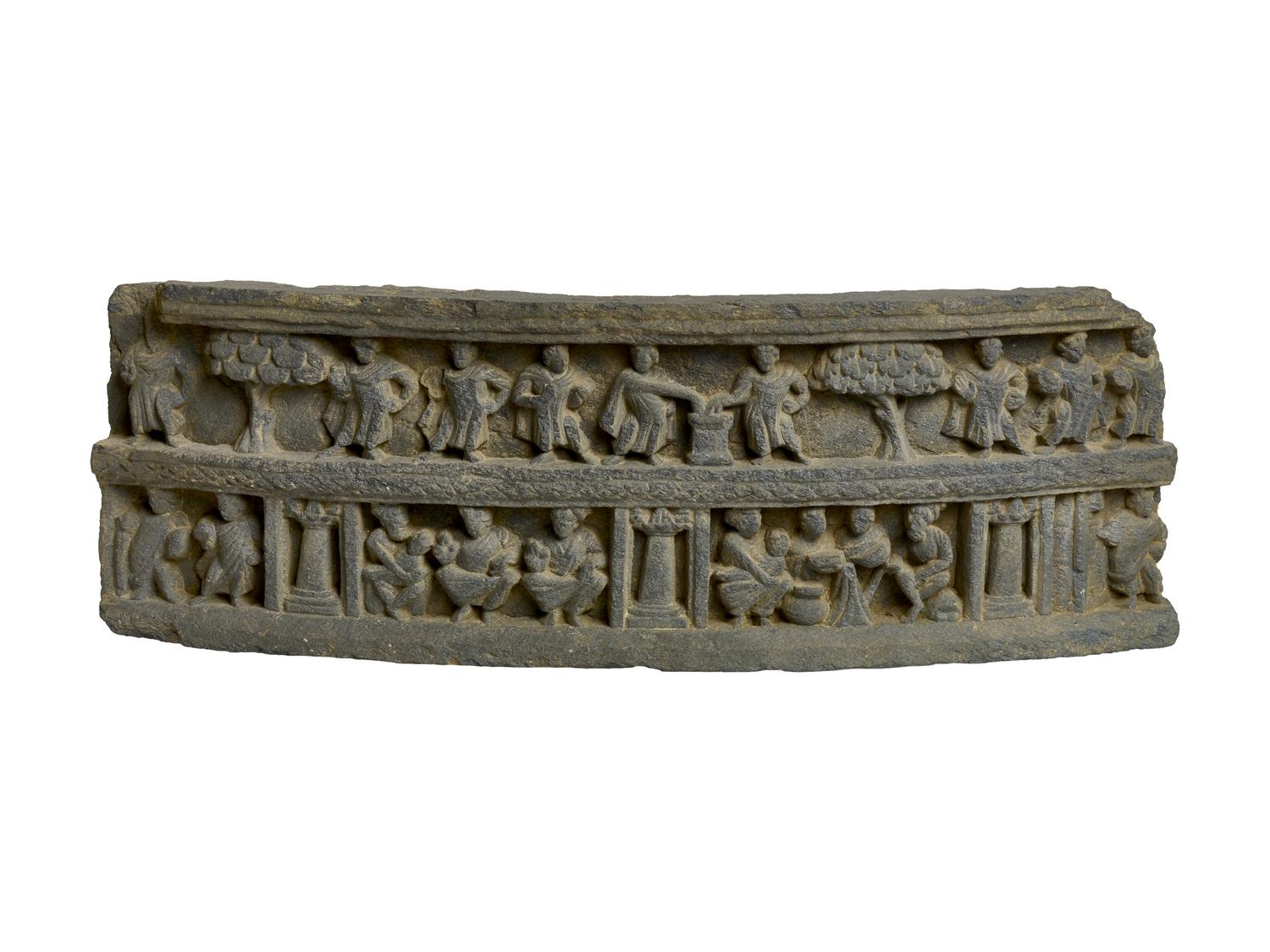 Fregio semicircolare raffigurante scene da "la predizione del destino del piccolo Sakyamuni"