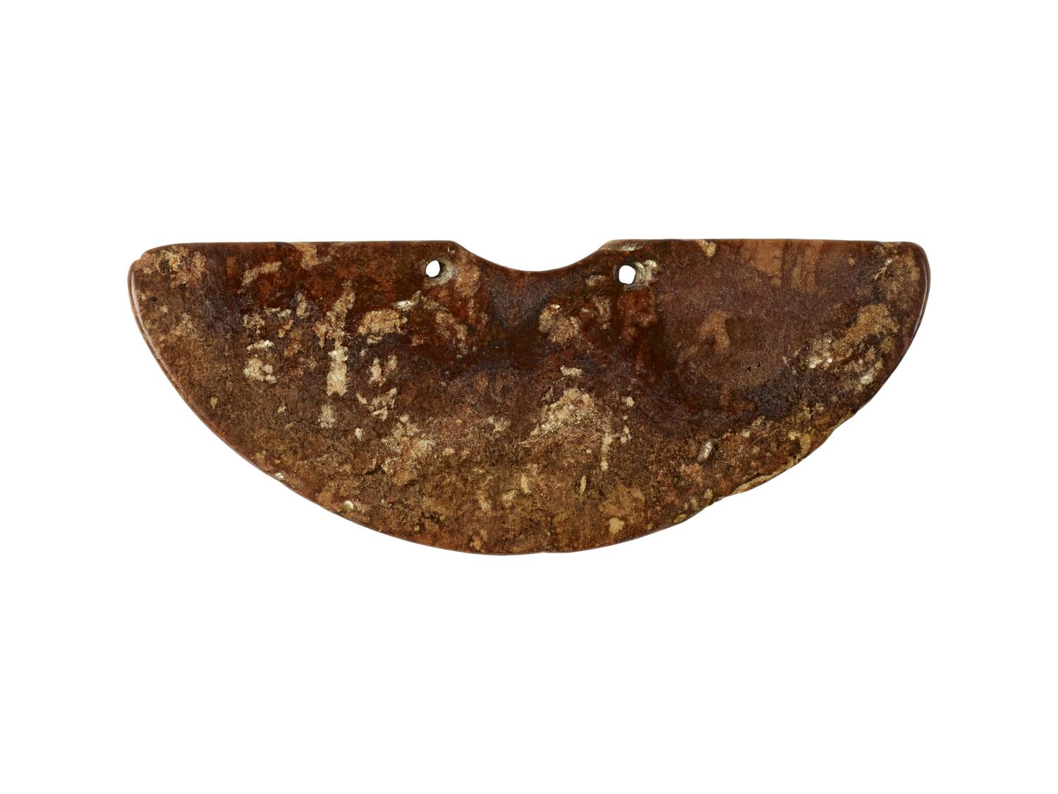 Placca ornamentale di forma semicircolare in nefrite bruna, probabilmente veniva posta sotto il naso nelle maschere funerarie