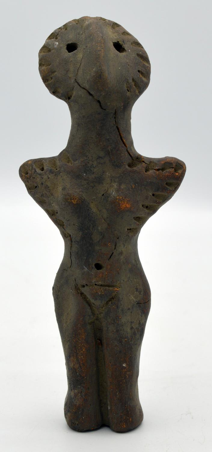 Figura femminile stilizzata, nuda, raffigurata in posizione stante, la testa adorna di un copricapo a raggiera, grandi occhi incisi, naso a becco d'uccello, seni, ombelico e pube in evidenza, braccia divaricate, gambe affiancate.