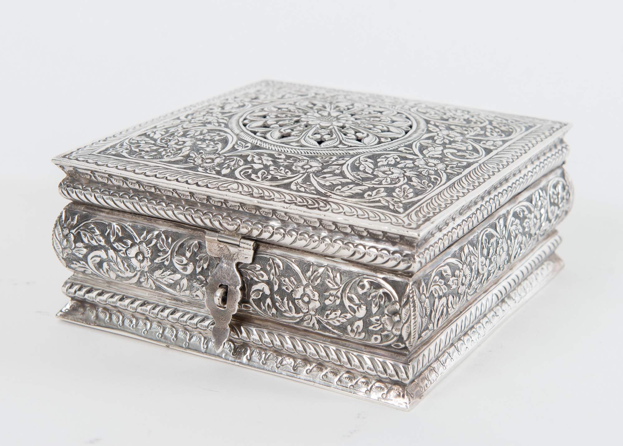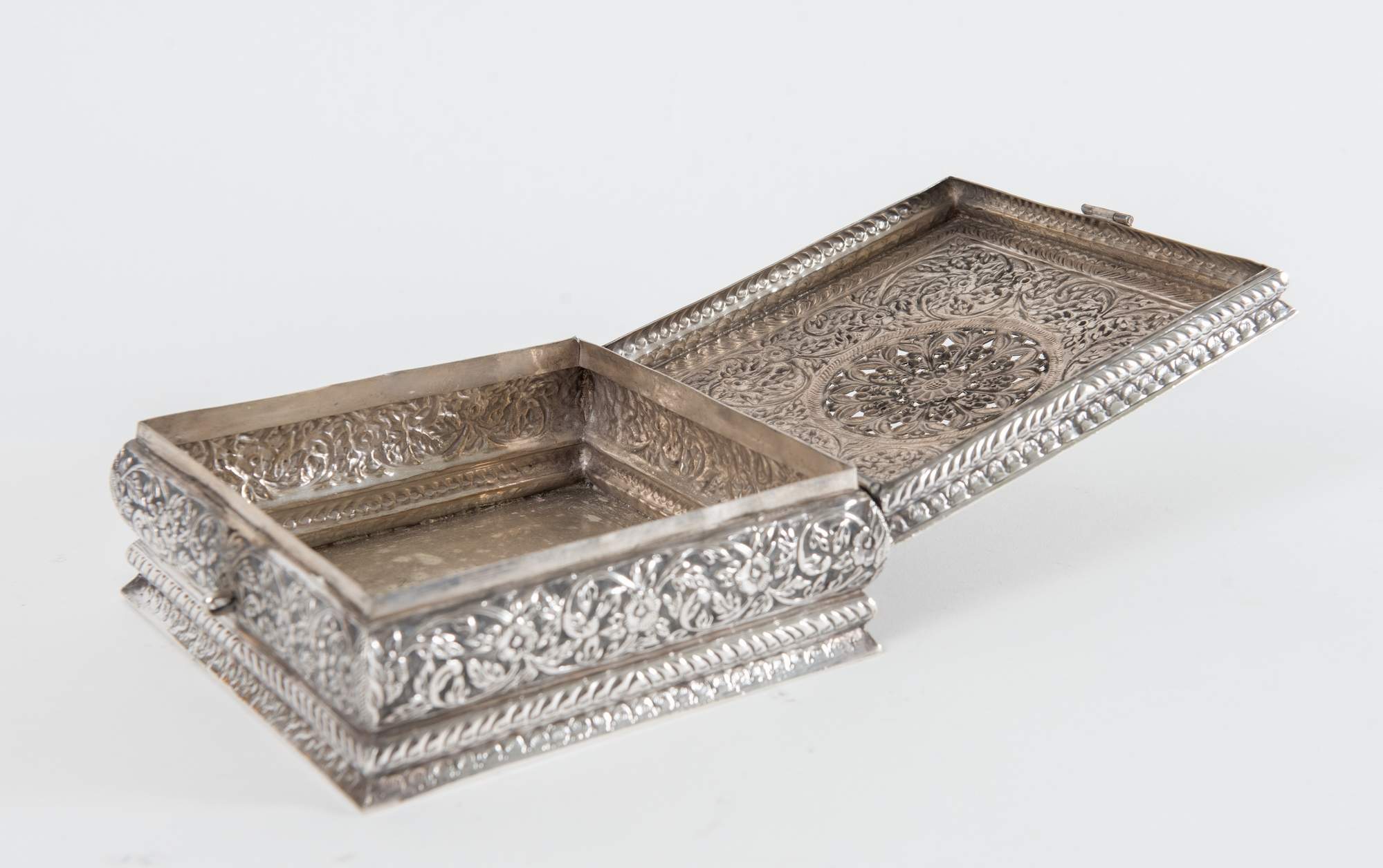 Scatola in argento 800. Sotto la base reca punzone 800. Peso: 739 gr. H. cm 7x15,5x15,3.