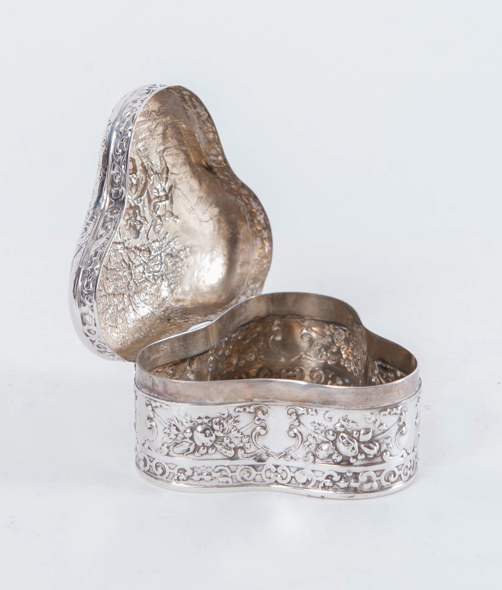 Berthold Muller, Chester, Inghilterra, 1901 (argento importato, Hanau). Scatola in argento 800. Sotto la base reca punzoni: simbolo Hanau, N, BM, leone, Simbolo di Chester, A, F. Peso: 93 gr. Cm 3,5x7,5x8,5.