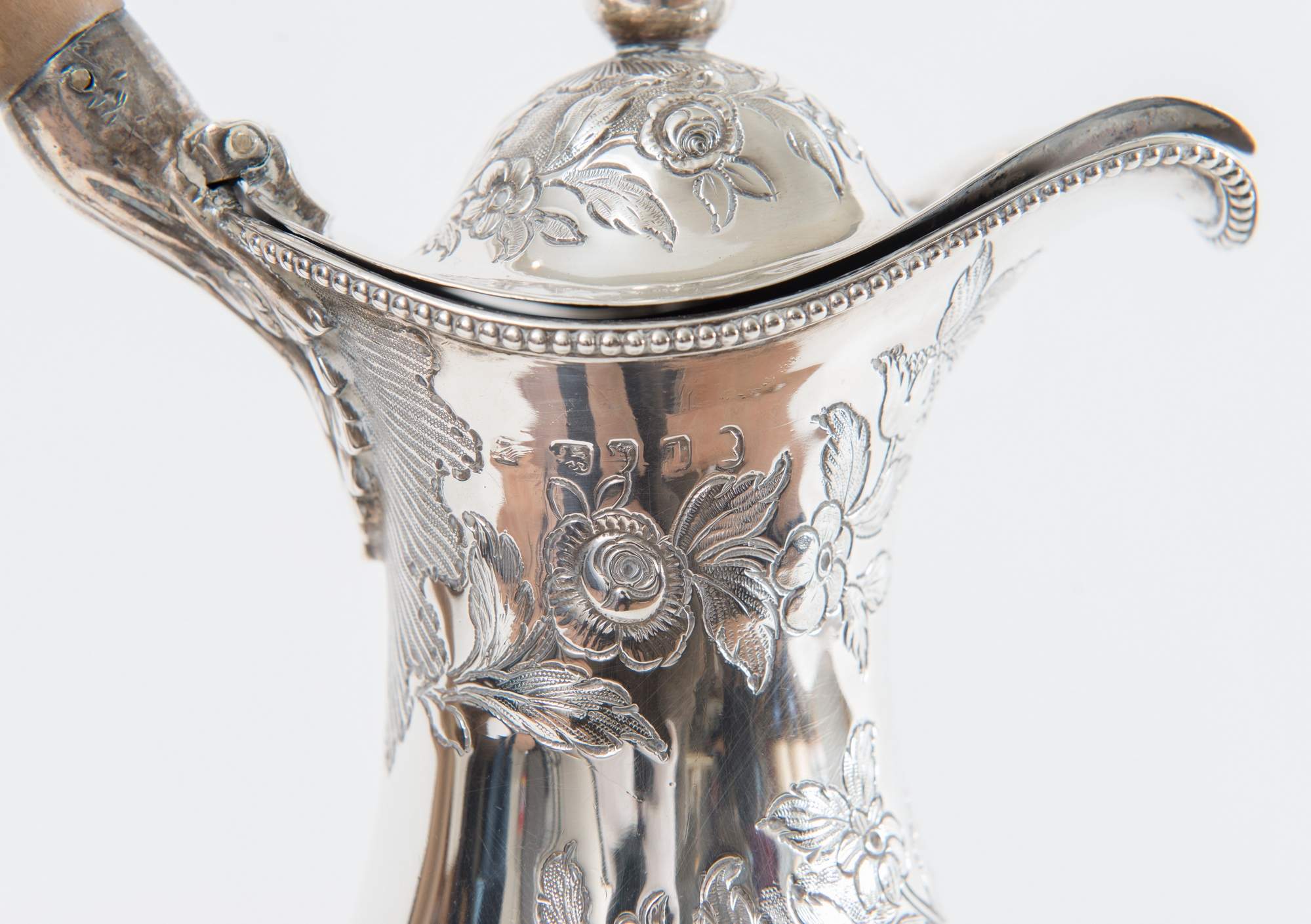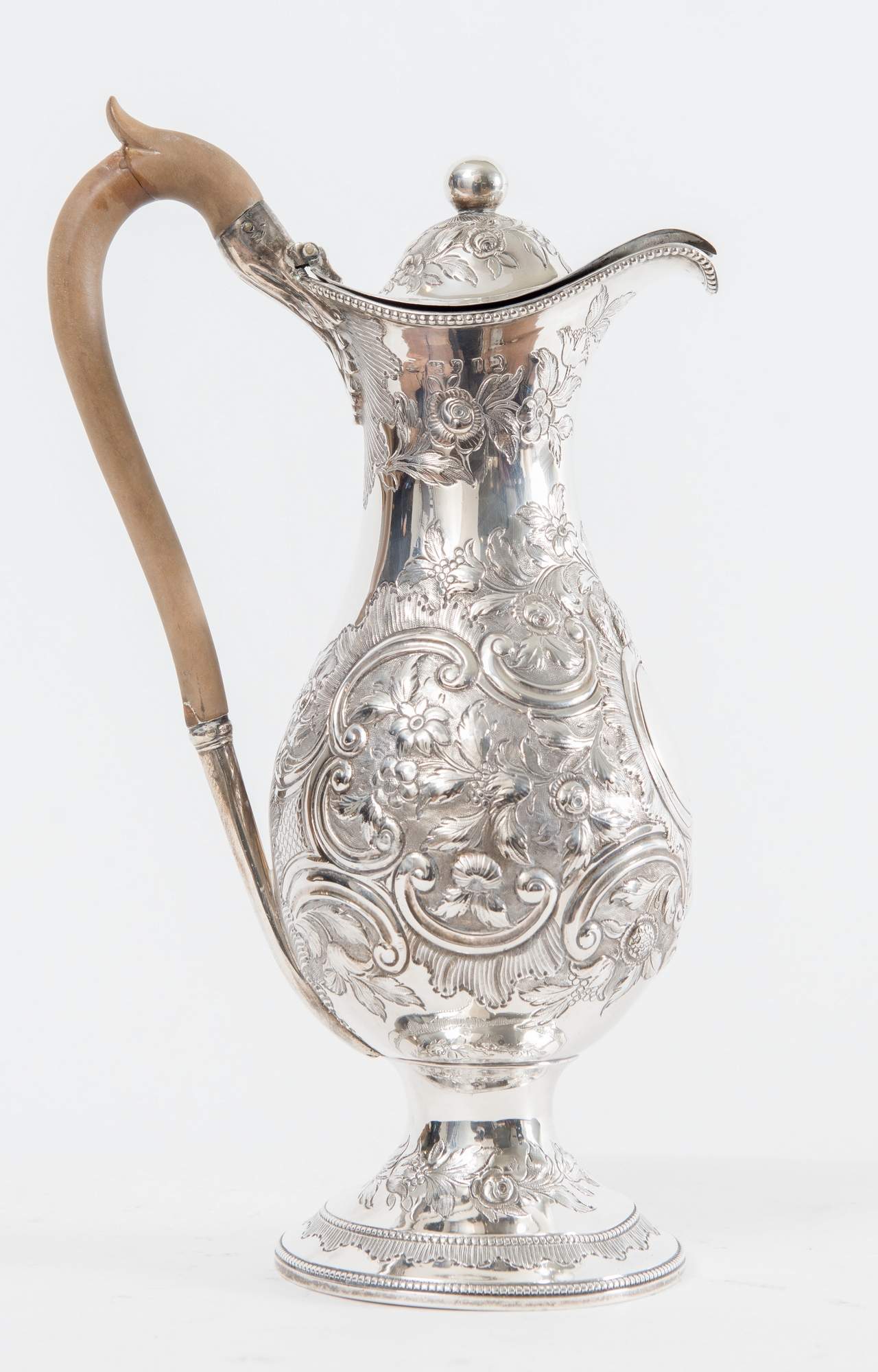 Argentiere londinese. Brocca in argento 800. sul bordo superiore reca punzoni: profilo di donna, lettera dataria L, leone passant, stemma cittadino e un punzone parzialmente leggibile. Peso: 689 gr. H. cm 30, Ø cm 11, (con manico) cm 18,5.