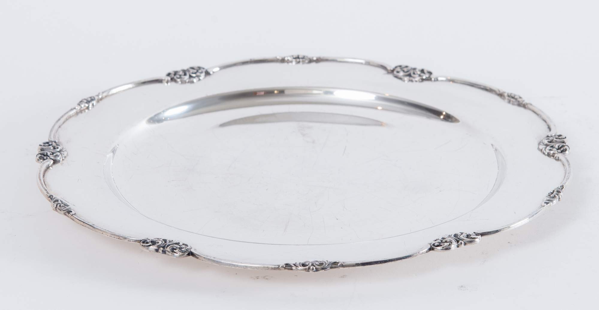 Peruggia & C., Alessandria. Grande piatto lavorato in argento 800. Sul bordo inferiore reca punzoni: 800, aquila, 376AL, GE. Ø cm 34. Peso: 798 gr.