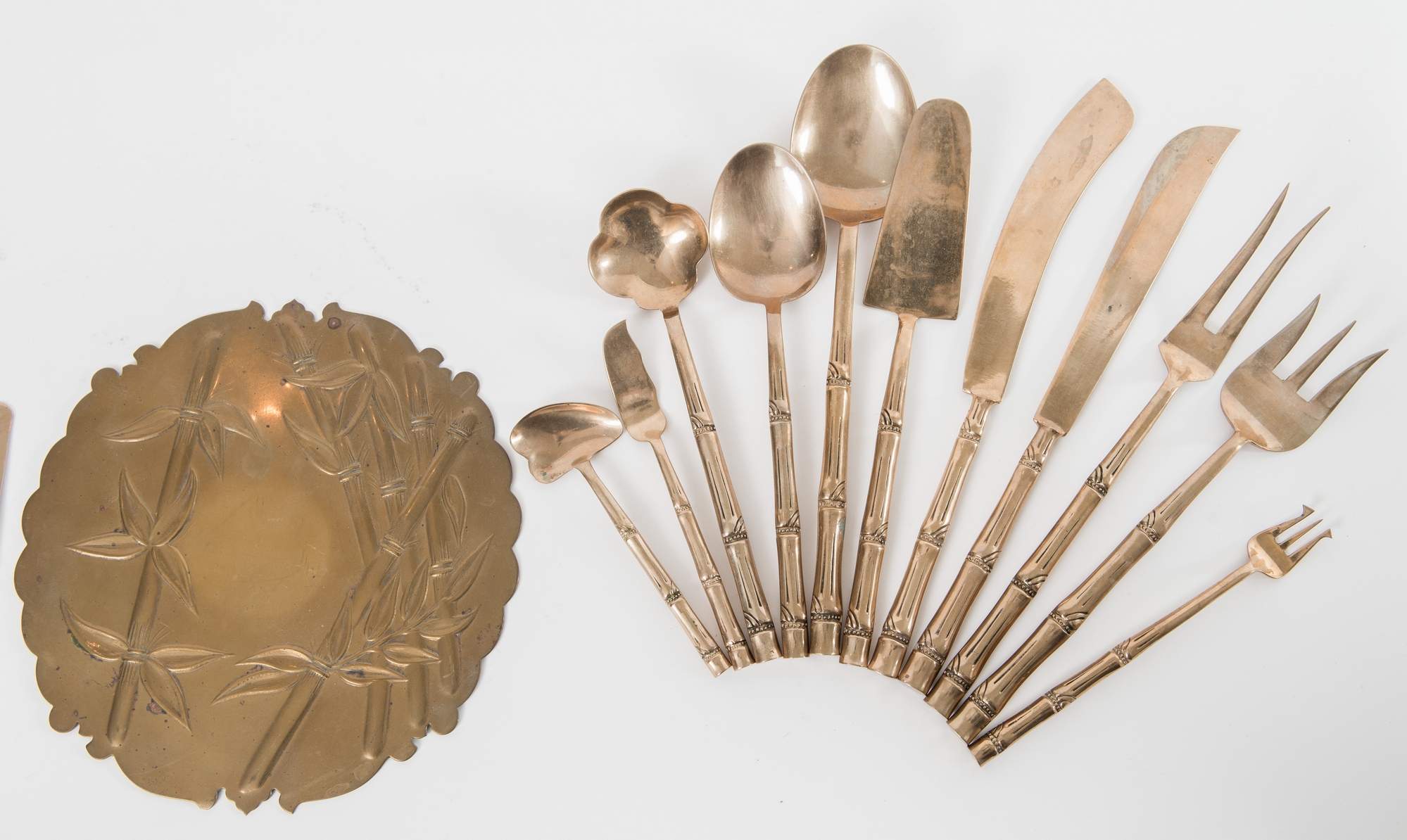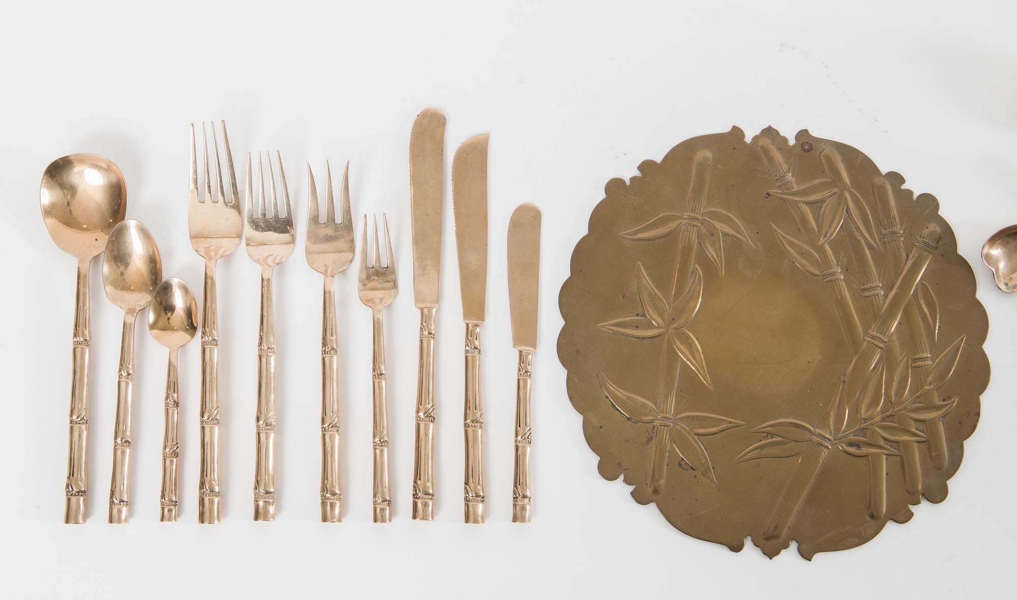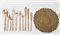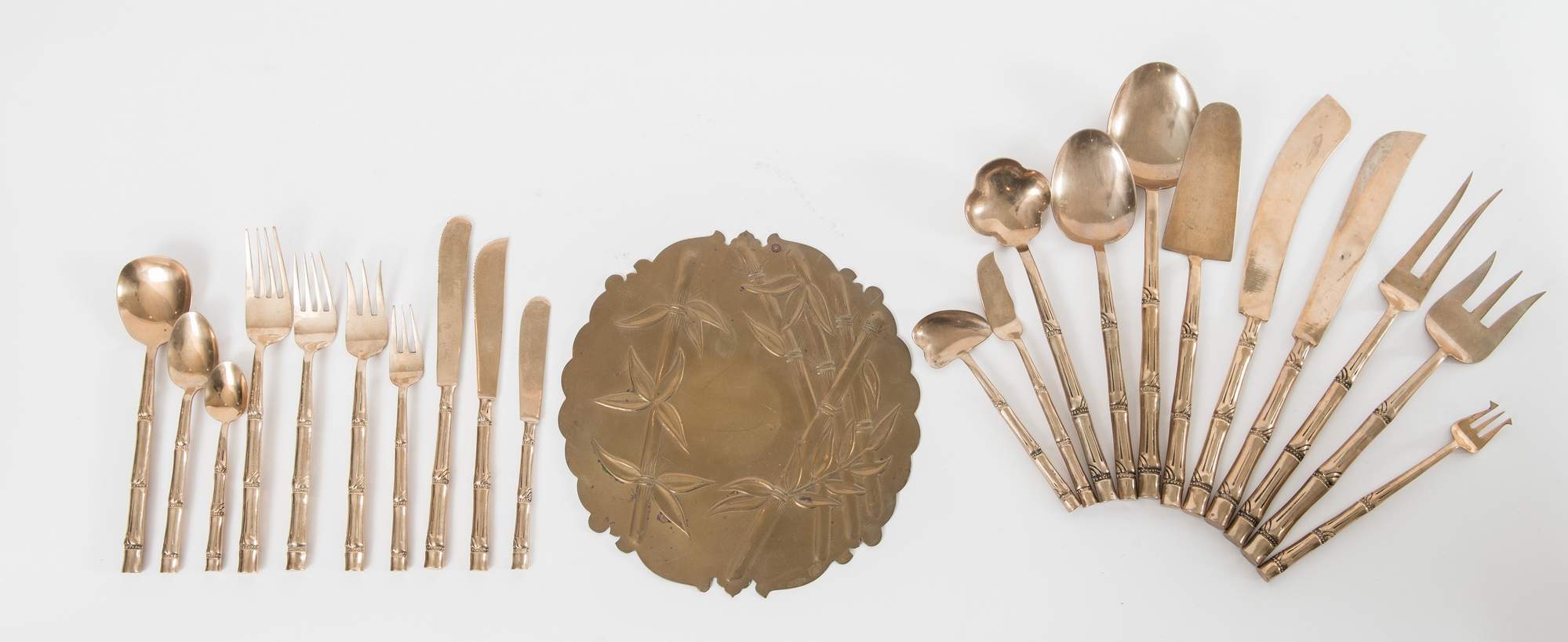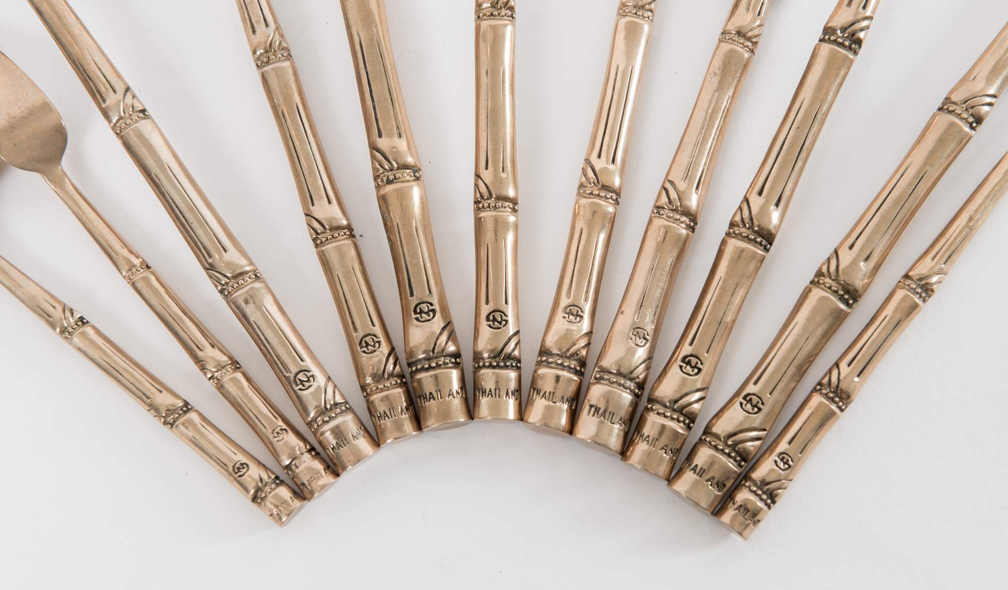 Servizio thailandese da 12 persone. Lotto composto da 12 coltelli, 12 coltelli da pesce, 12 coltelli da dessert, 12 forchette da primo, 12 forchette da secondo, 12 forchette da pesce, 11 forchette da dessert, 12 cucchiaini, 12 cucchiai, 11 cucchiaini da latte, 11 cucchiai da caffè, 12 posate da servizio, due sottopentola.
