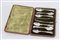 JOSHUA MAXFIELD & SONS, London & Sheffield, Inghilterra. Servizio di sei cucchiaini e prendizollette in electroplated silver entro scatola originale in velluto verde. Sul retro recano punzoni: M&S, animale, S coronata, EP.