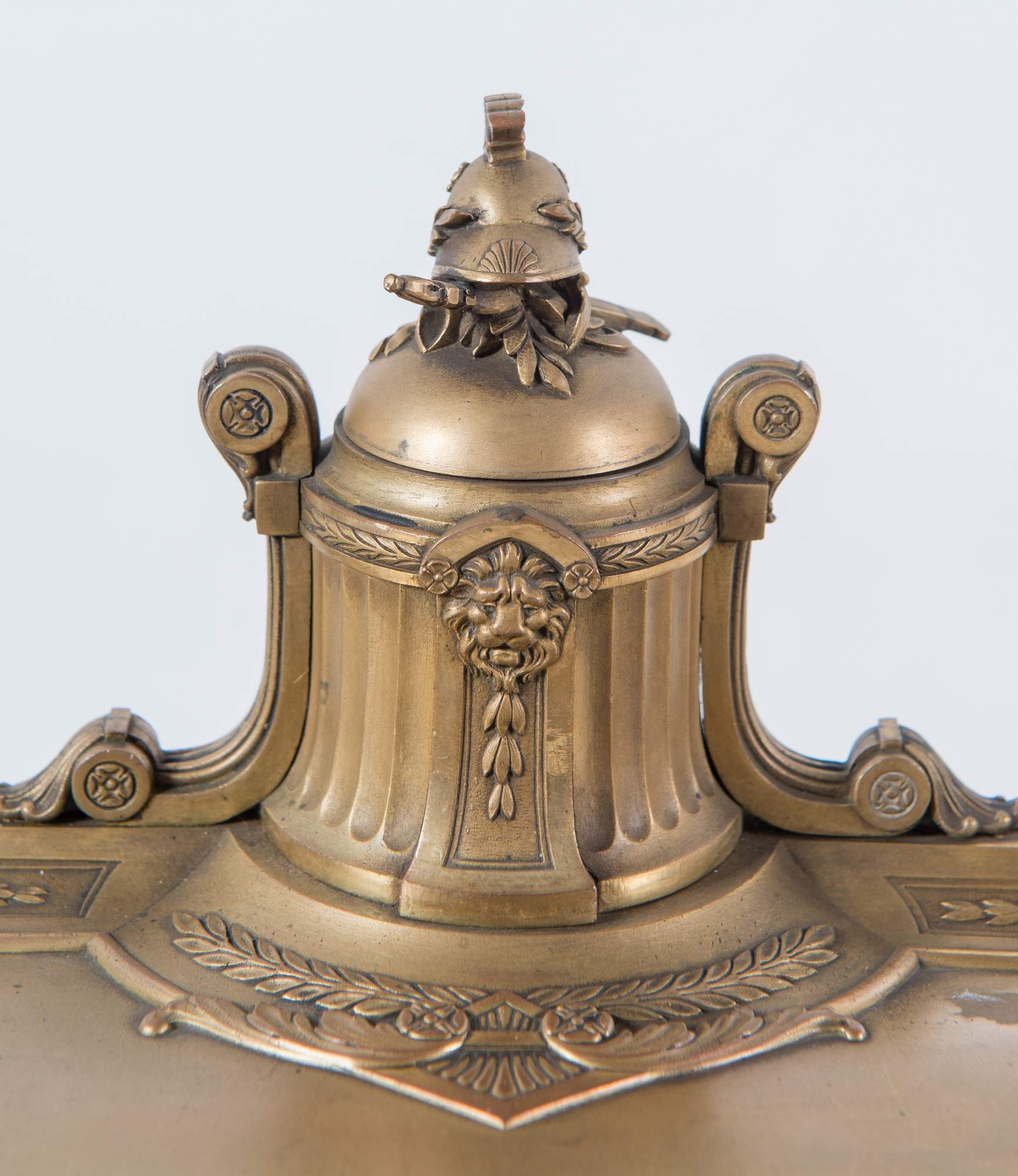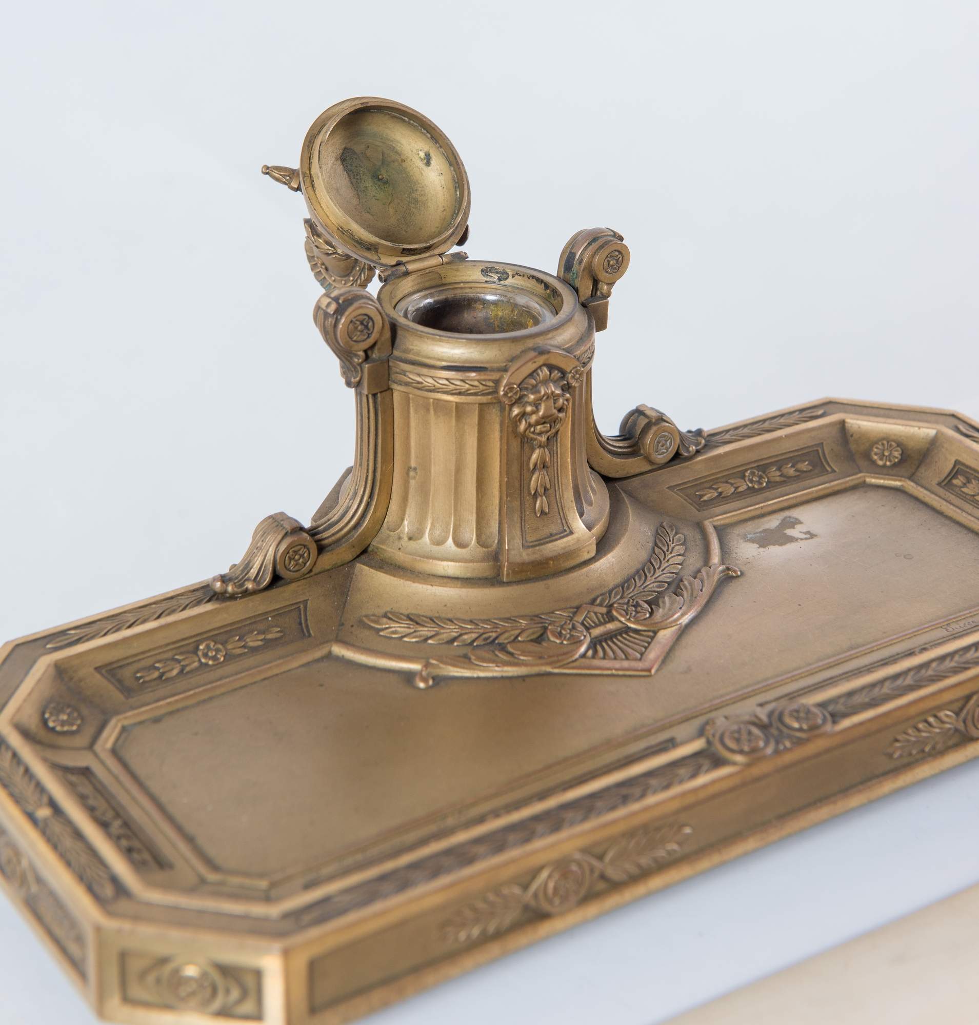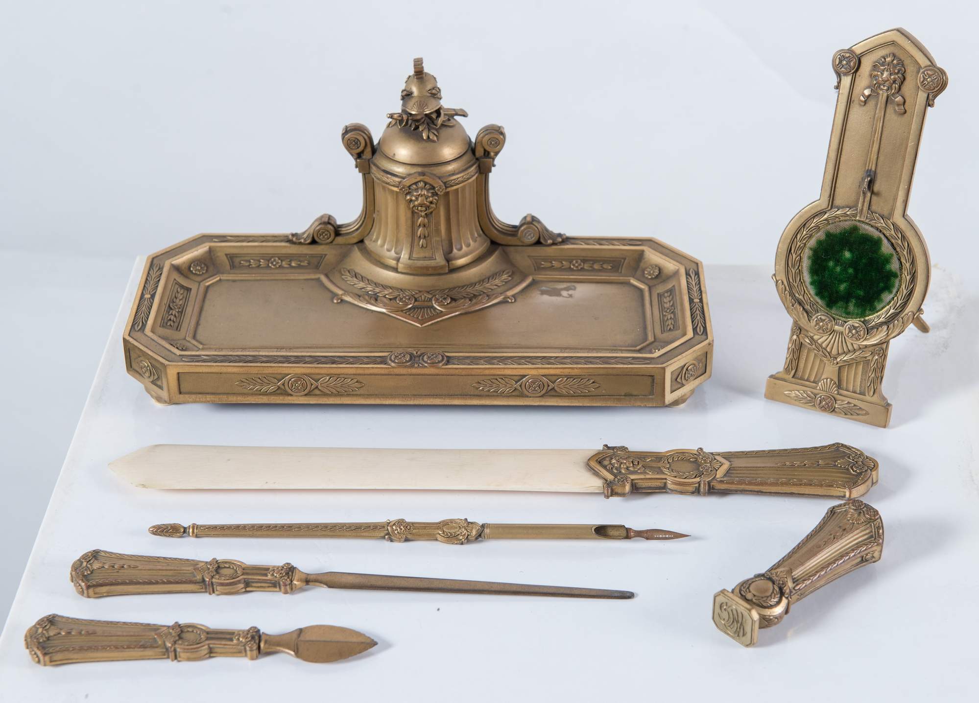 OCTAVE LELIEVRE, Francia, XIX secolo. Set da scrivania in bronzo dorato.Composto da un tagliacarte, un sigillo, un coltellino da carta, una penna e una spatola, un vassoio, un porta orologio da taschino. Ogni elemento reca firma O. Lelievre. Vassoio: cm 12,5x25,5x14; tagliacarte: cm 31,5x3,7; coltellino da carta: H. cm 12,5; spatola: H. cm 21; sigillo: H. cm 8 cm; penna: H. cm 21,5; porta orologio da taschino: cm 16,8x8.