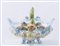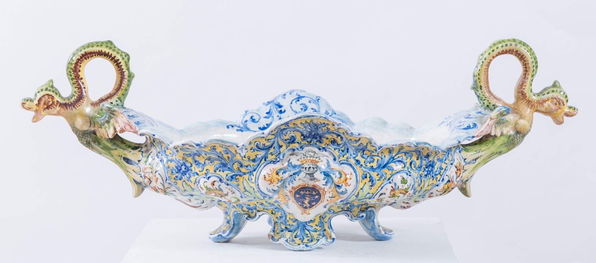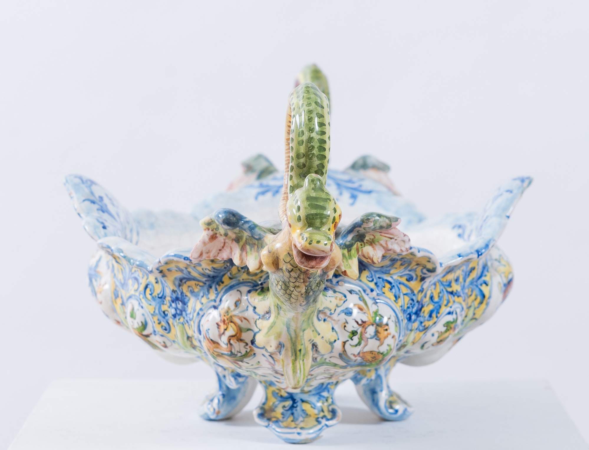 ANGELO MINGHETTI, Bologna, XX secolo. Centrotavola in ceramica policroma con prese a guisa di drago. Cm 19x55x26. Sotto la base reca sigla AM.