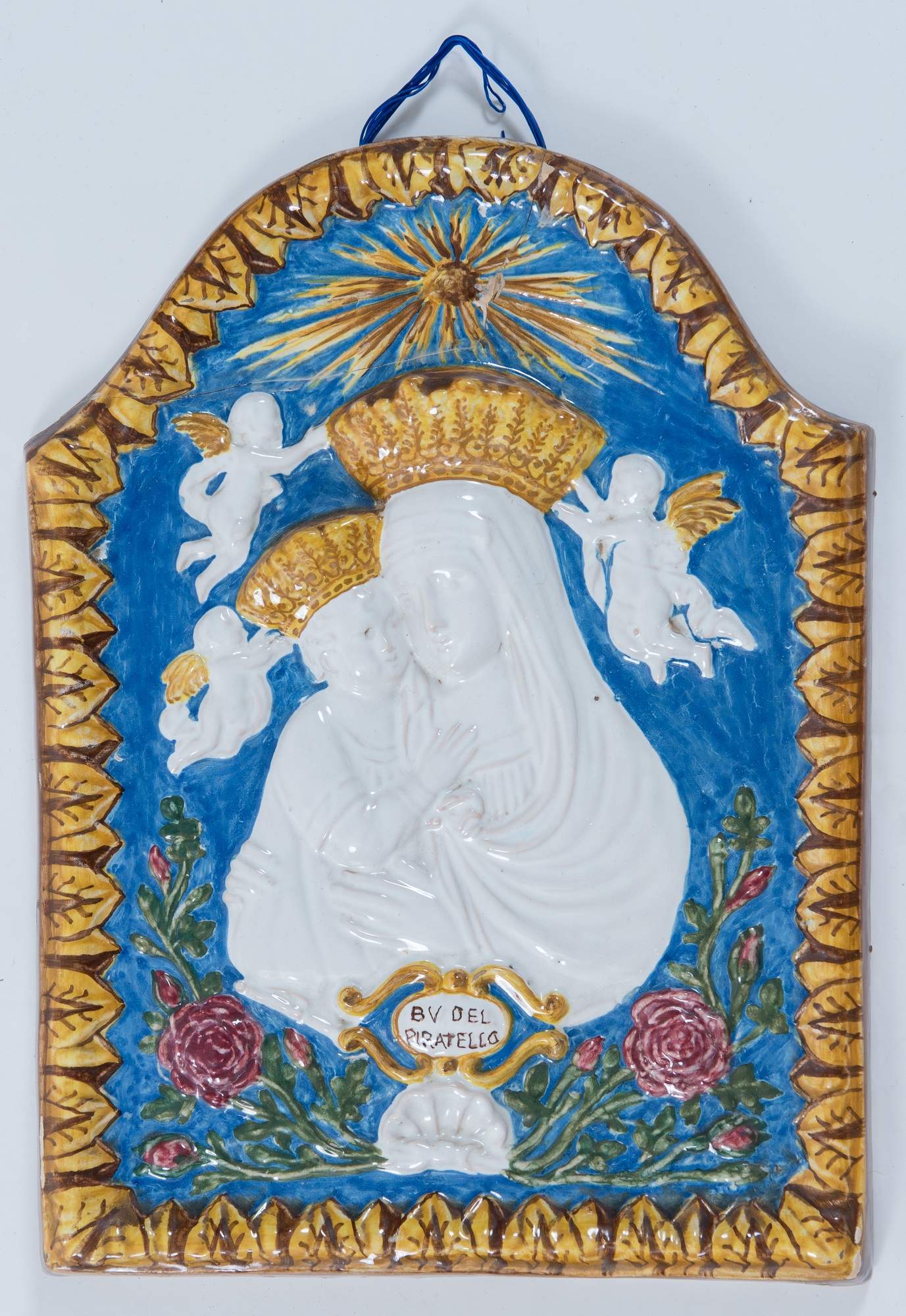 Madonna, placca devozionale in maiolica. Imola, XX secolo. Cm 40x30. (difetti)