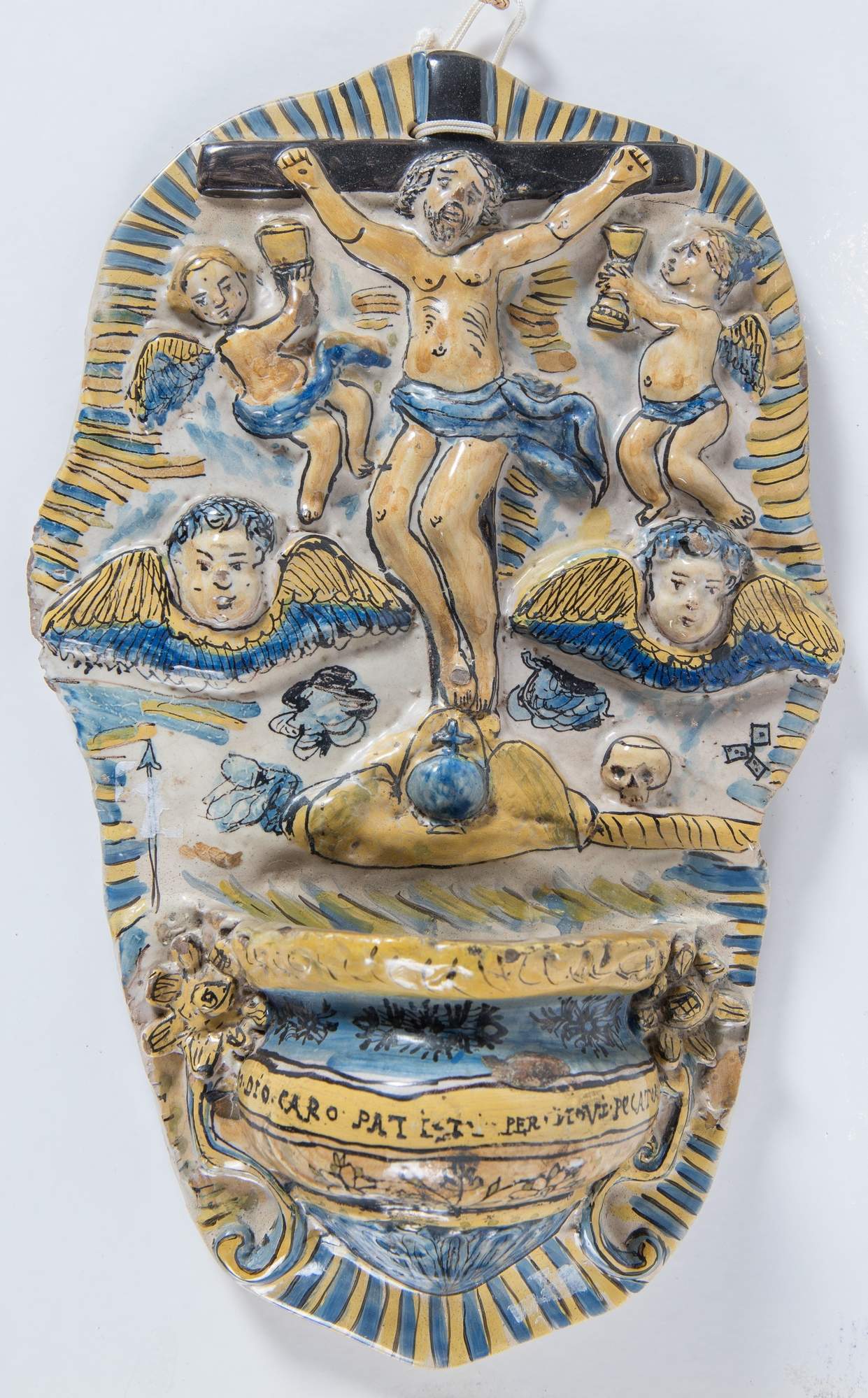 Acquasantiera in maiolica invetriata. Italia meridionale?, inizi XVIII secolo. Rappresenta Cristo in croce con putti e cherubini, nei toni del azzurro, del giallo e del bianco. Cm 33,5x20,8x7. (lievi difetti)