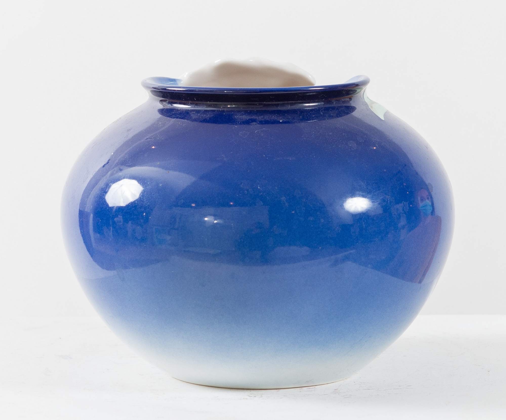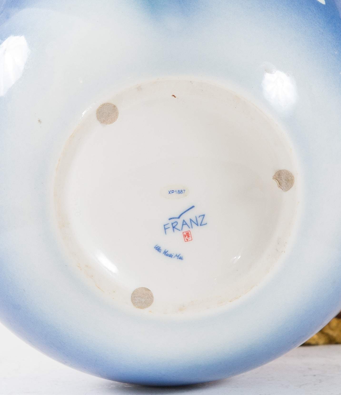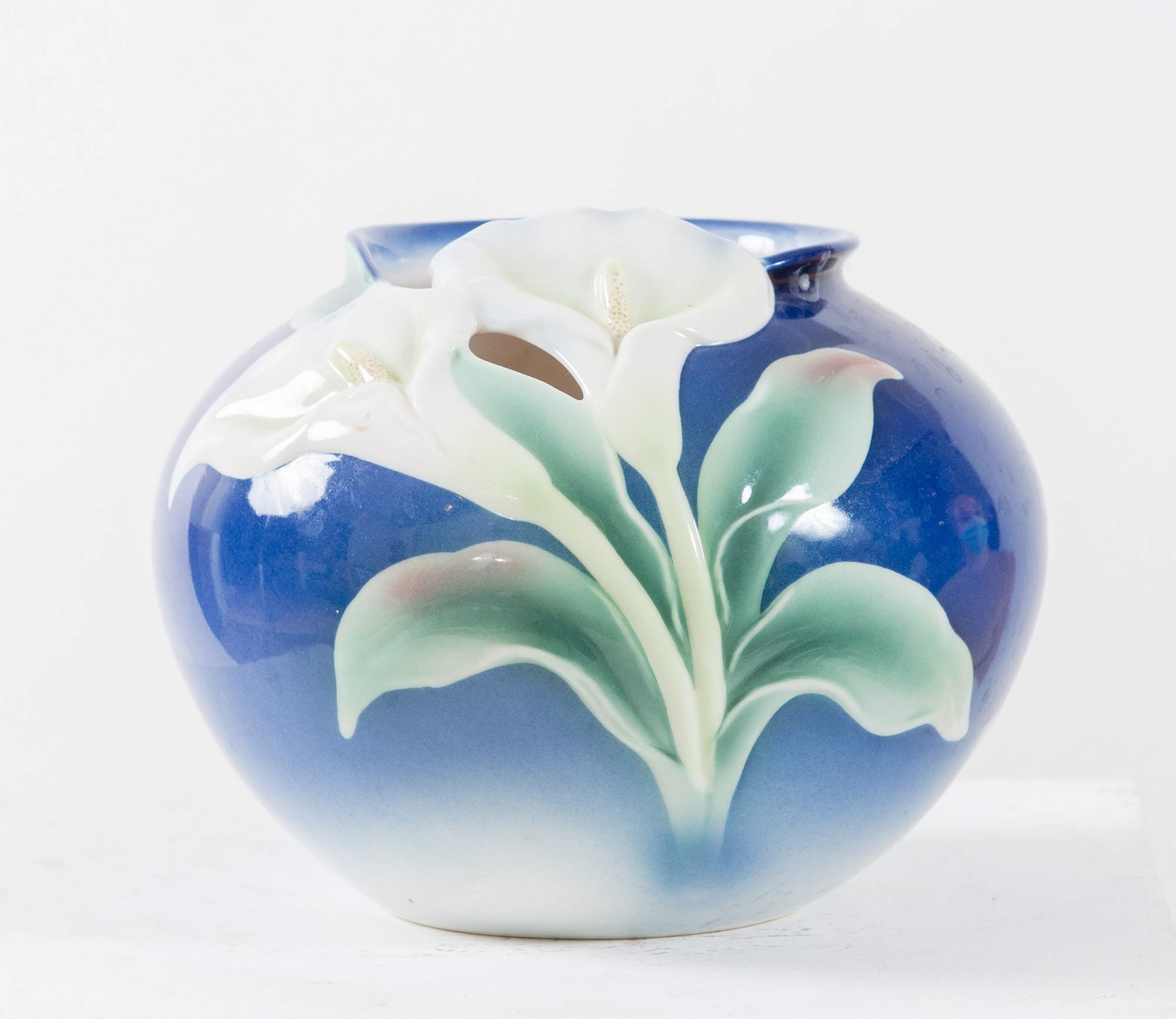 Vaso in porcellana blu. Seconda metà del XX secolo. Reca calle dipinta con fiori a rilievo. Firmato sotto la base FRANZ. H. Cm 14,5, Ø 20.