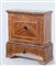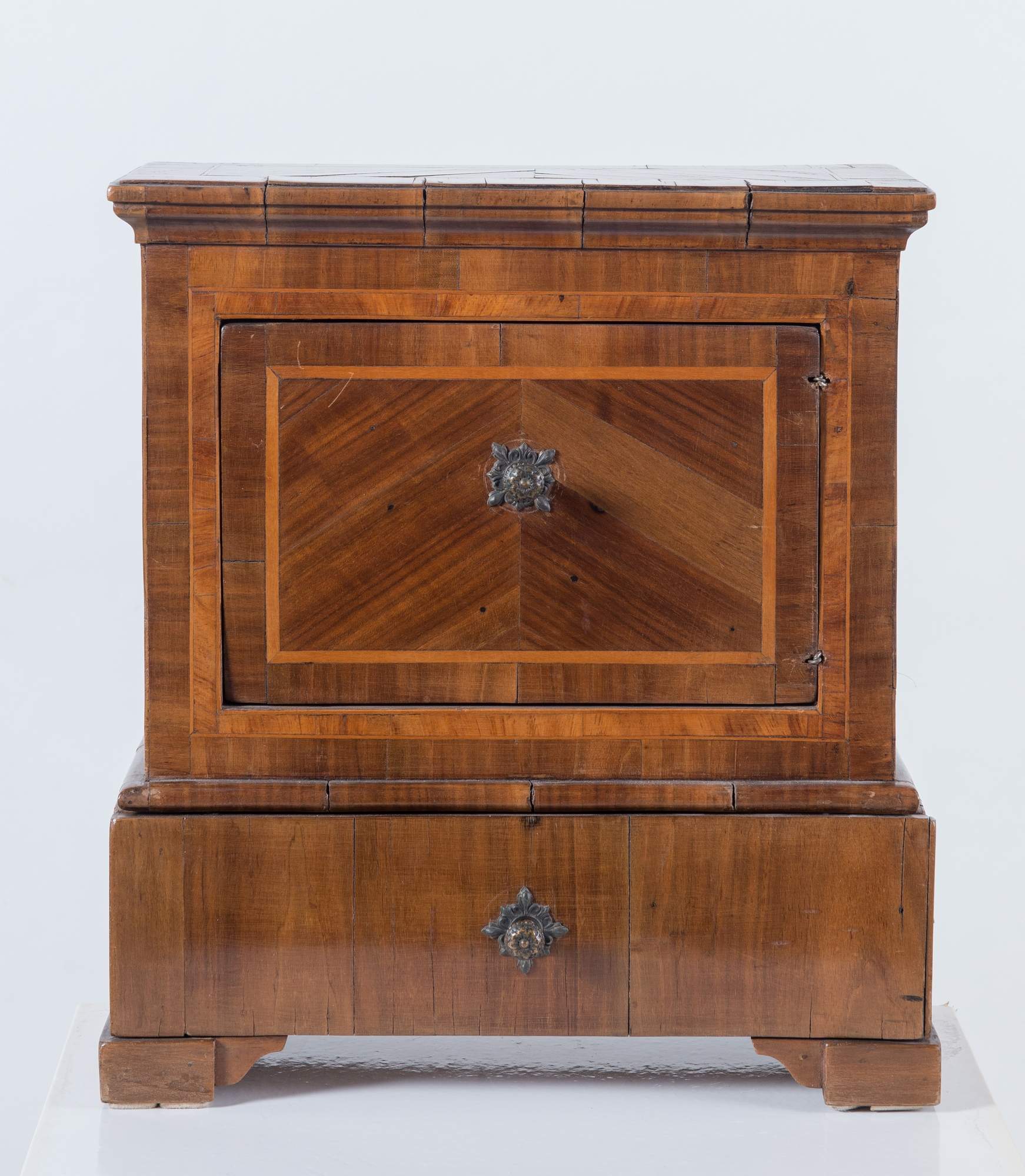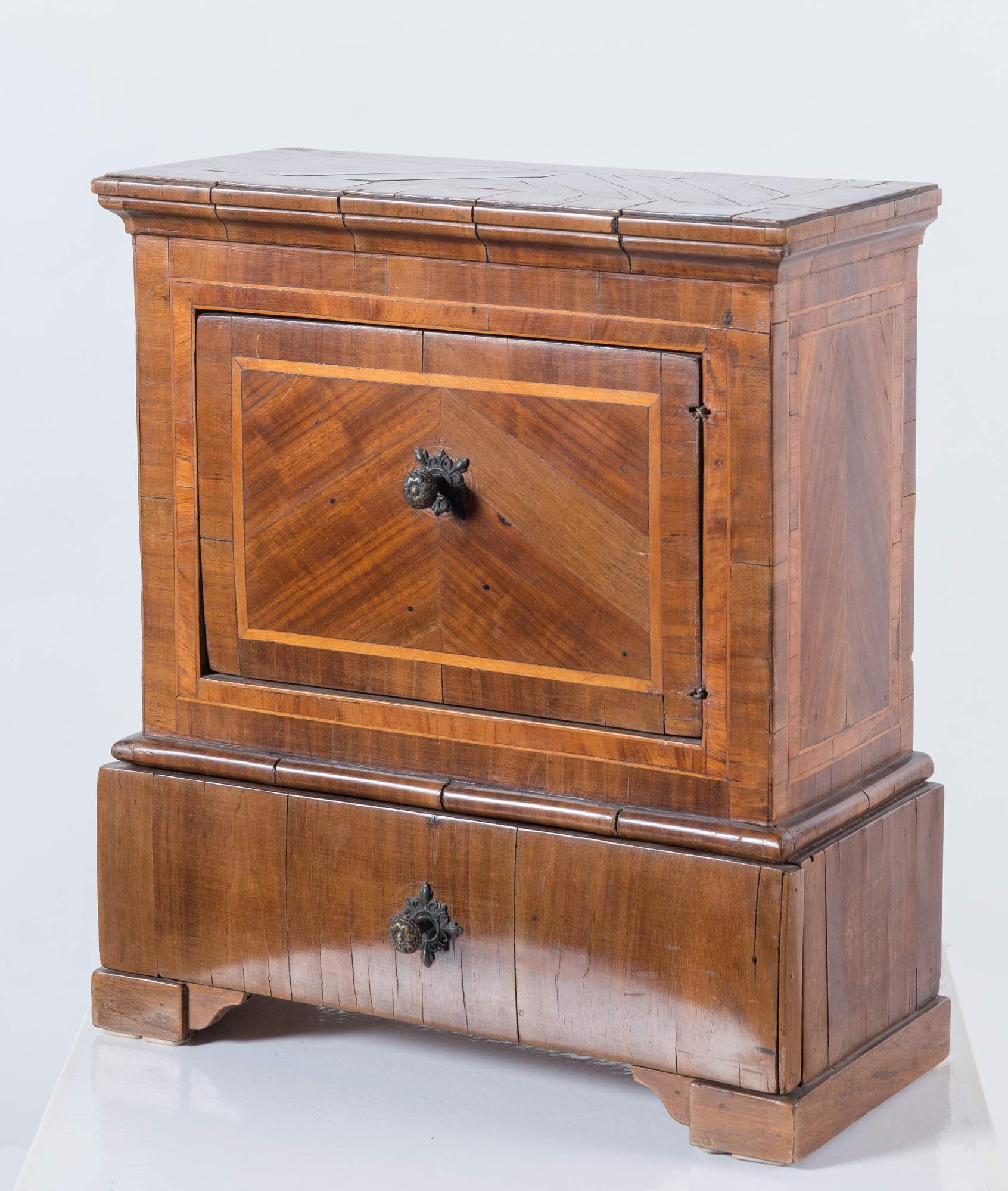 Piccolo mobiletto da appoggio. Emilia, fine del XVIII - inizi del XIX secolo. Lastronato in noce e ciliegio, filettato in acero. Sul fronte reca cassetto e sportello. Cm 37,5x34,3x15.