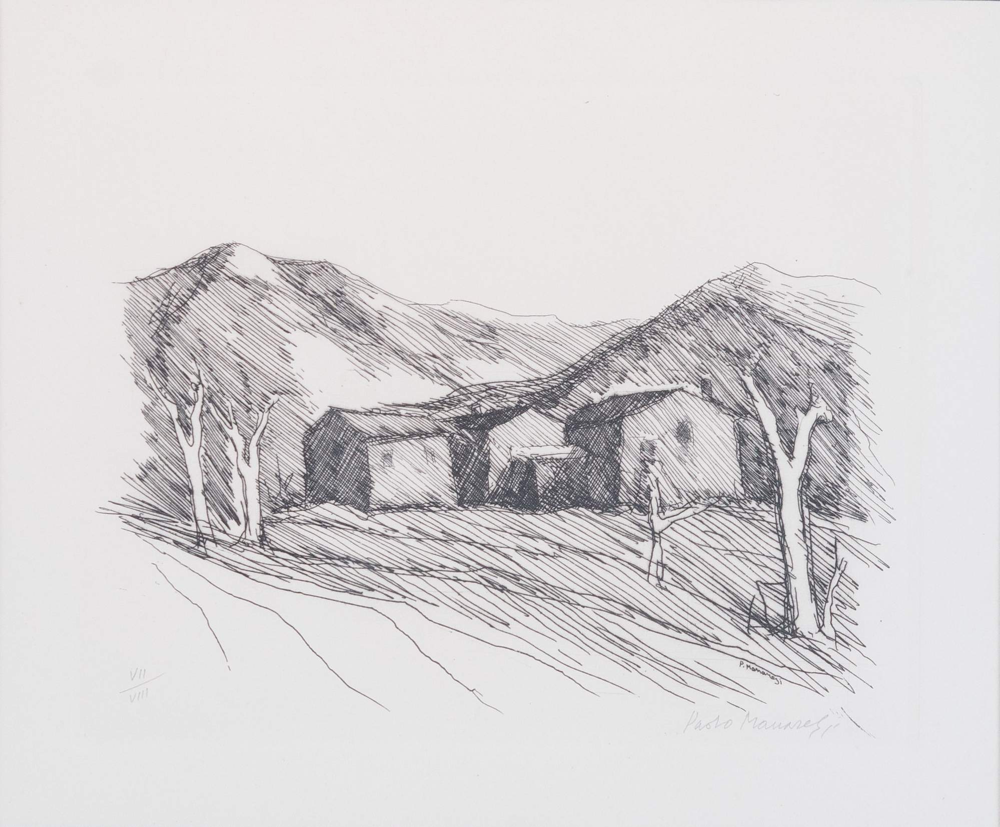 PAOLO MANARESI (Bologna 1908 – 1991) "Paesaggio". Incisione su carta. Lastra: cm 20x25. Opera firmata in basso a destra Paolo Manaresi. Reca in basso a sinistra numeri di tiratura in lettere romane VII/VIII.