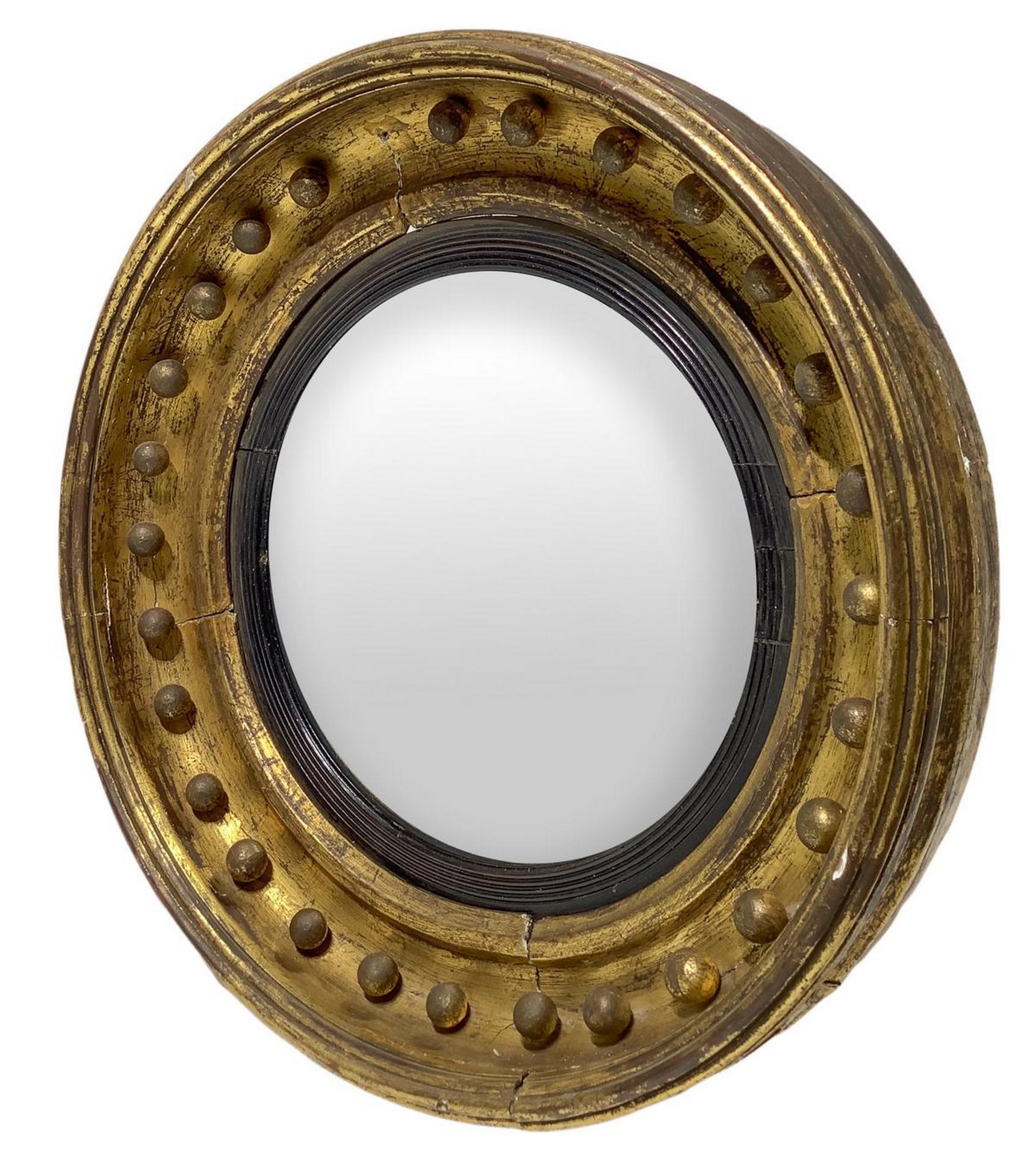 Specchio rotondo convesso con cornice dorata a foglia oro, metà XIX secolo....
