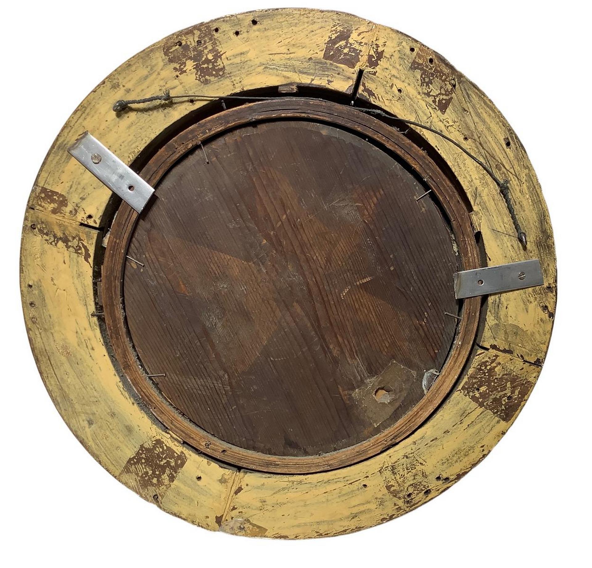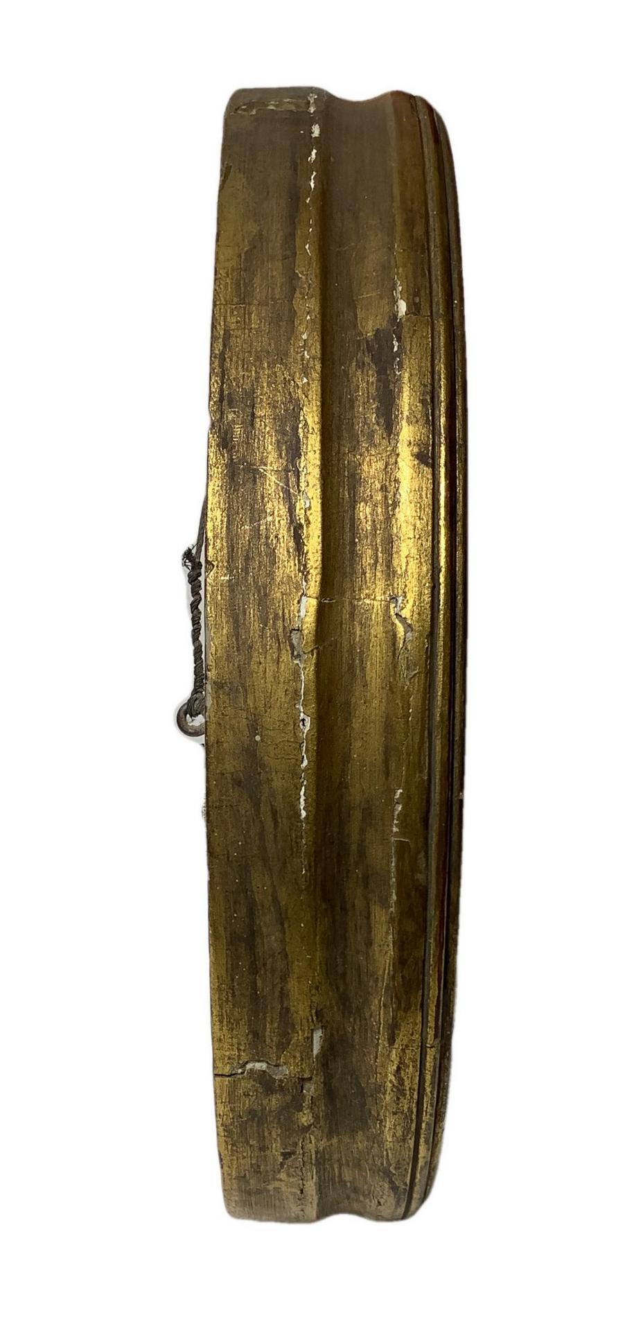 Specchio rotondo convesso con cornice dorata a foglia oro, metà XIX secolo. Diametro cm 50 cm, profondità 10.