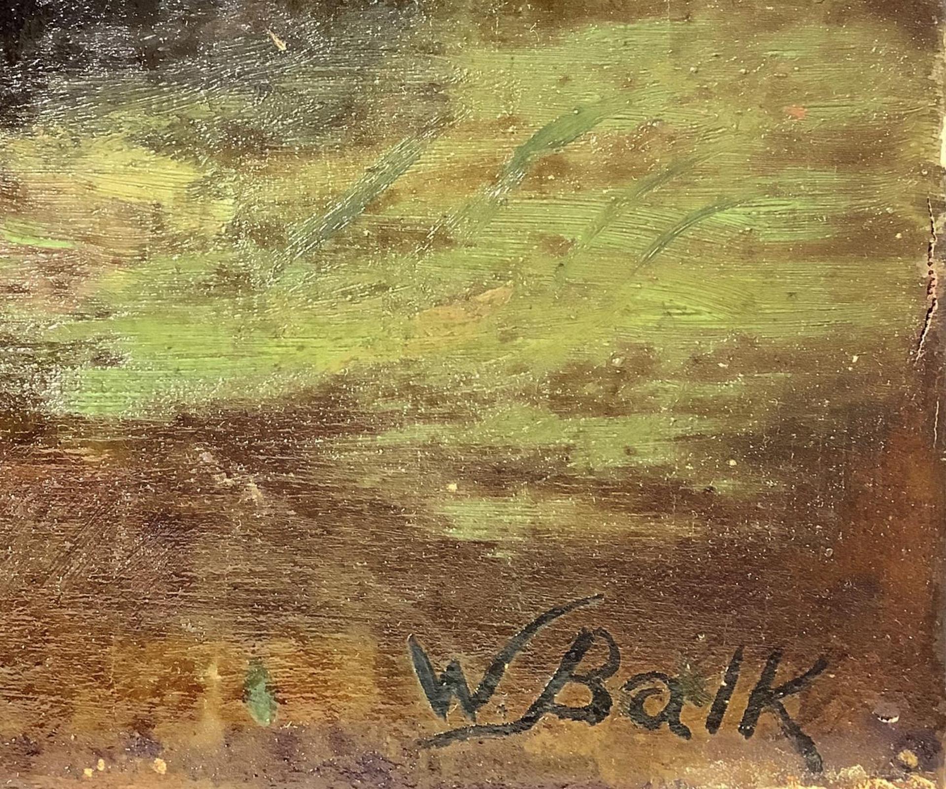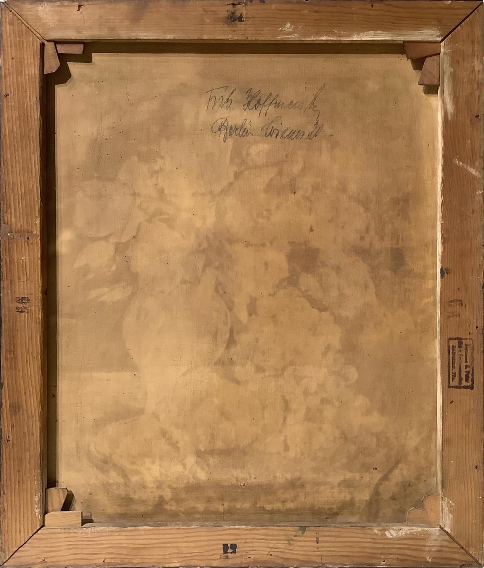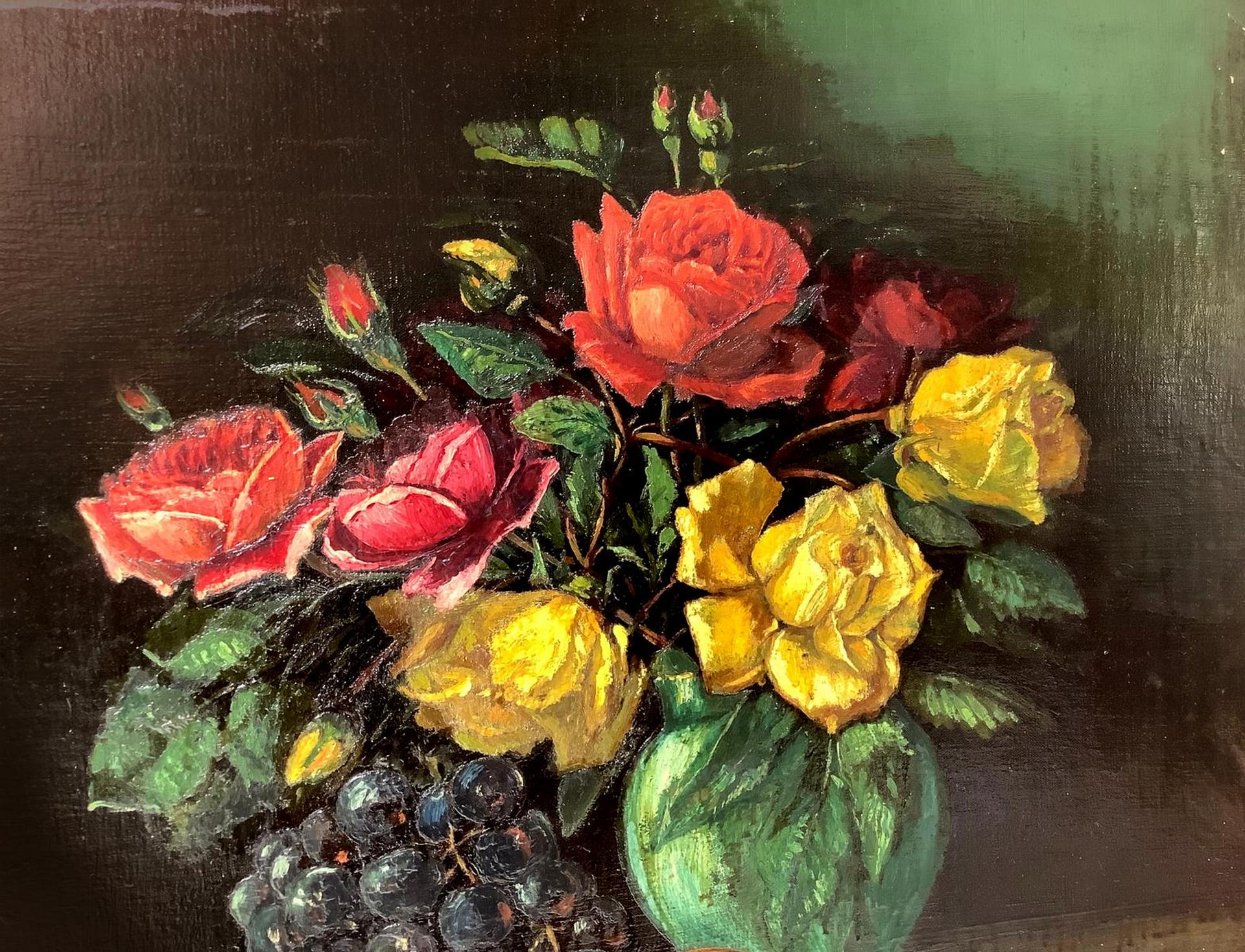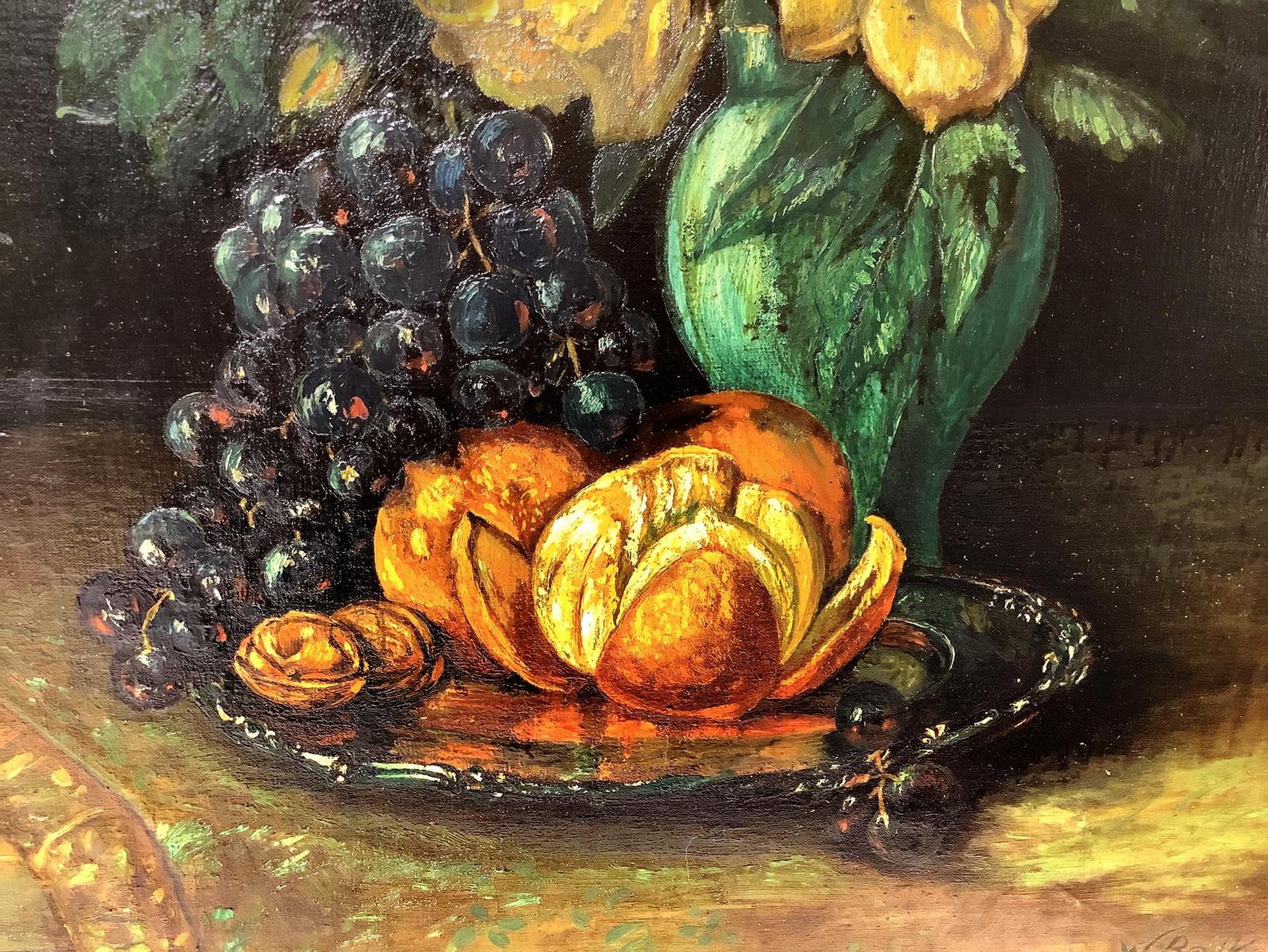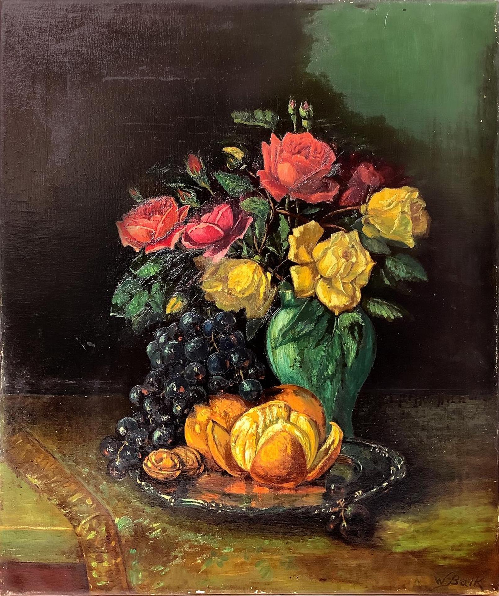 Dipinto ad olio su tela raffigurante vaso con fiori e frutta, inizi XX secolo. Cm 67x55. Firmata in basso a destra W. Balk. Senza cornice