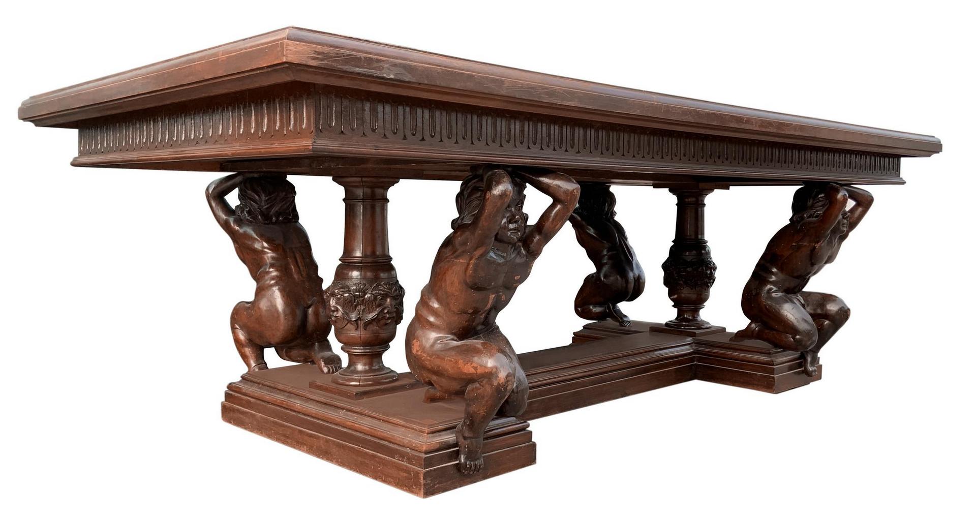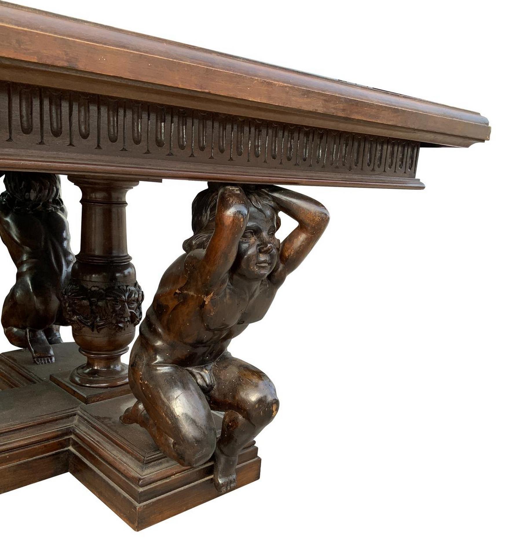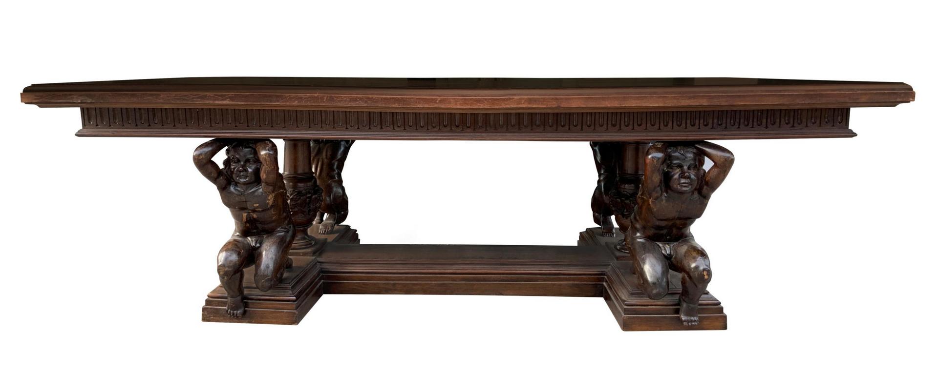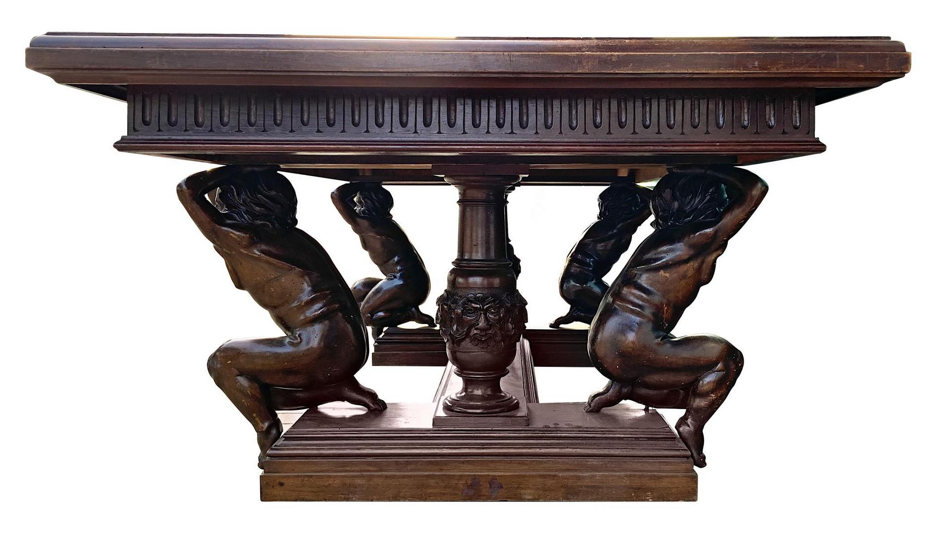 Eccezionale tavolo neorinascimentale in massello di noce, XIX secolo, con piano sorretto da 4 sculture raffiguranti giovani putti, quali atlantidi di sostegno. Al centro di ogni lato balaustre scolpite con grottesche. H cm 80x235x120.