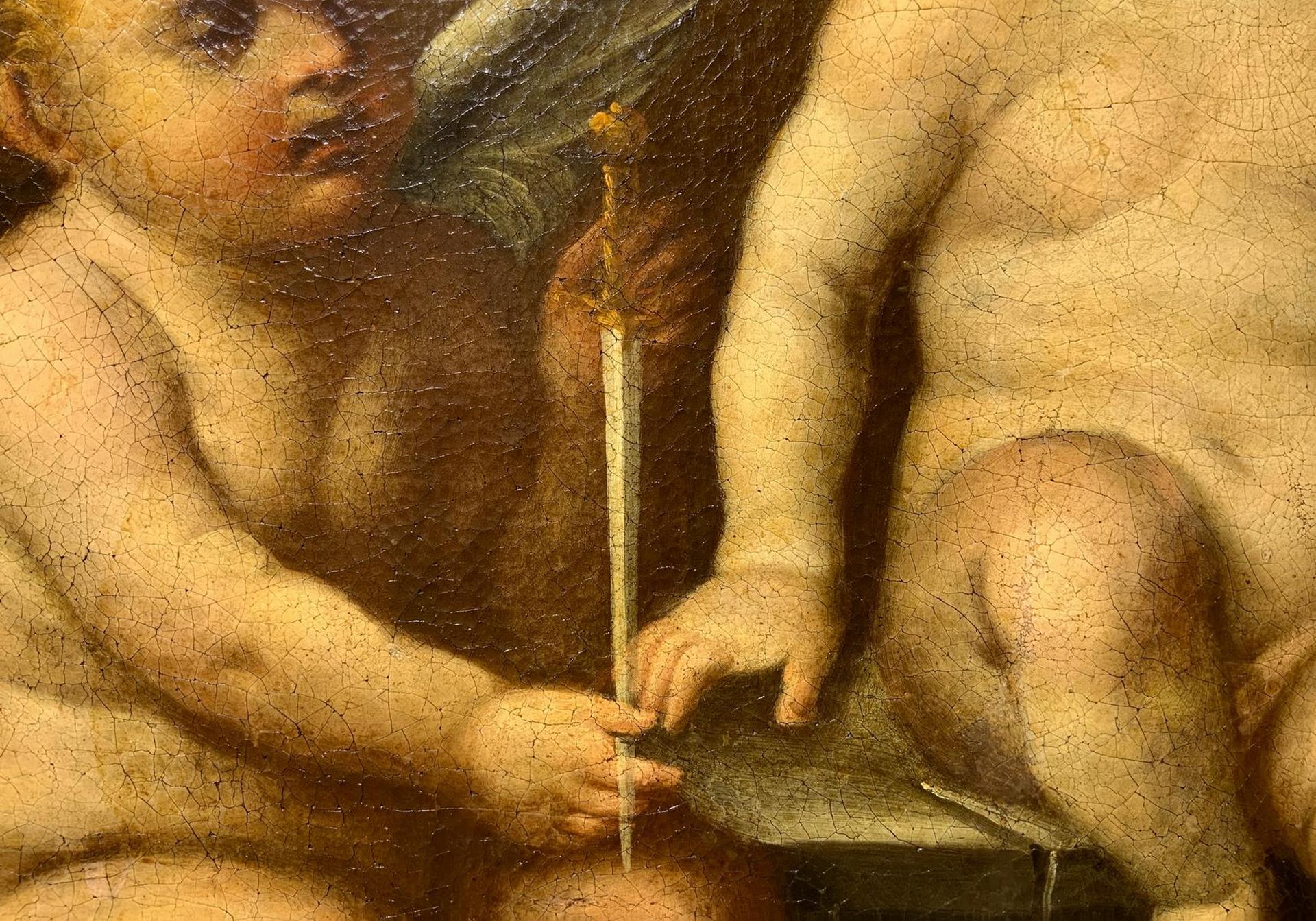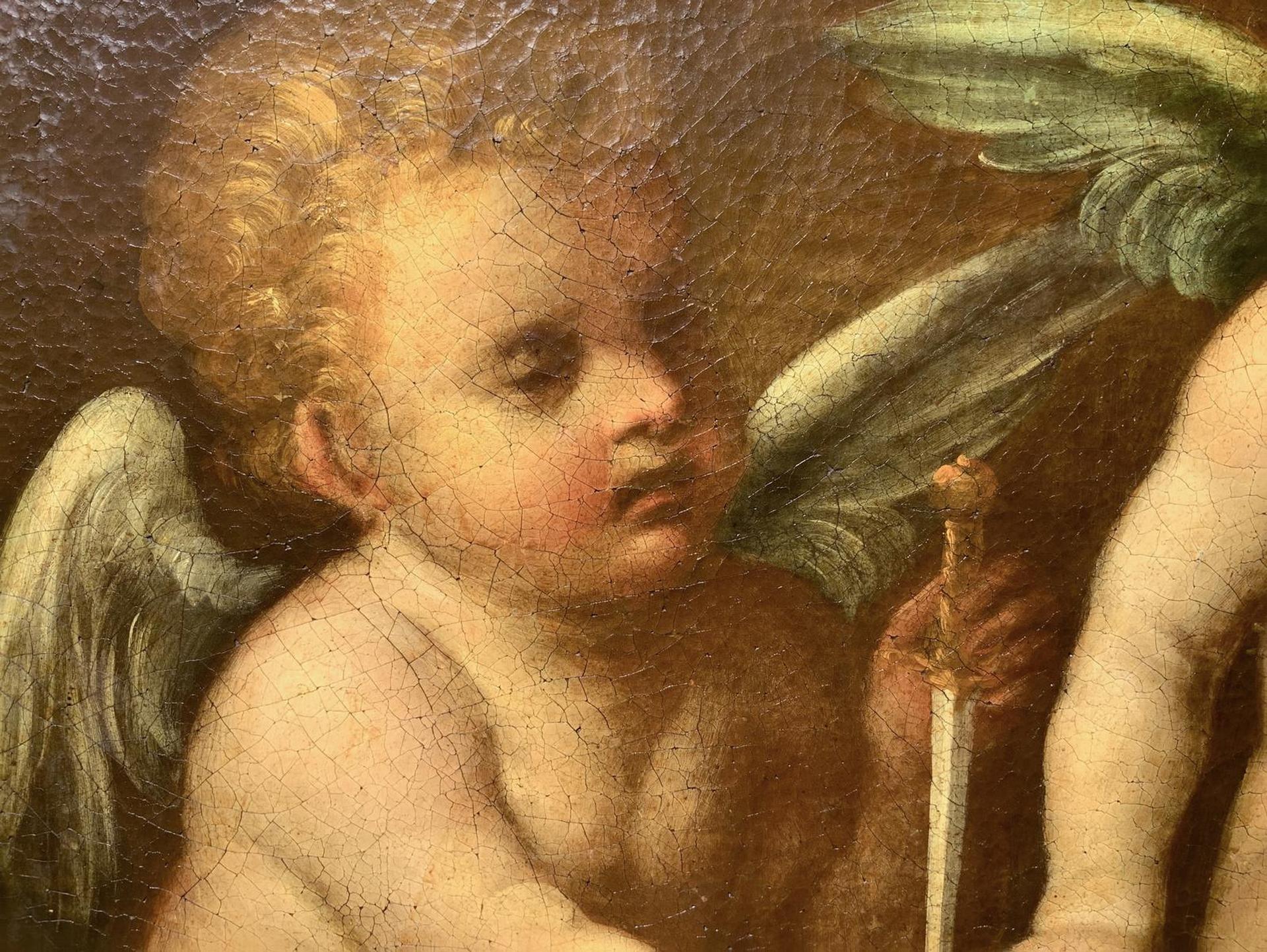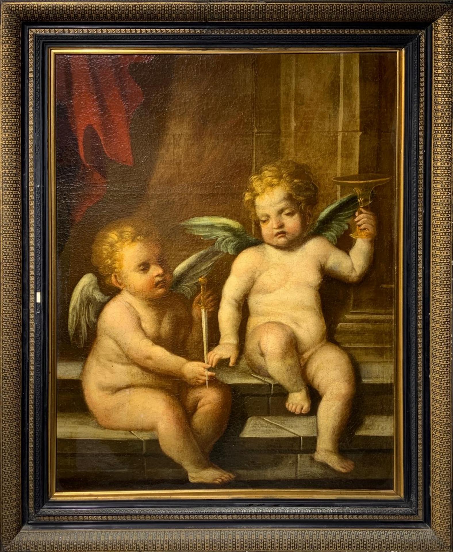Dipinto ad olio su tela raffigurante Angelo Raffaele con calice, portatore di rimedi per la salute, e Angelo Uriele con spadino "Luce di Dio", Centro Italia, XVII secolo. Cm 107x80, in cornice cm 130x105.