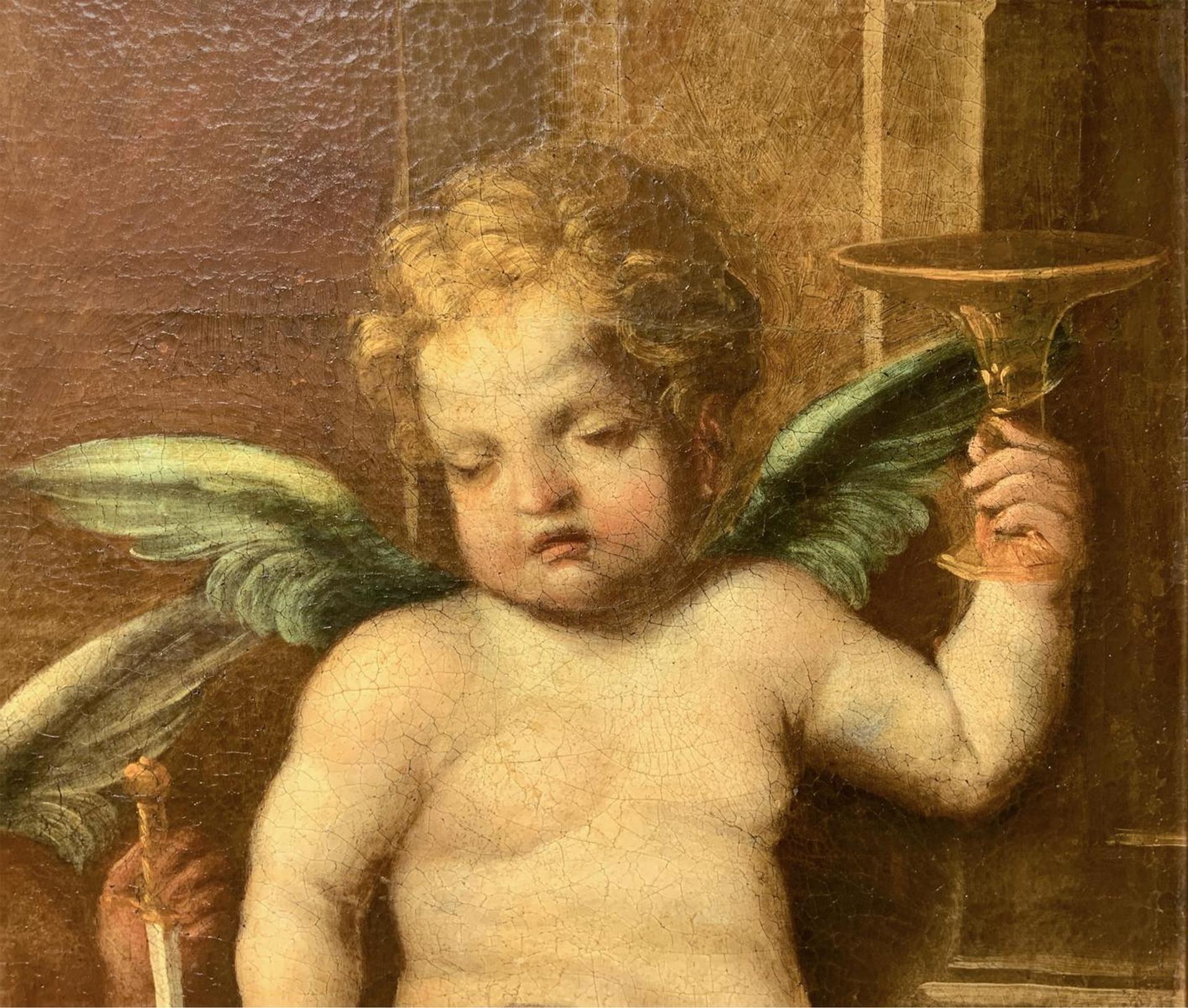 Dipinto ad olio su tela raffigurante Angelo Raffaele con calice, portatore di...