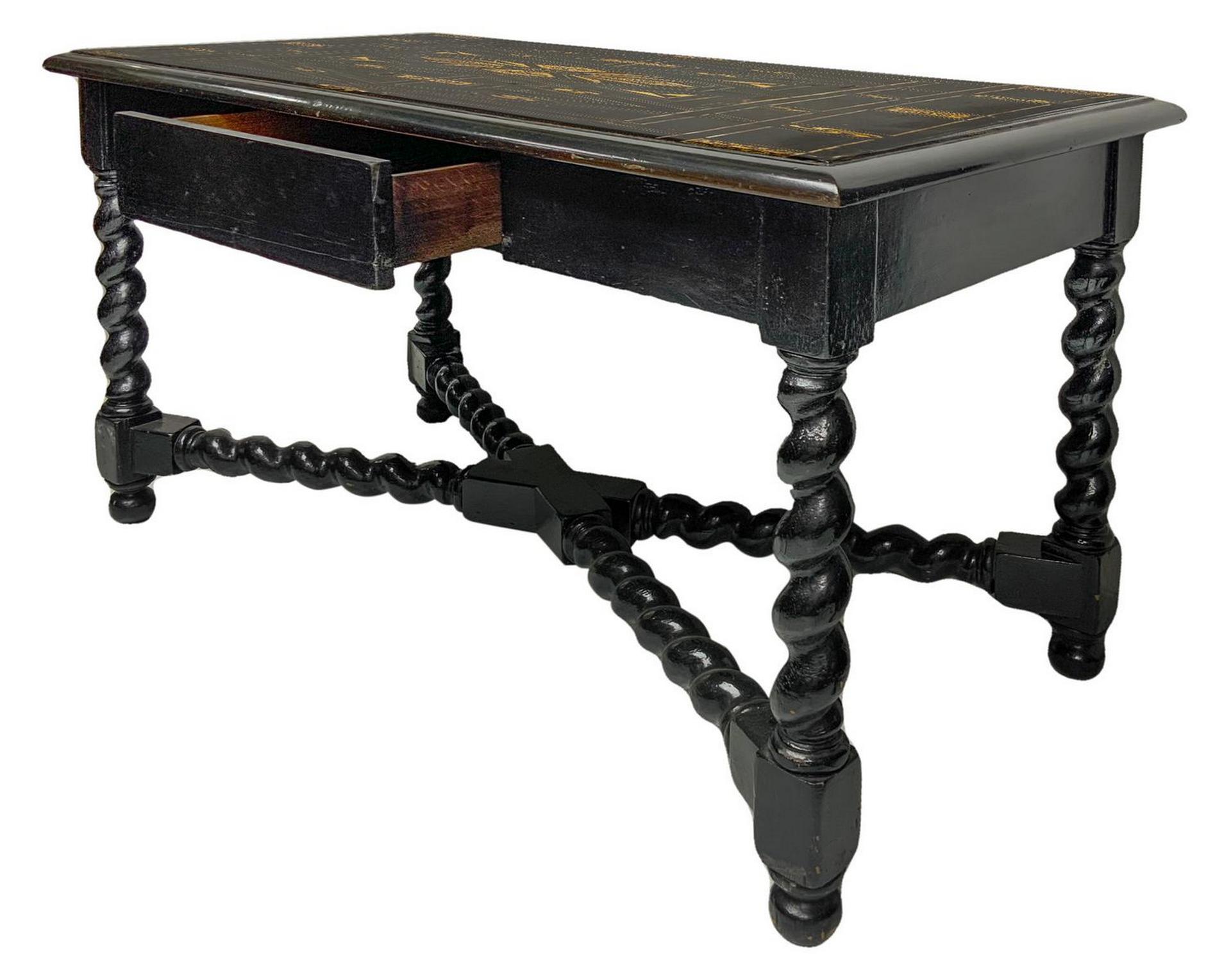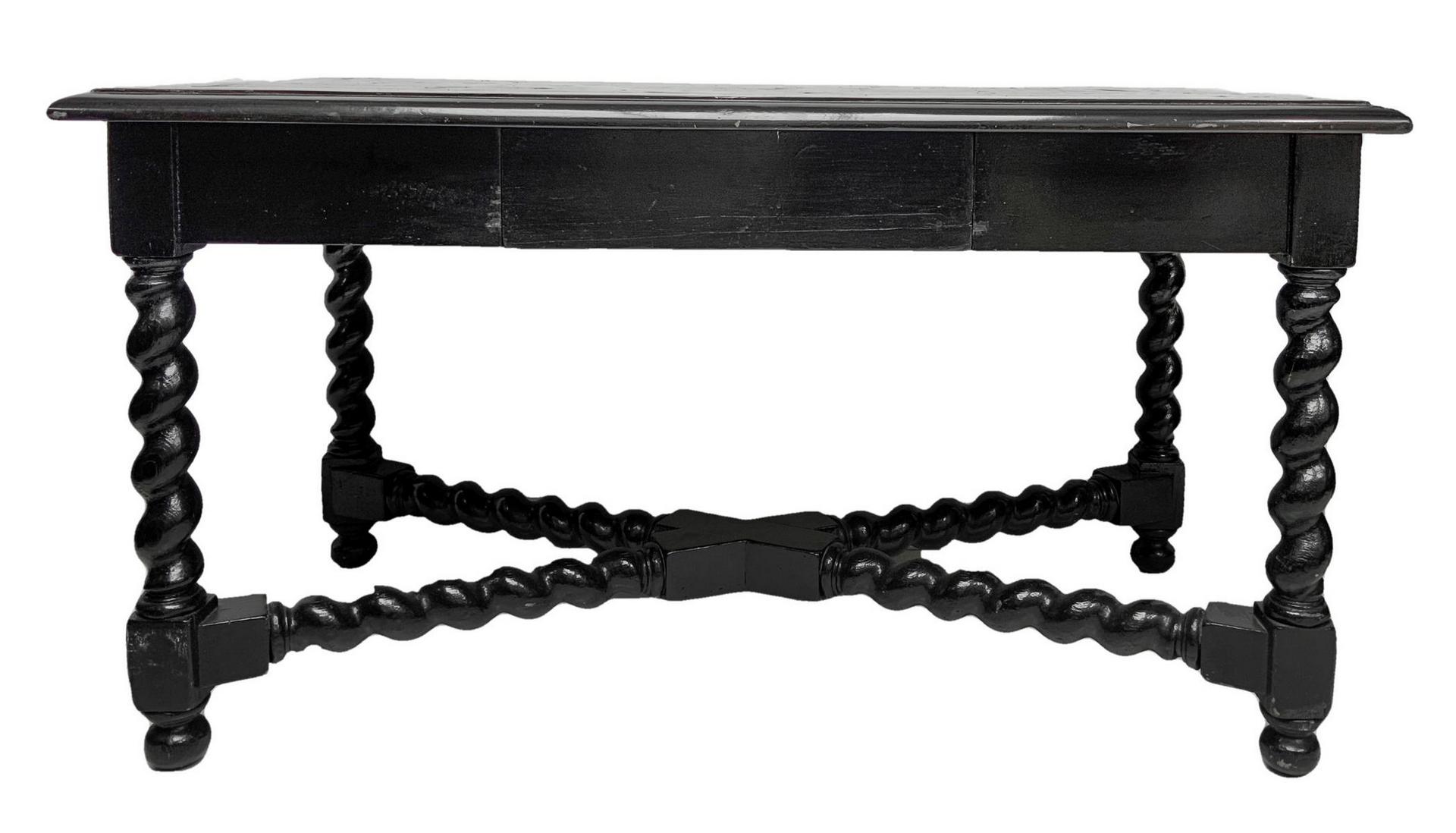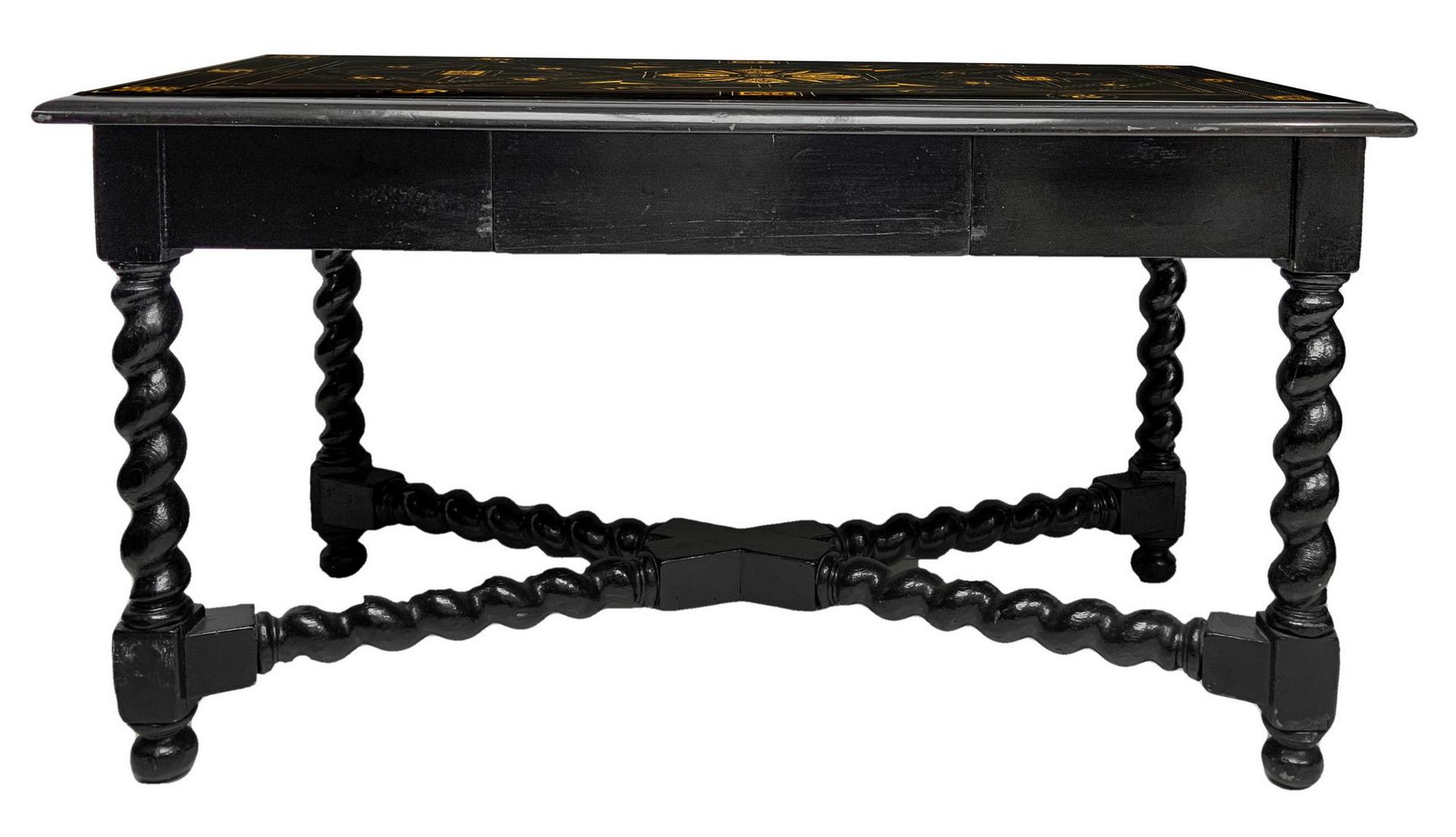 Scrittoio Luigi XIII , secolo XVII in legno ebanizzato nero, piano intarsiato in avorio sandraccato con al centro grande medaglione circolare a forma di fiore, perfilato in avorio con losanghe e quadrati che fanno da riserva a figurazioni intarsiate in avorio. Cassetto centrale, piedi a torciglione con legaccio a incrociare sempre a Torciglione. H Cm 73X 140X72