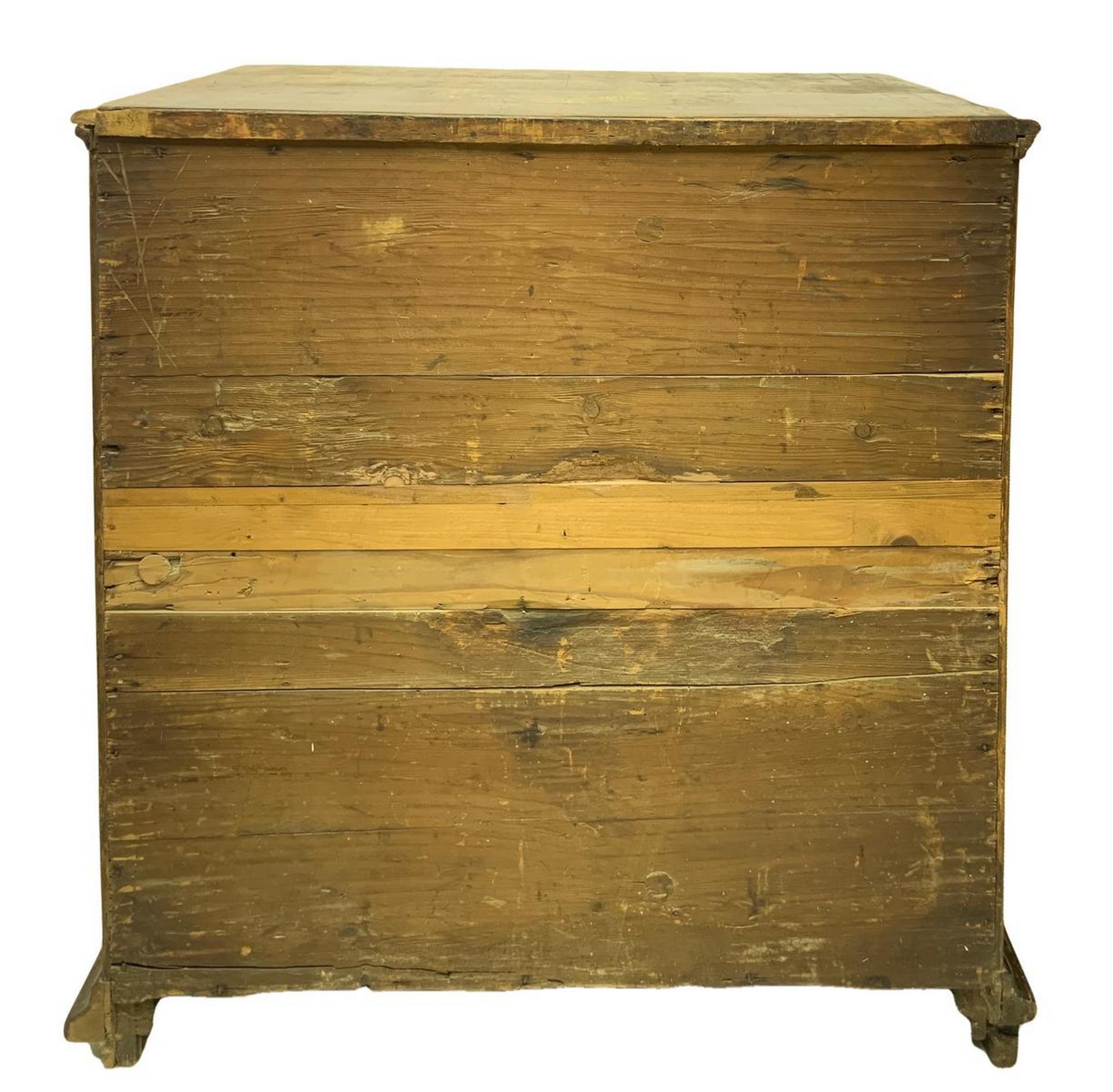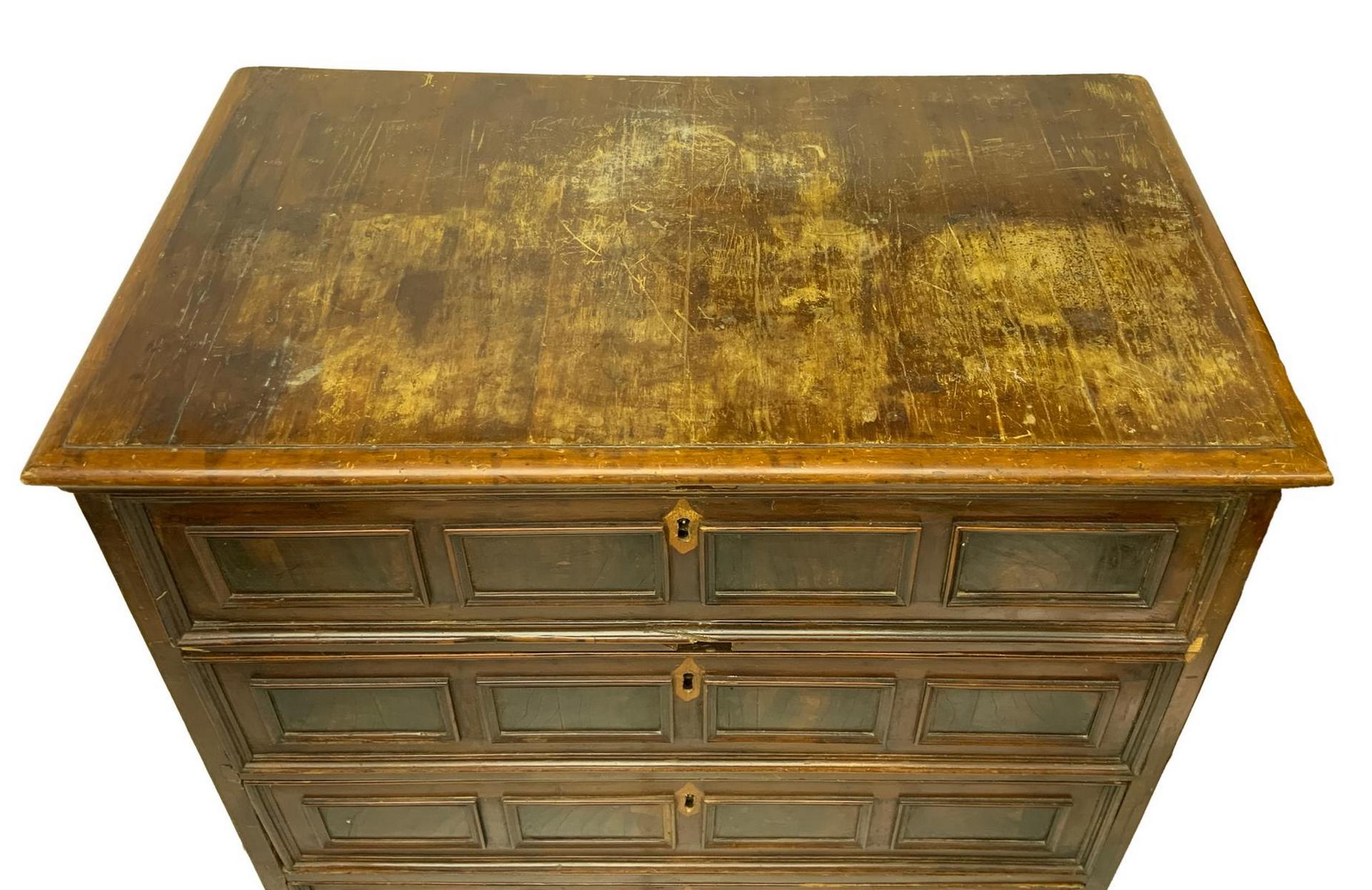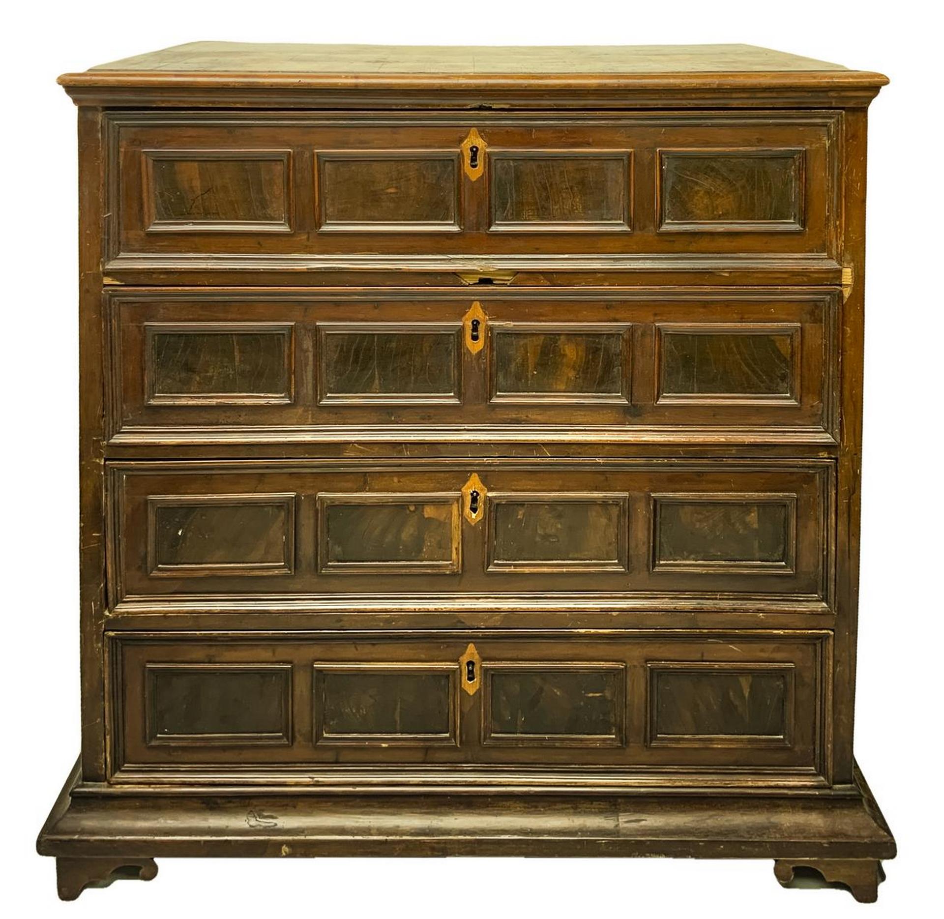 Cassettone in legno di noce, fine XVII secolo, Emilia. Sul fronte quattro cassetti decorati ciascuno con formelle lastronate in palissandro. Sui laterali grandi formelle entro cornici rettangolari. Piedi a mensola. H cm 125x105x60