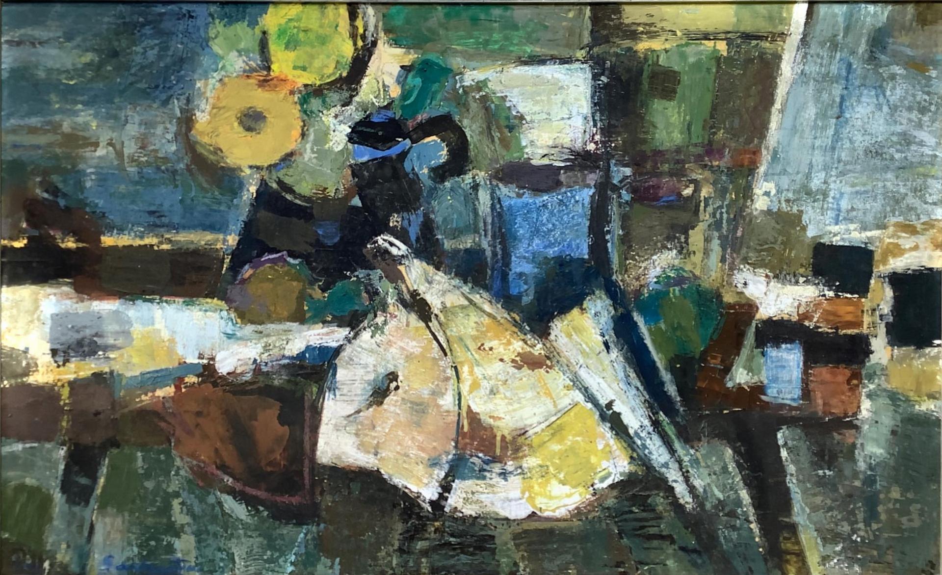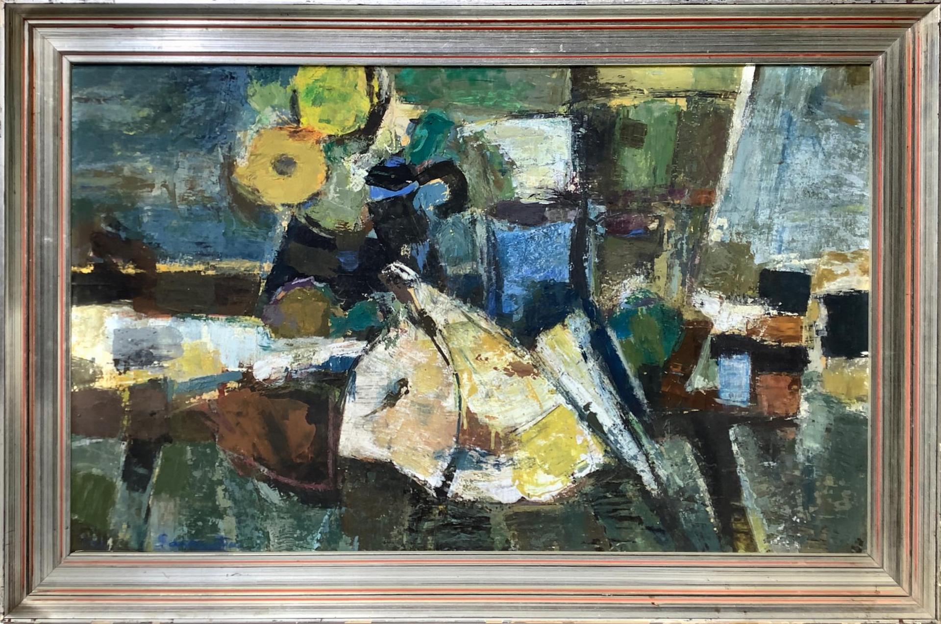 Dipinto ad olio su masonite raffigurante natura morta astratta. Firmato in...