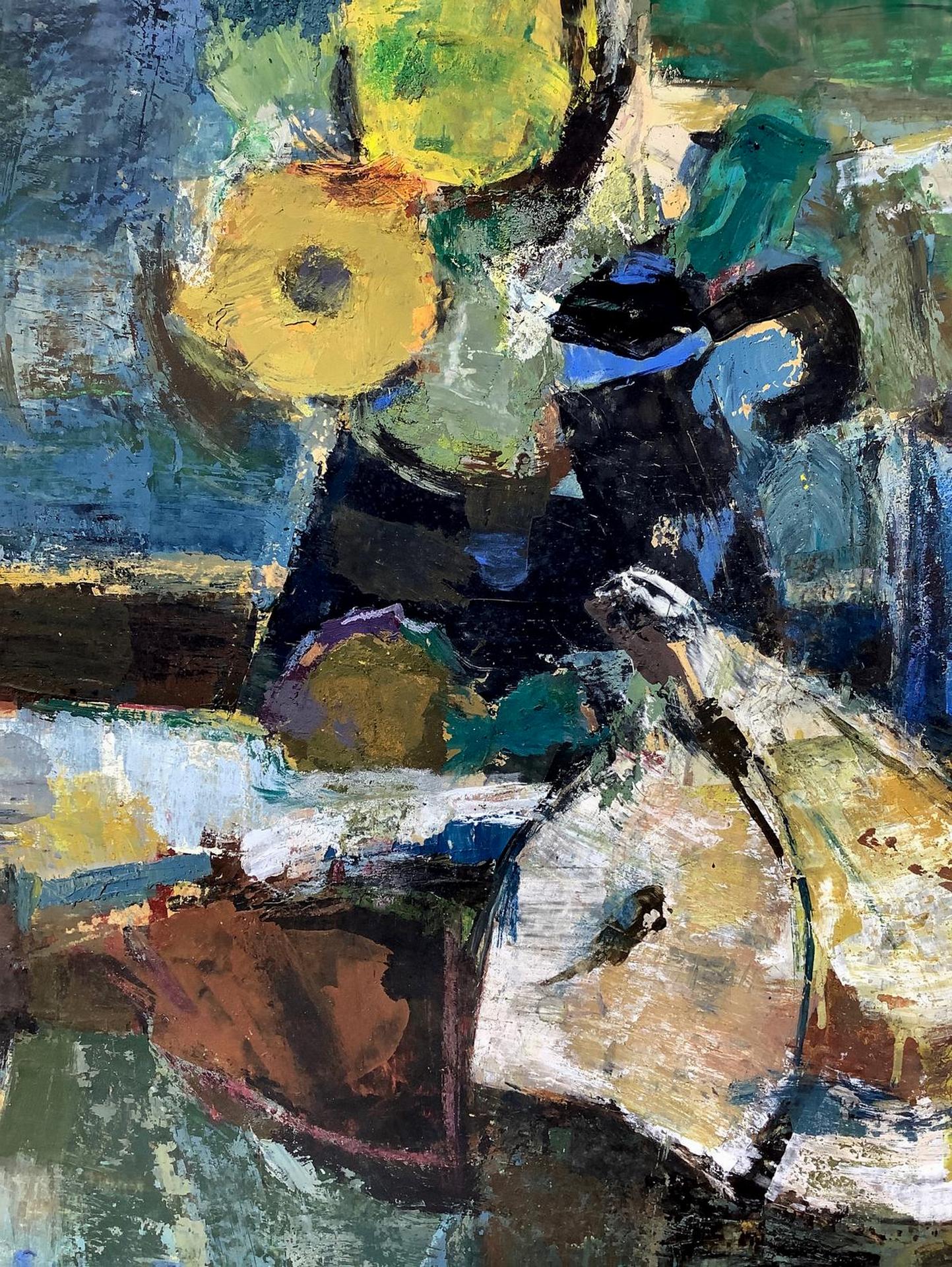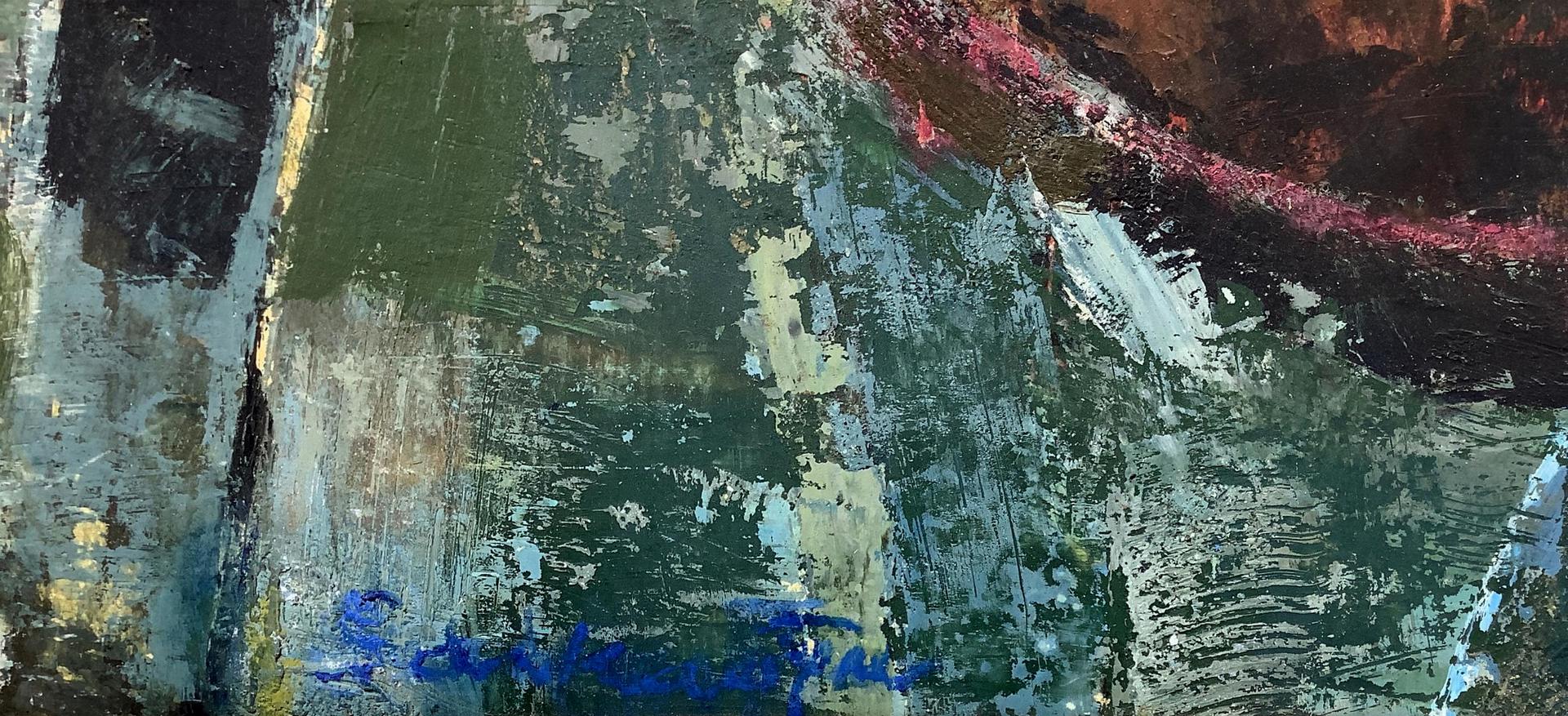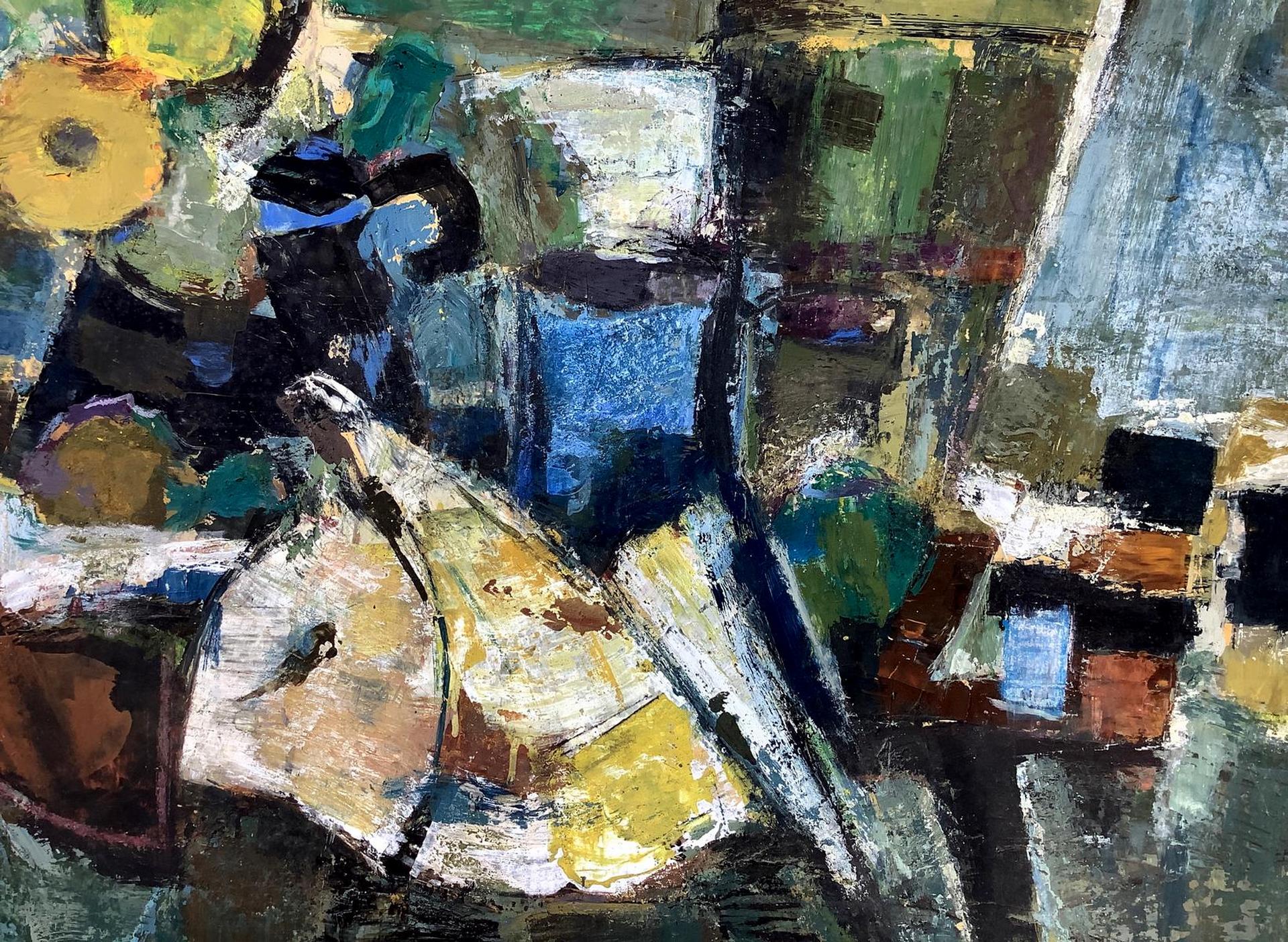 Dipinto ad olio su masonite raffigurante natura morta astratta. Firmato in basso a sinistra Judith Sarkintu, pittrice ungherese XX/XXI secolo. Cm 51x85, in cornice cm 63x97