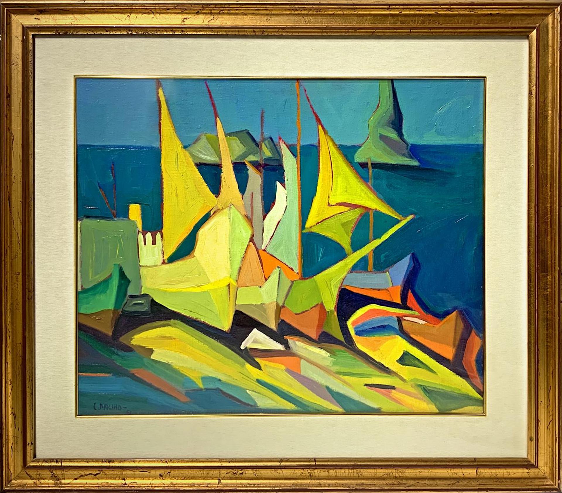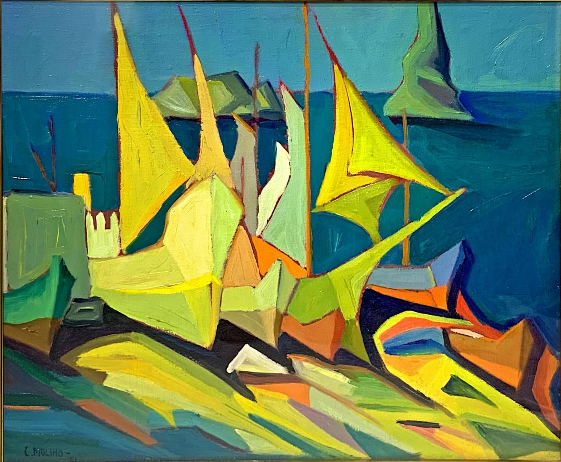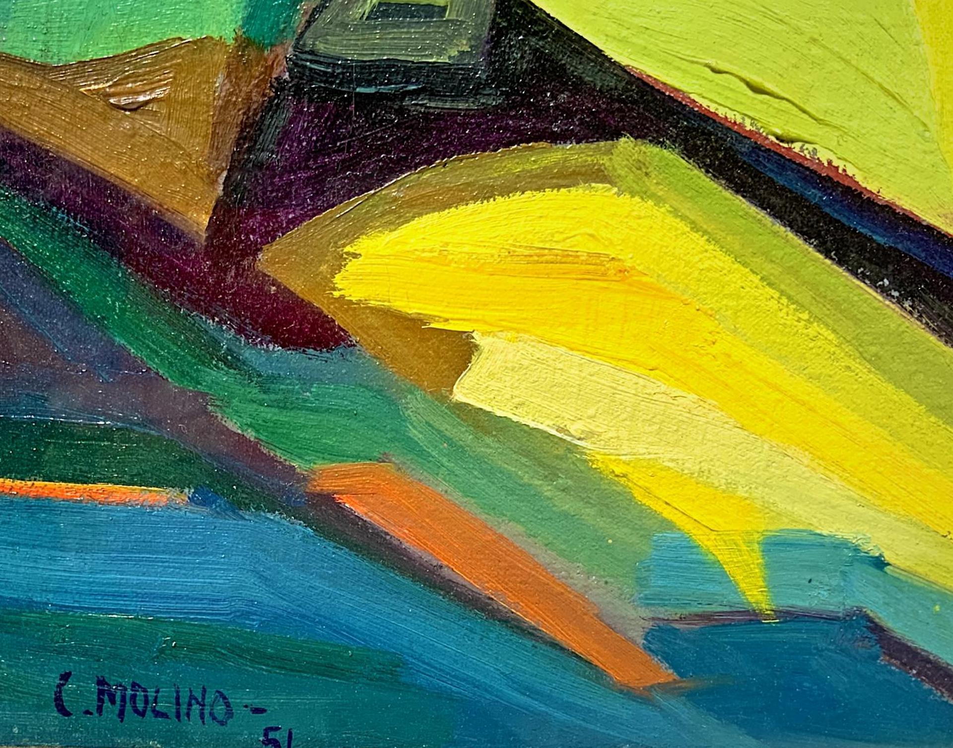 Dipinto ad olio su tela raffigurante “Marina di Trezzaâ€_x009d_, Carmelo Molino (Catania 1908-1984). Sul retro l’etichetta di partecipazione alla Quadriennale Nazionale d'Arte di Roma 1951-1952. Cm 50x60 in cornice cm 72x82. Firmato in basso a sinistra C. Molino 51. Carmelo Molino, nato a Catania nel 1908, rappresenta un’artista a tutto tondo nel panorama artistico del novecento siciliano. Non solo un pittore e amante dell’arte, ma anche poeta della sua terra e delle sue tradizioni. Pier Paolo Pasolini per il suo volume “Poesia Dialettale del Novecentoâ€_x009d_, lo definisce un’artista dalla moderata modernità all’interno del panorama della letteratura italiana. La sua produzione poetica si incrocia e influenza quella pittorica caratterizzata da una spinta verso il surrealismo e il simbolismo espressi per mezzo di una pittura materica e dal segno veloce. L’abbandono del soggetto non è però mai totale permettendo di riconoscere nelle sue opere spesso i temi della natura, del mare e della campagna, simboli di un forte legame con la cultura mediterranea. Il segno pittorico non è definito, i contorni vengono abbandonati a favore di colori accesi e la pittura quasi prende vita per mezzo dell’accentuata luminosità . Espone alla “Galleria di Romaâ€_x009d_ a Catania, ottiene un’intera sala dedicata alle sue opere durante la XIX Promotrice del 1948 e prende parte anche a diverse mostre in giro per l’Italia, tra le quali la Quadriennale di Roma 1951-1952 dove presenterà l’opera Marina di Trezza.