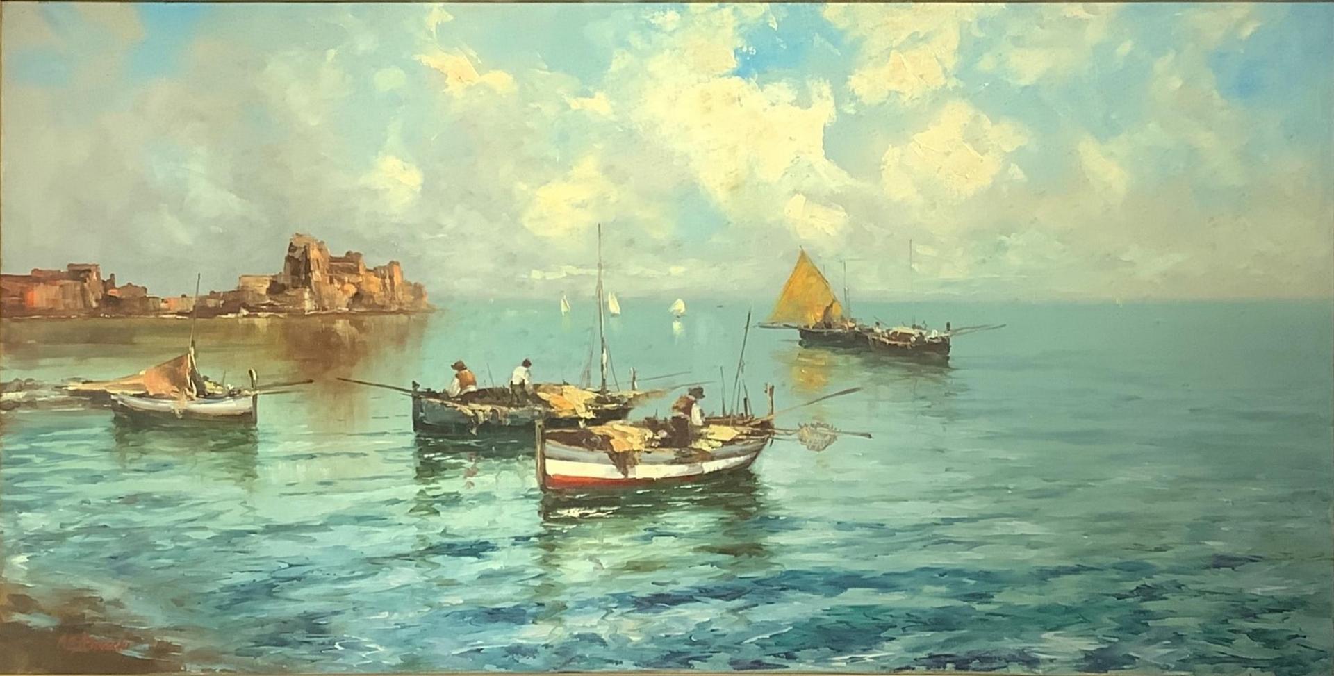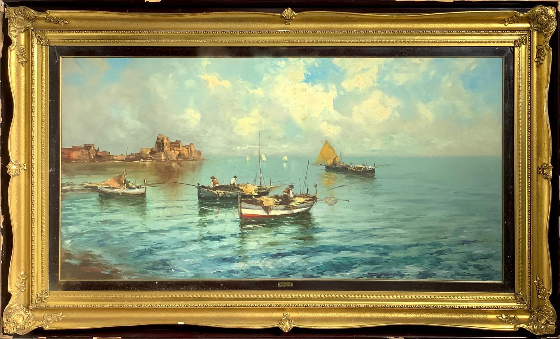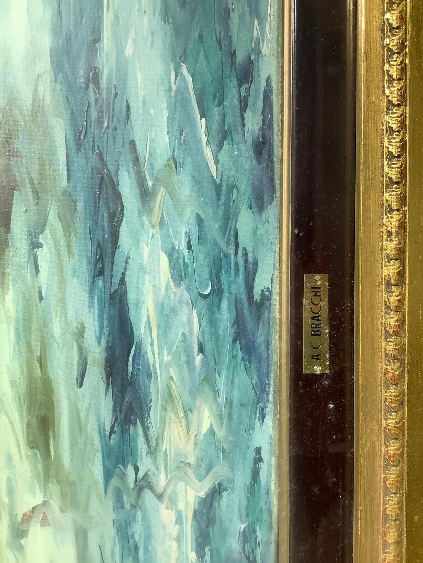 Dipinto ad olio su tela raffigurante Castel Dell’Ovo. Firmato in basso a sinistra A. C. Bracchi, pittore attivo nel bresciano, XX secolo. Cm 60x121, in cornice cm 88,5x150