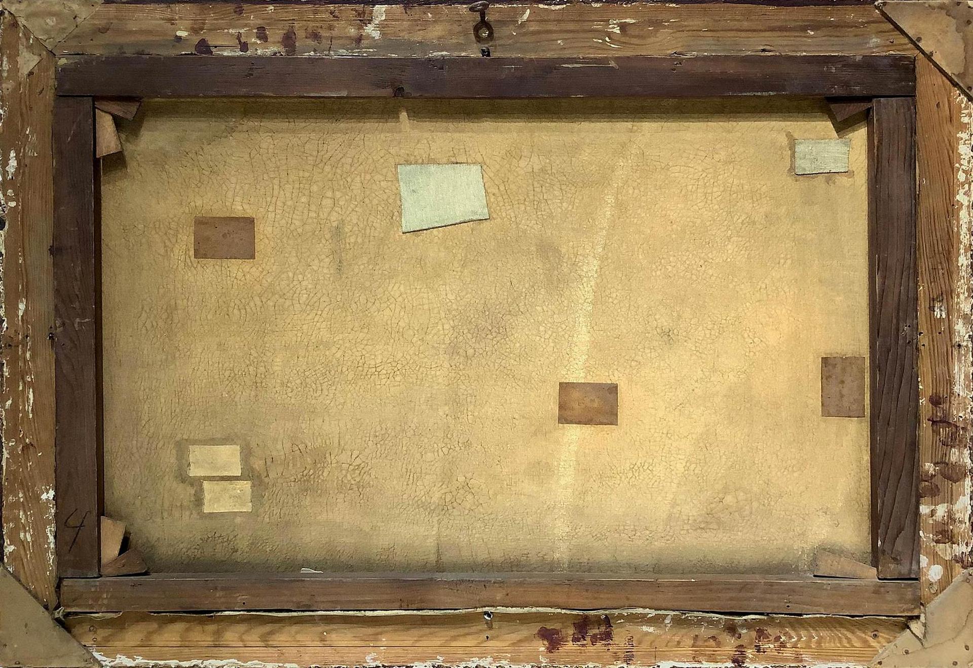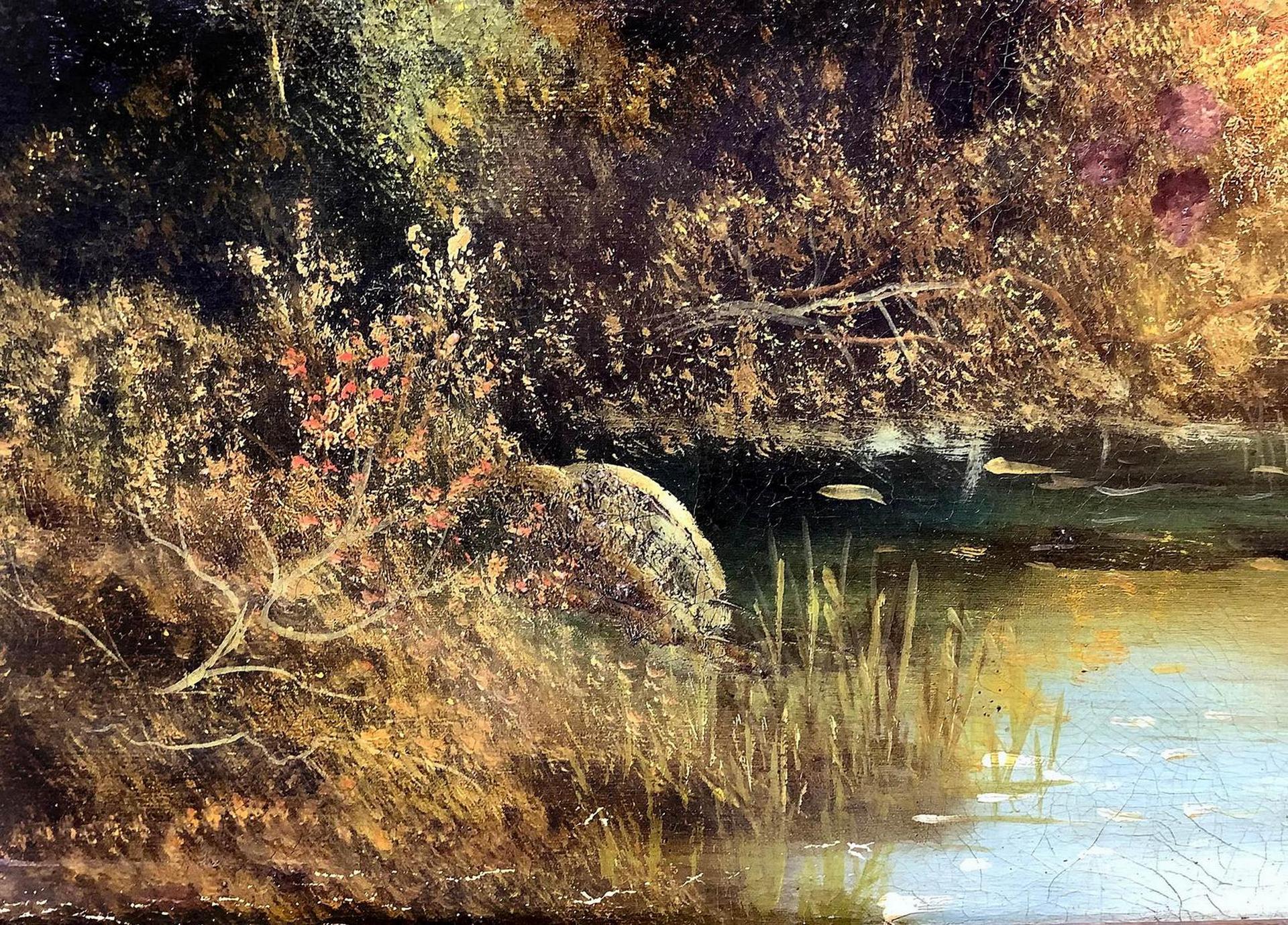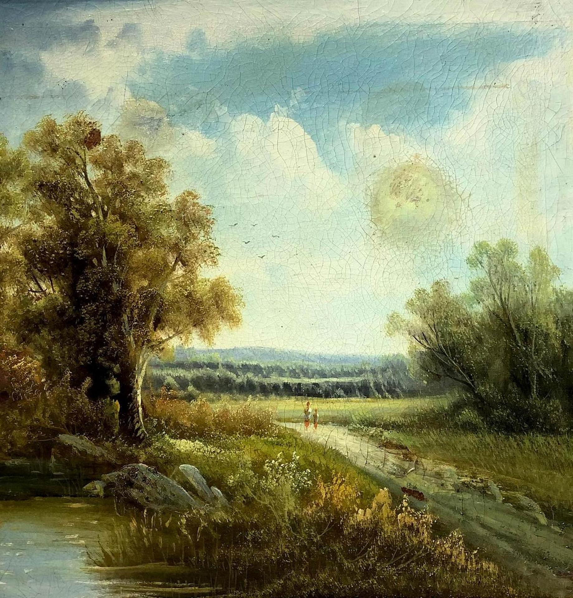 Dipinto ad olio su tela raffigurante paesaggio fluviale con personaggi. Cm...
