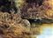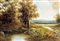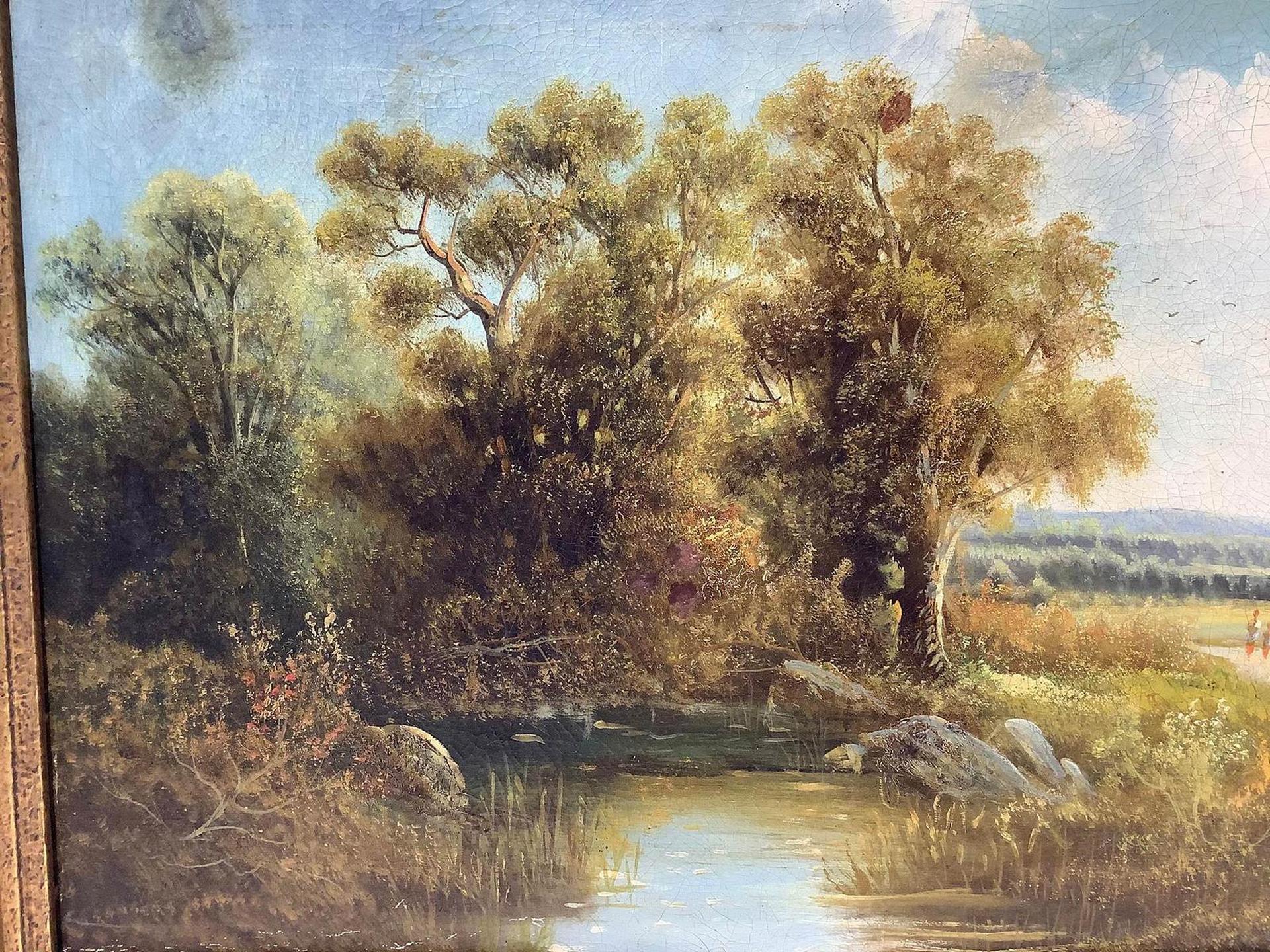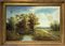 Dipinto ad olio su tela raffigurante paesaggio fluviale con personaggi. Cm 52x79,5. In cornice 64x91.