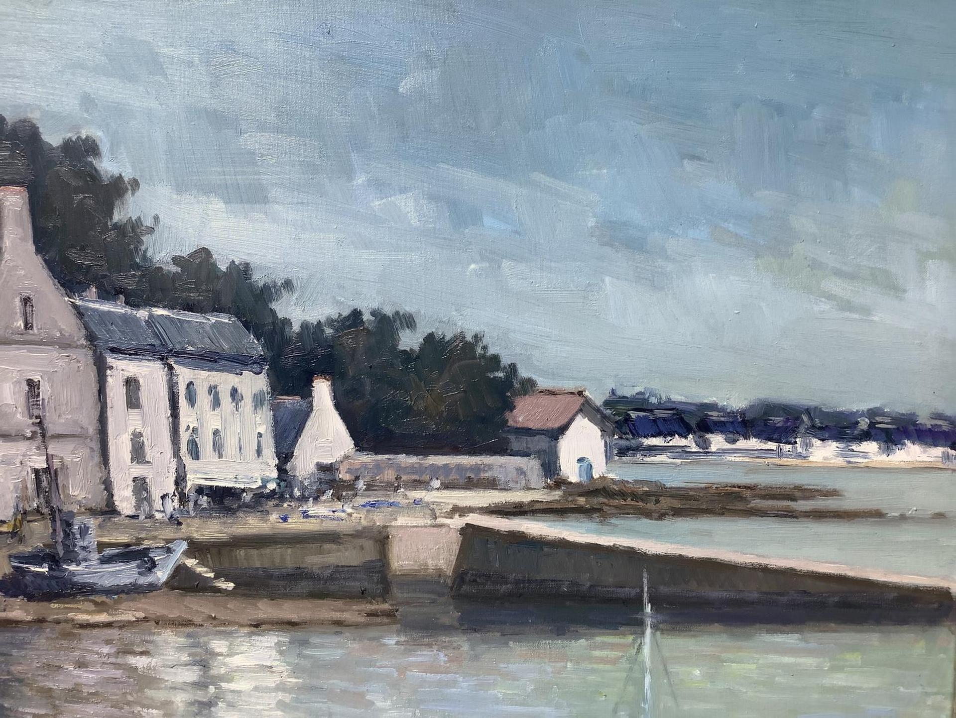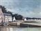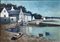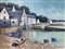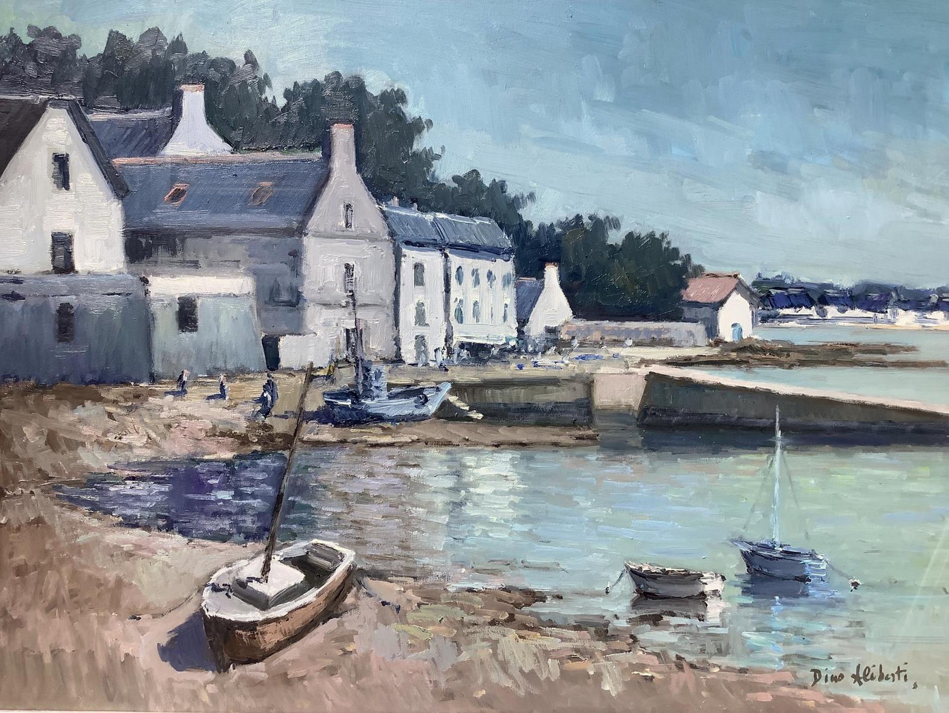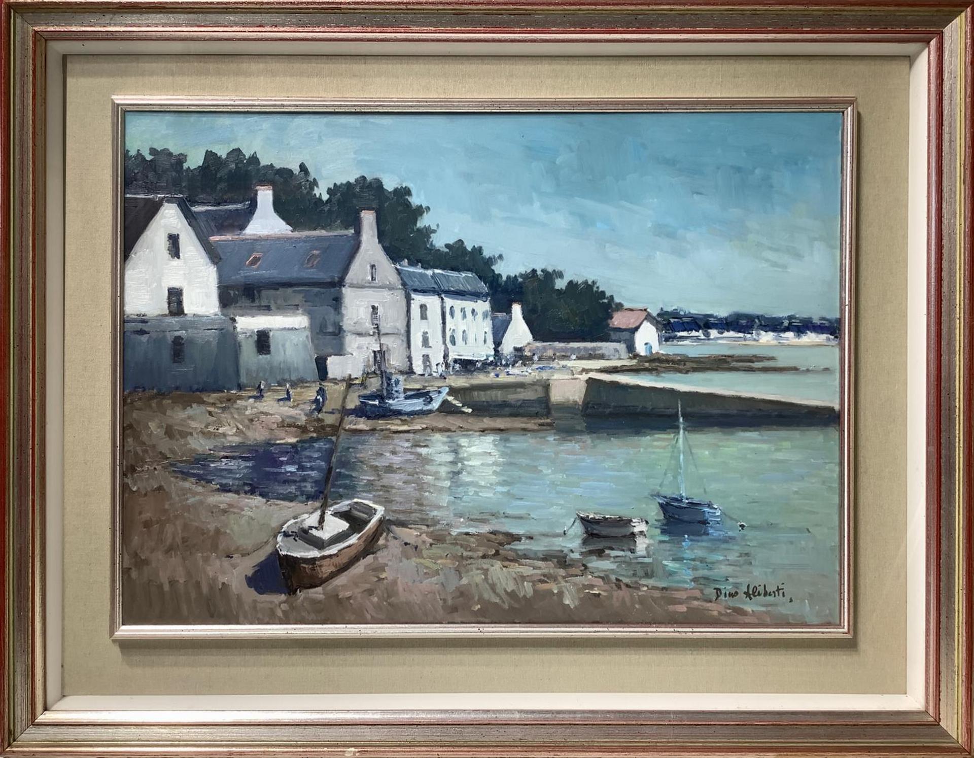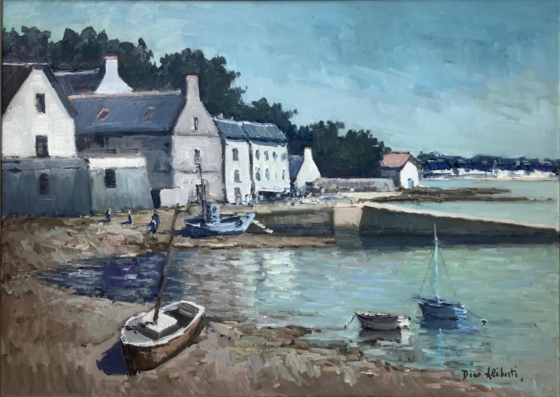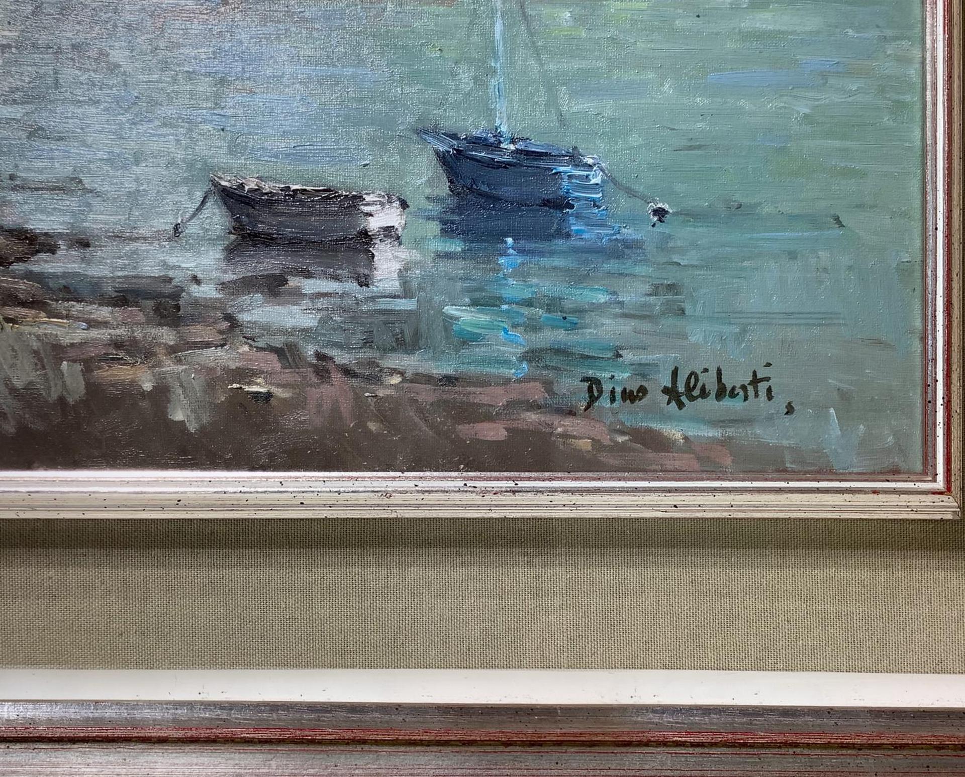 Dipinto ad olio su tela raffigurante paesaggio costiero con imbarcazioni e case, firmato in basso a destra Dino Aliberti (Torino 1935). Cm 50x70, in cornice cm 71x91,5