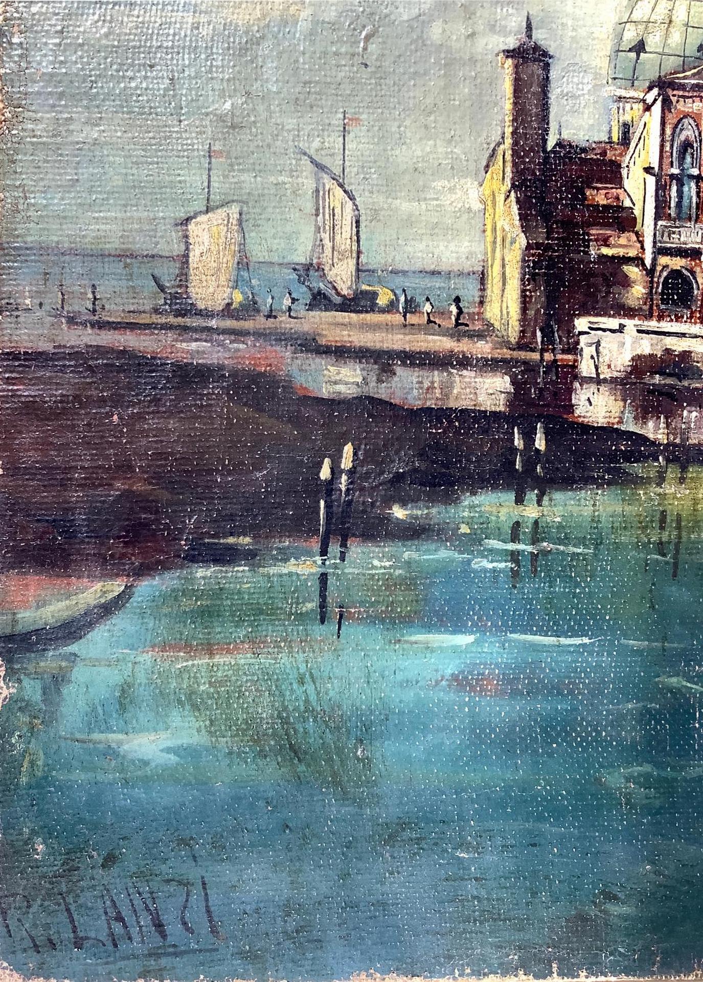Dipinto ad olio su tavola raffigurante capriccio lagunare con chiesa su isolotto, firmato in basso a sinistra R. Lanzi. Rino Lanzi. Privo di cornice. Cm 35x25