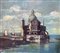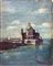 Dipinto ad olio su tavola raffigurante capriccio lagunare con chiesa su...