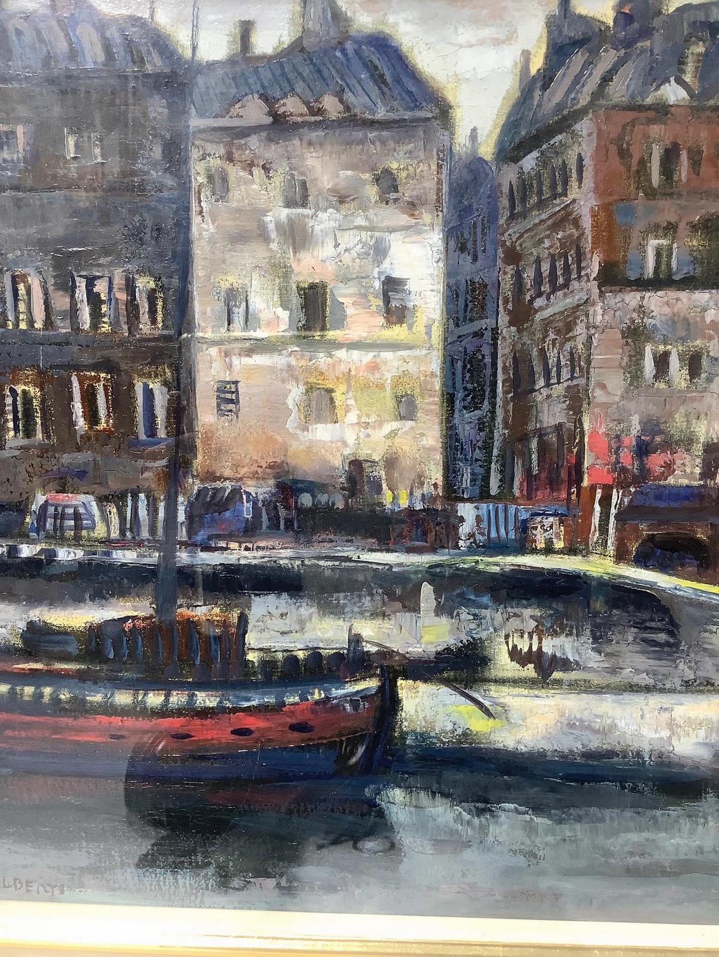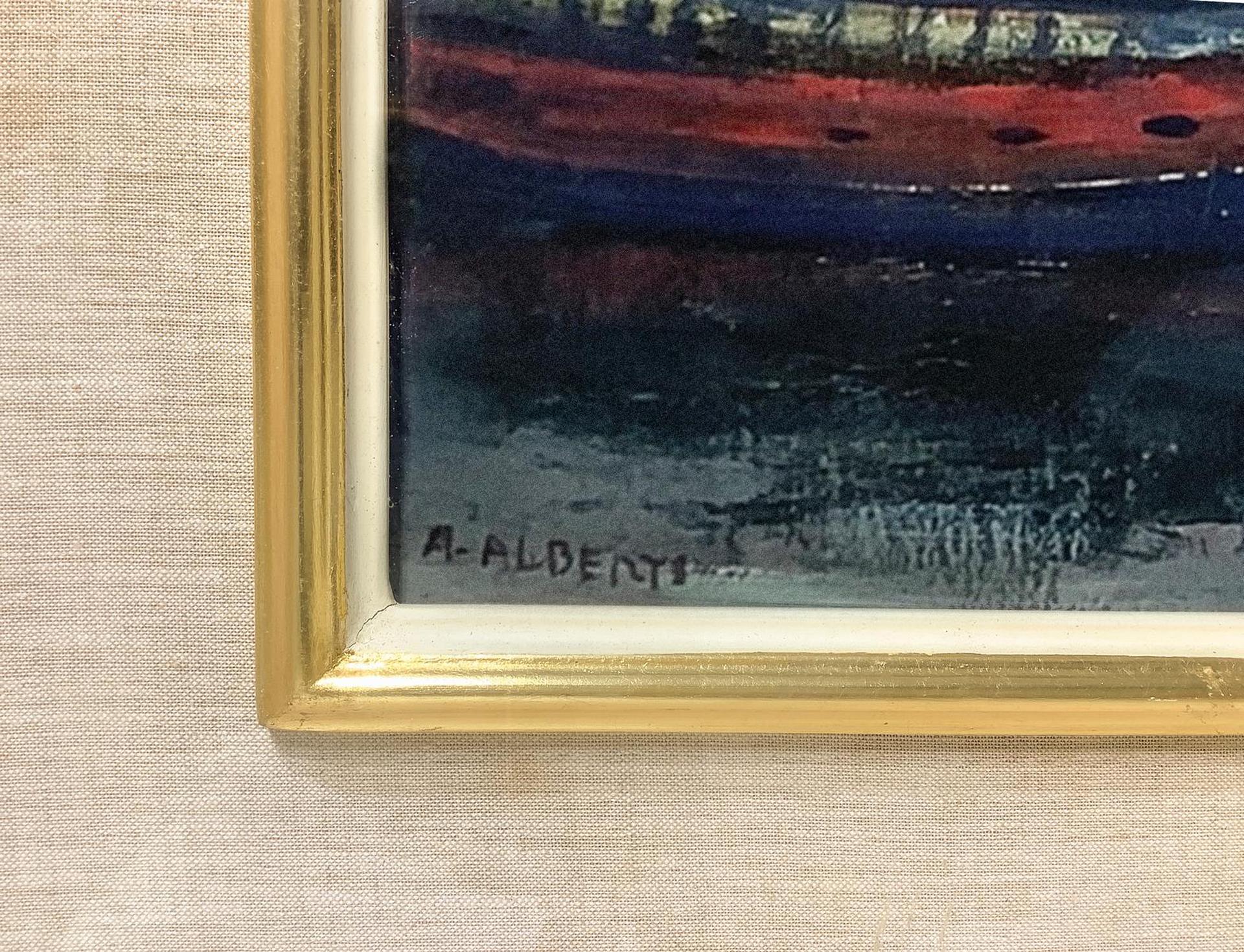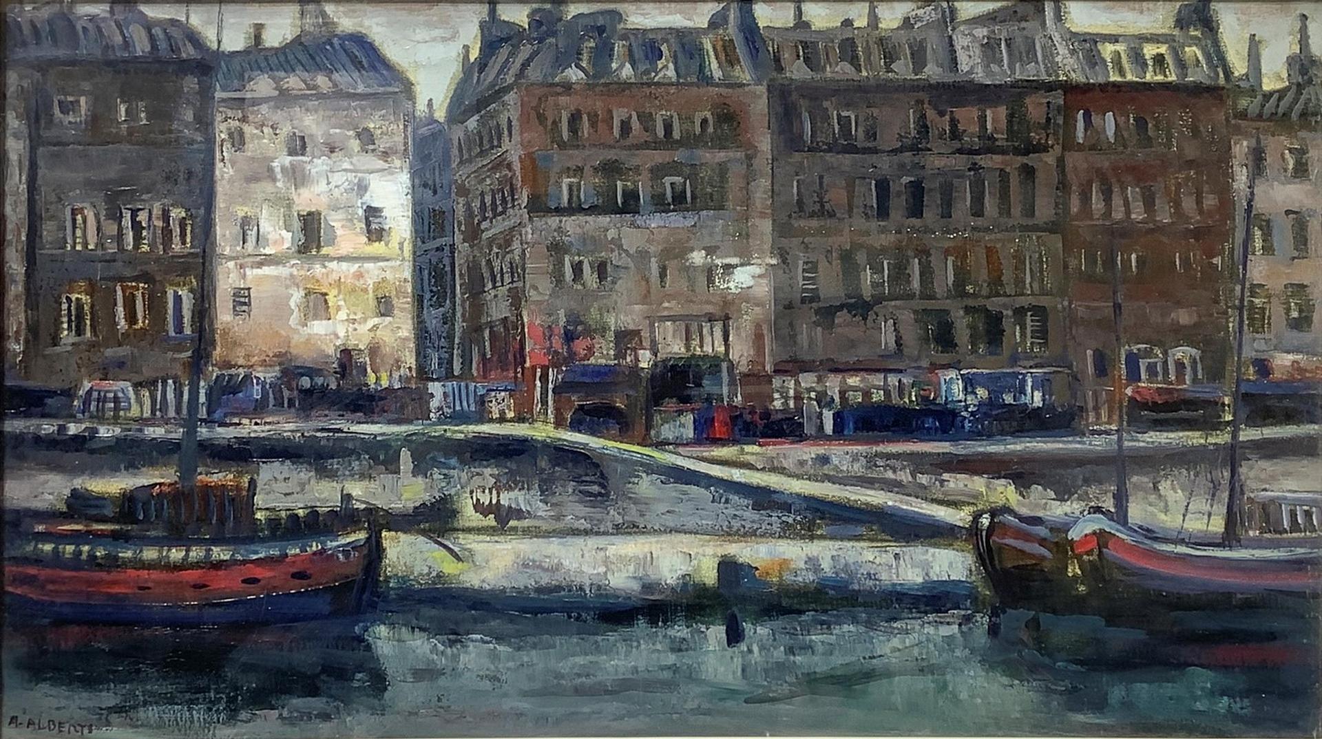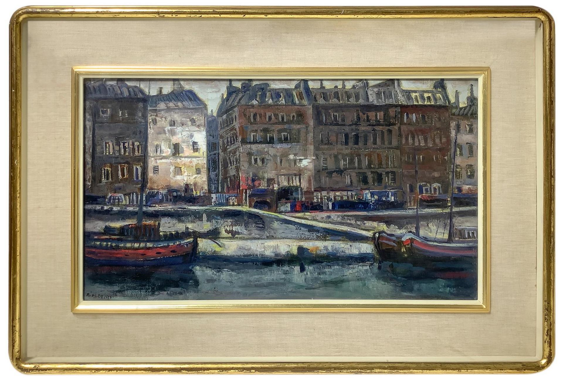 Antonio Alberti dipinto ad olio su tela raffigurante barche sulla senna a Parigi, firmato in basso a sinistra A.Alberti (Busto Arsizio 1912-2014). Cm 40x70, in cornice cm 62x92