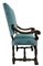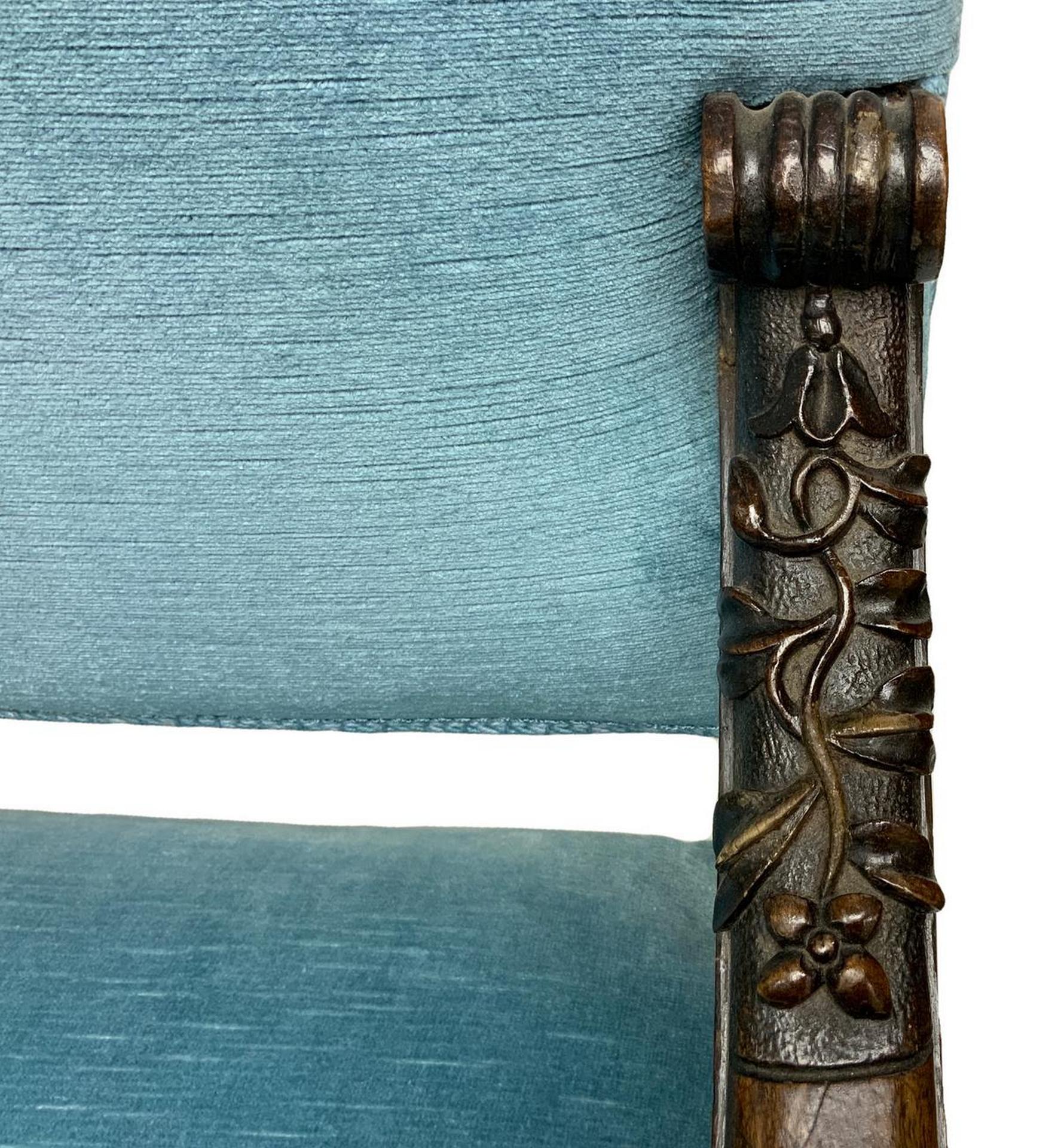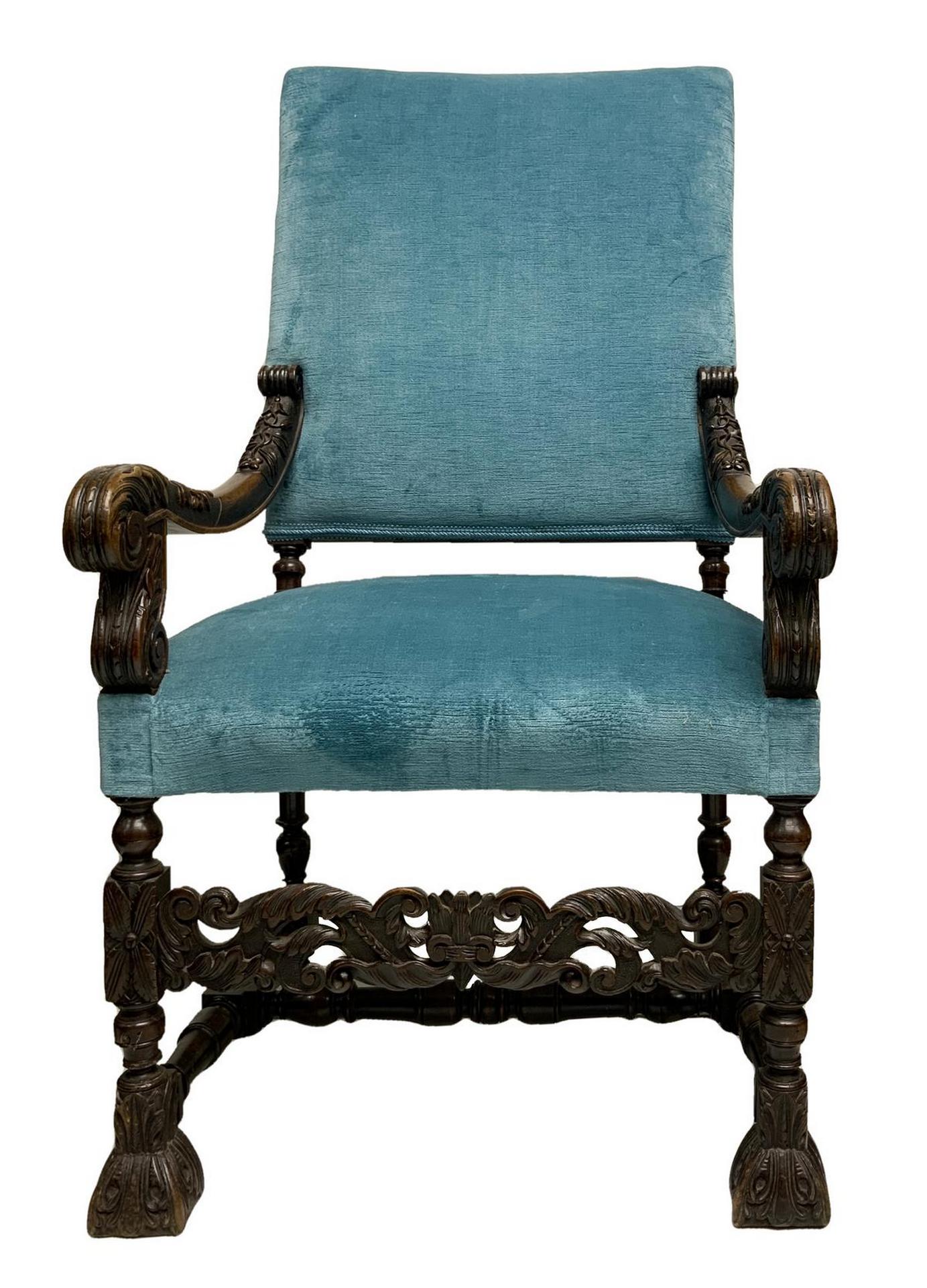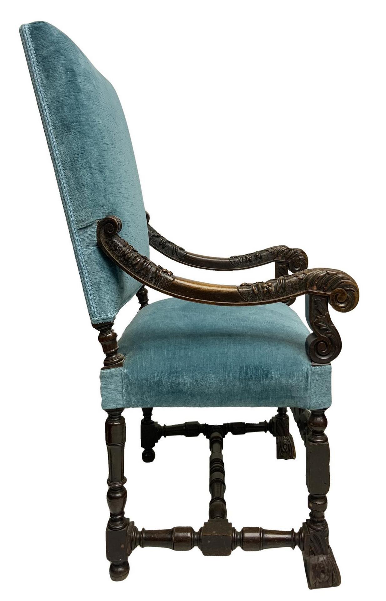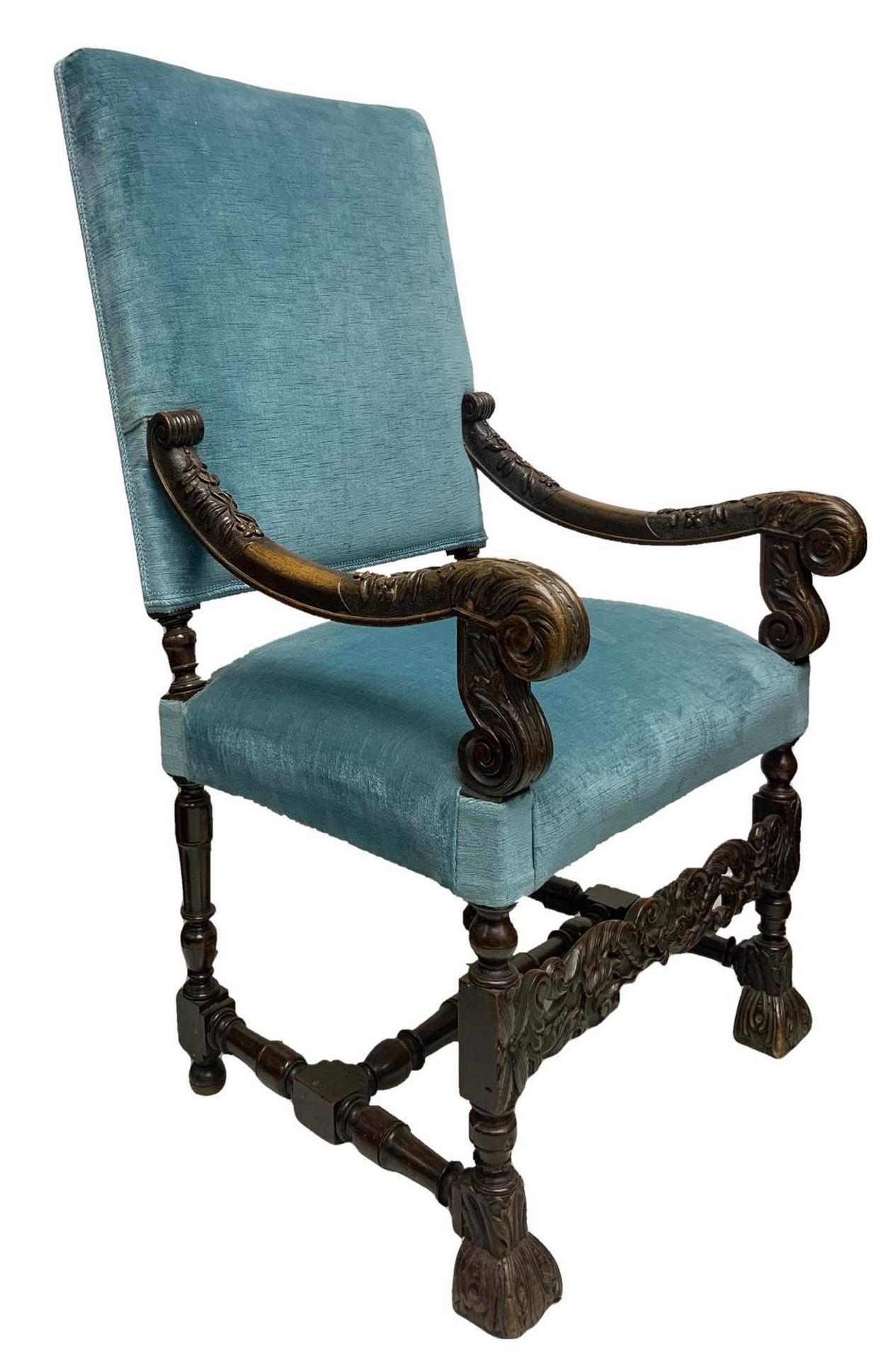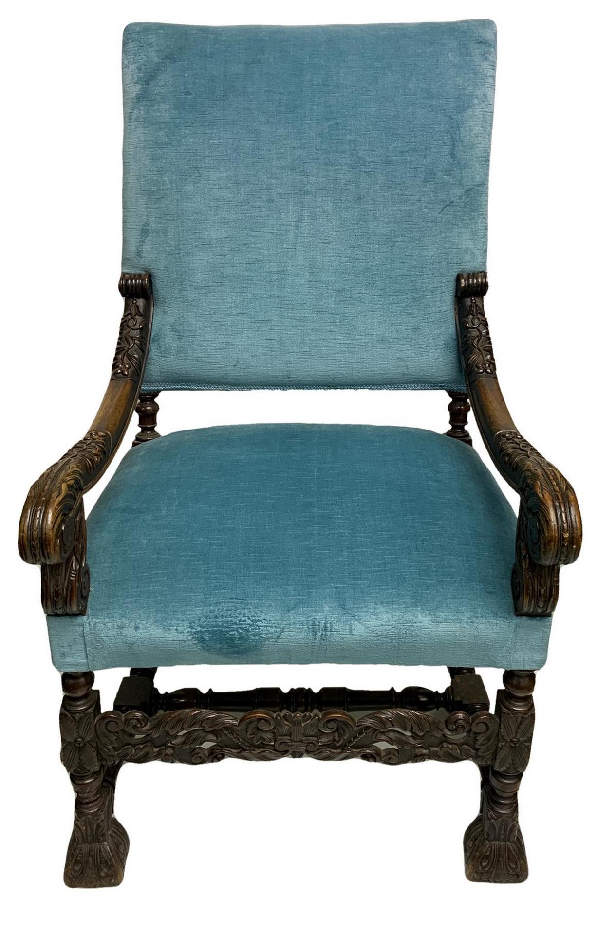Poltrona in legno di noce scolpito, Lombardia, Italia, XVII secolo. Con schienale e seduta imbottiti, braccioli scolpiti di linea mossa terminanti a ricciolo, gambe a rocchetto con piedi caprini collegati ad H da una traversa frontale scolpita a motivi floreali. Segni d'uso sulla tappezzeria. H cm 113x66x72