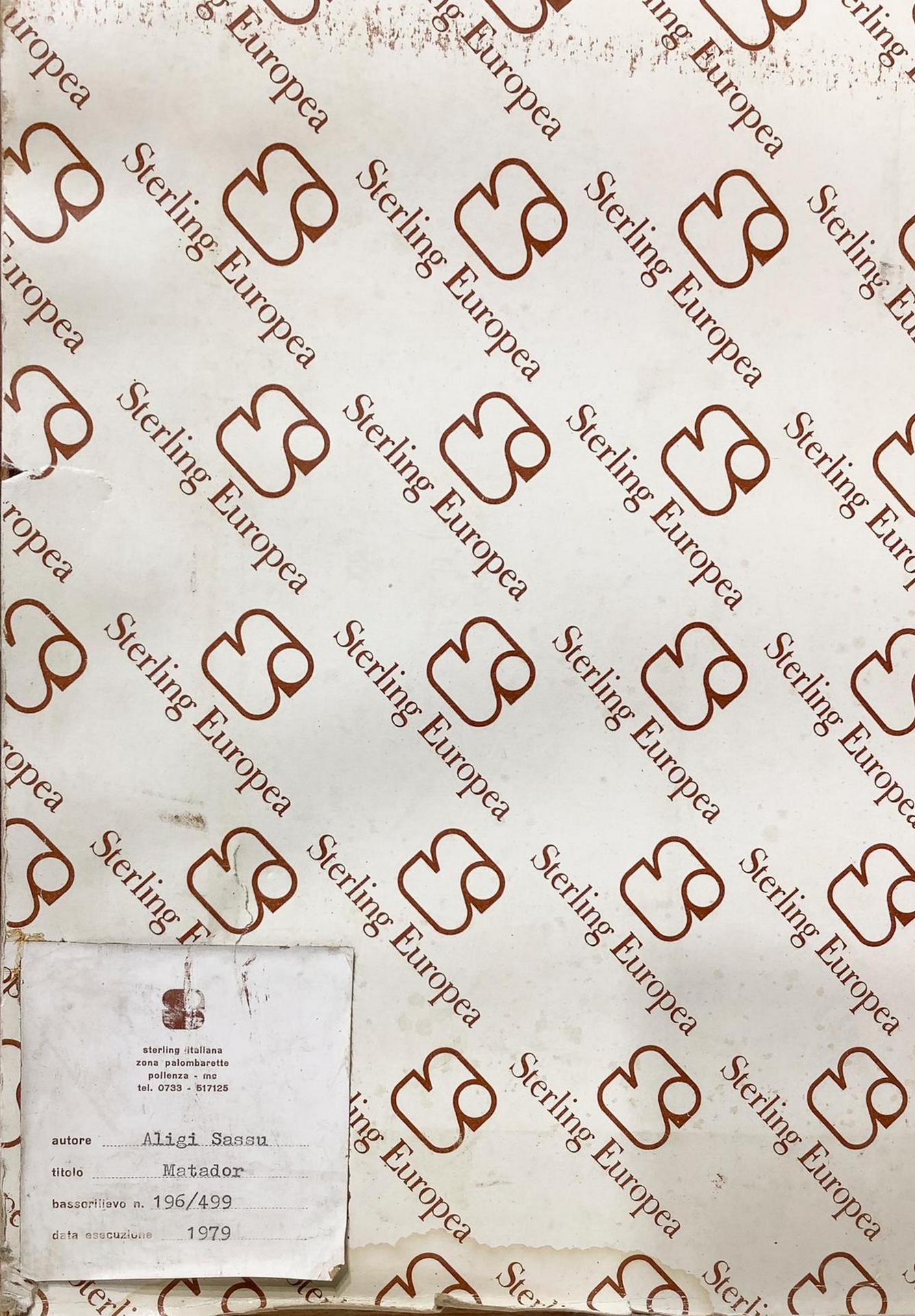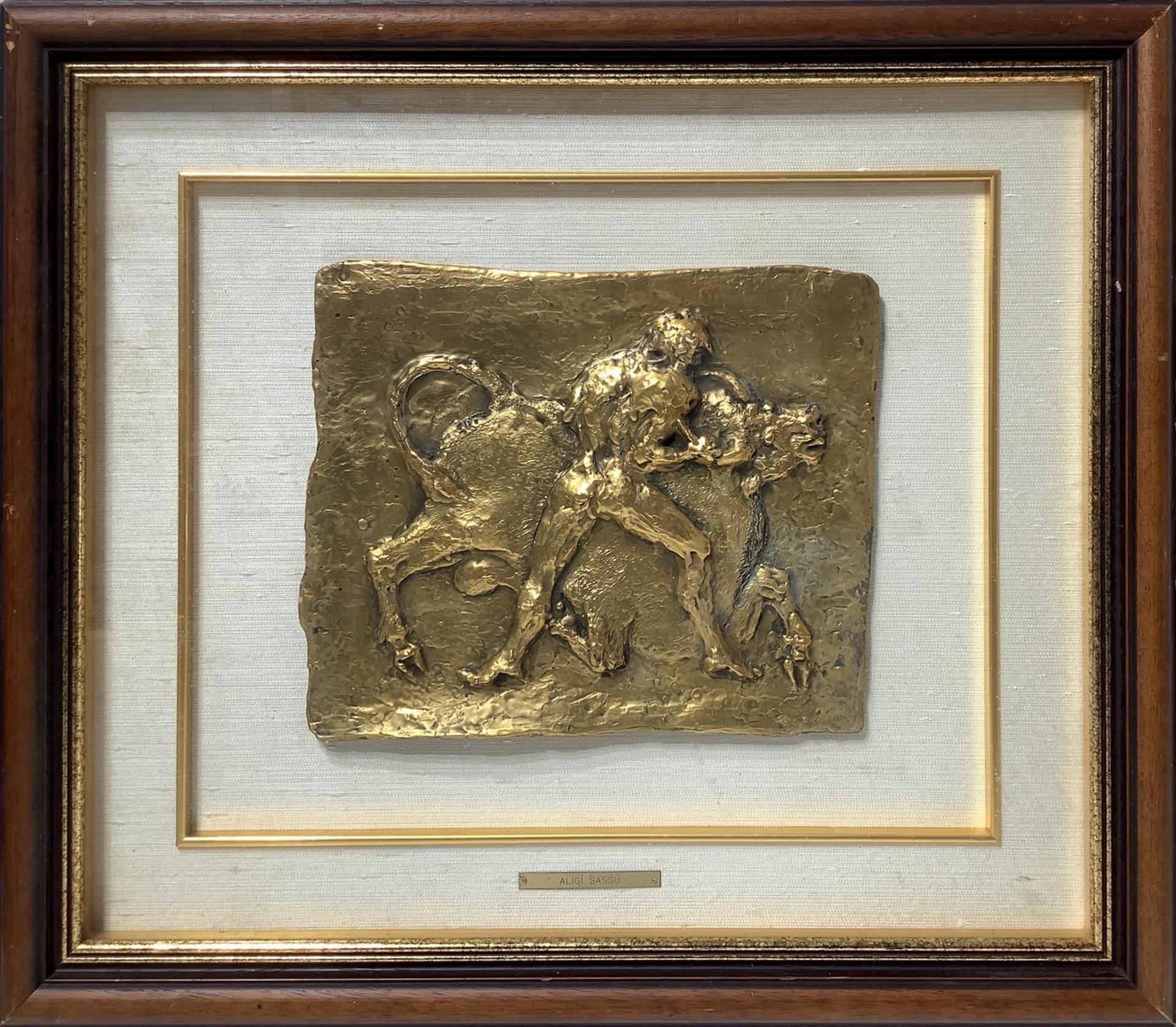 Bassorilievo di Aligi Sassu (Milano 1912-Pollenca 2000) su lastra di argento 925/1000 placcato in oro 24kt raffigurante matador-uomo con toro, firmato in basso a destra Sassu , multiplo di 196/499. Cm 29x34 in cornice cm 64x73
