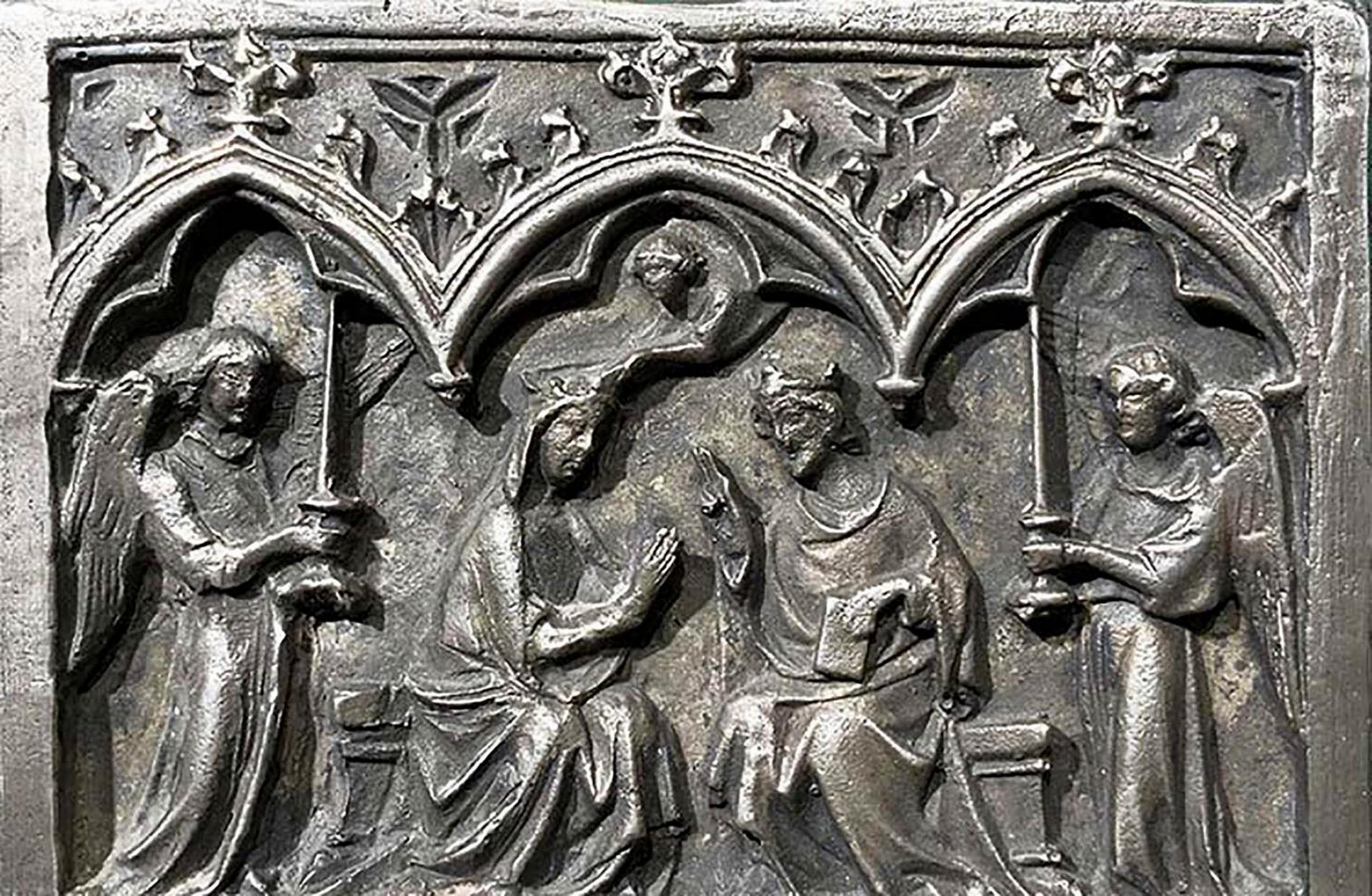 Placche d’argento applicate su malachite con raffigurazioni Bibliche,...