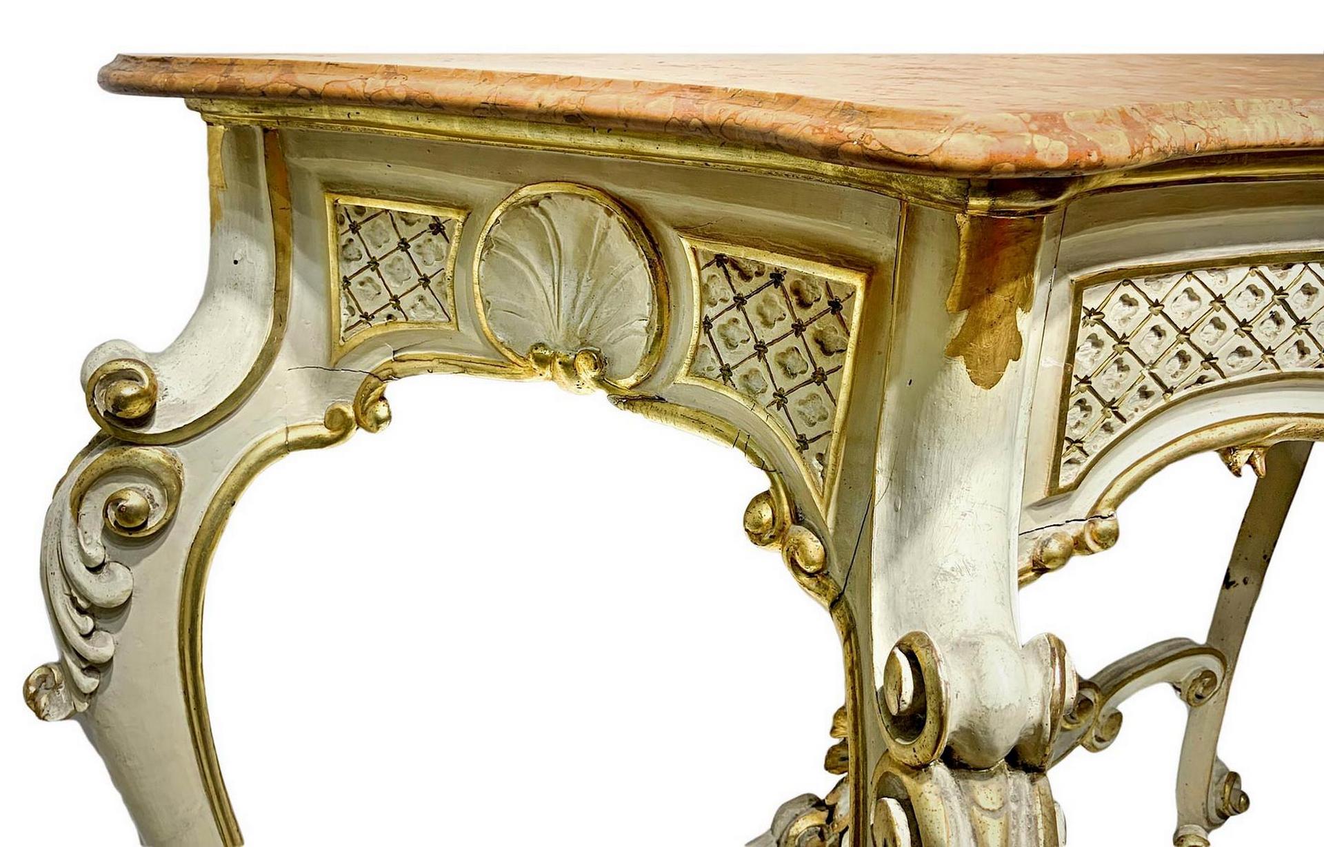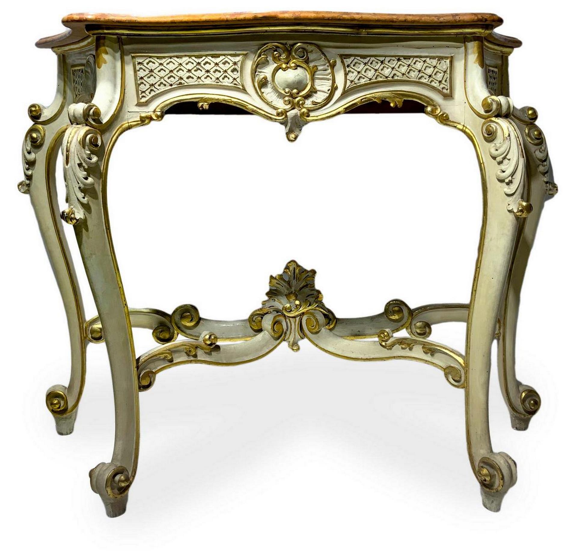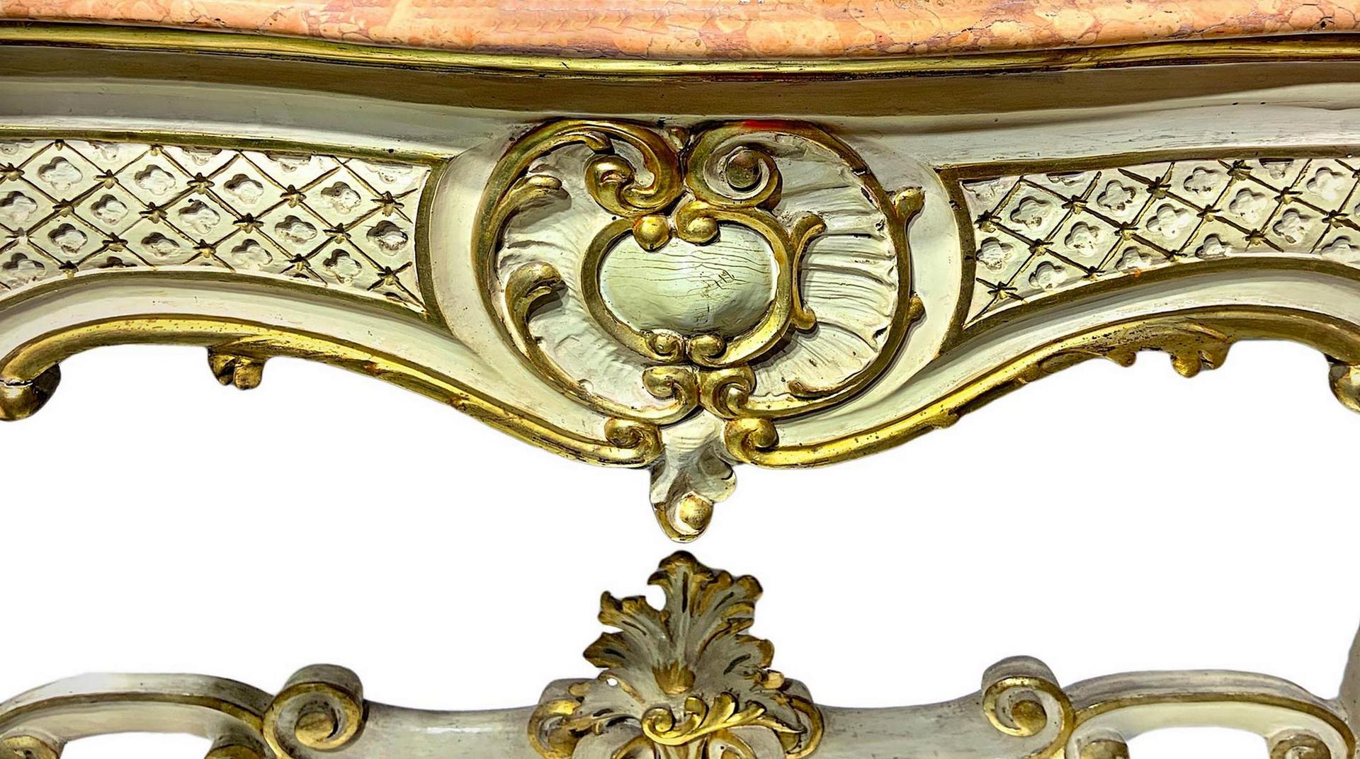 Console laccata e dorata nei toni del beige, inizi XX secolo, marmo al piano rosso verona chiaro. H cm 105x120x50