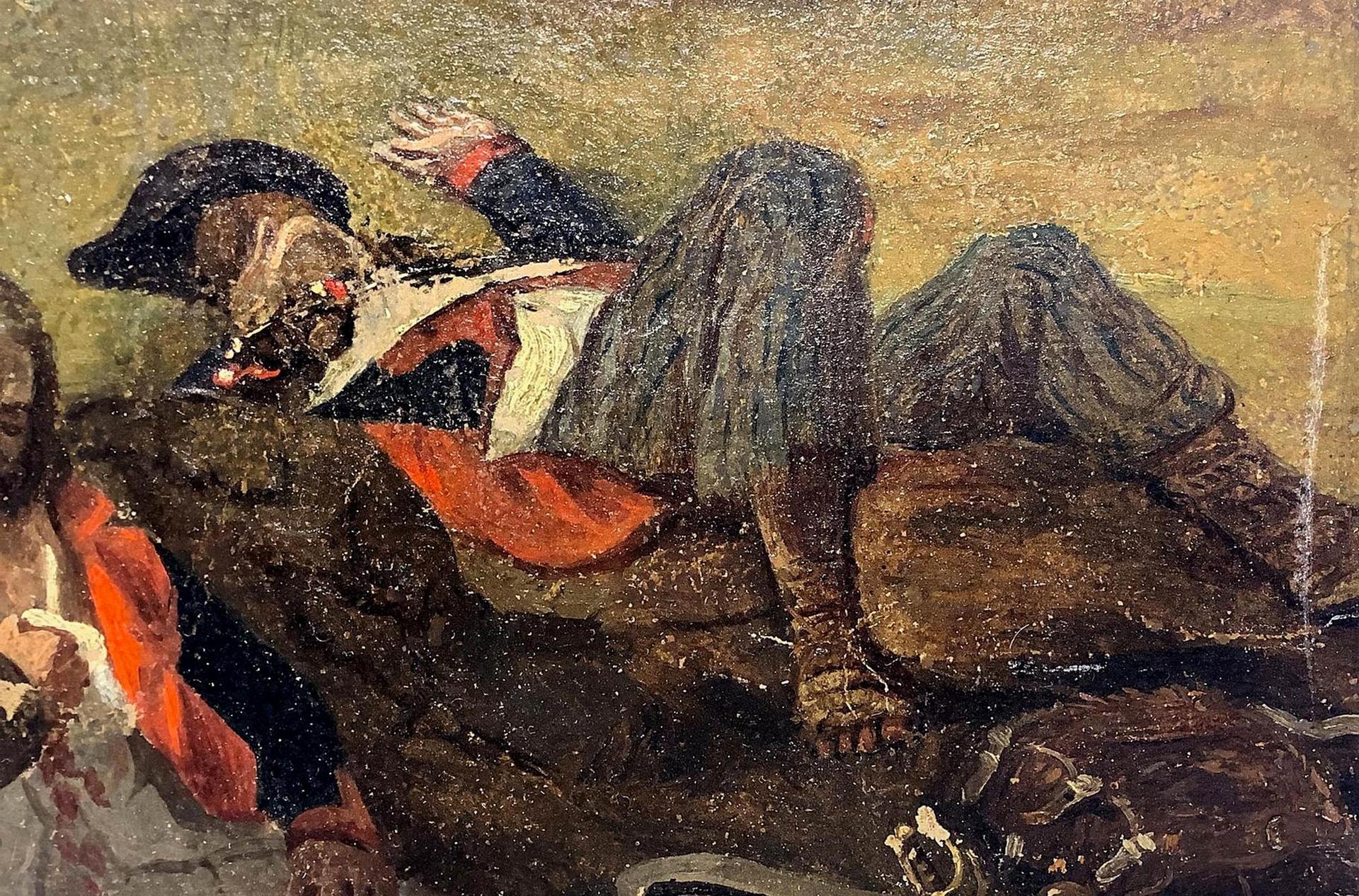 Dipinto ad olio su tela raffigurante soccorso a soldati feriti, XIX secolo....