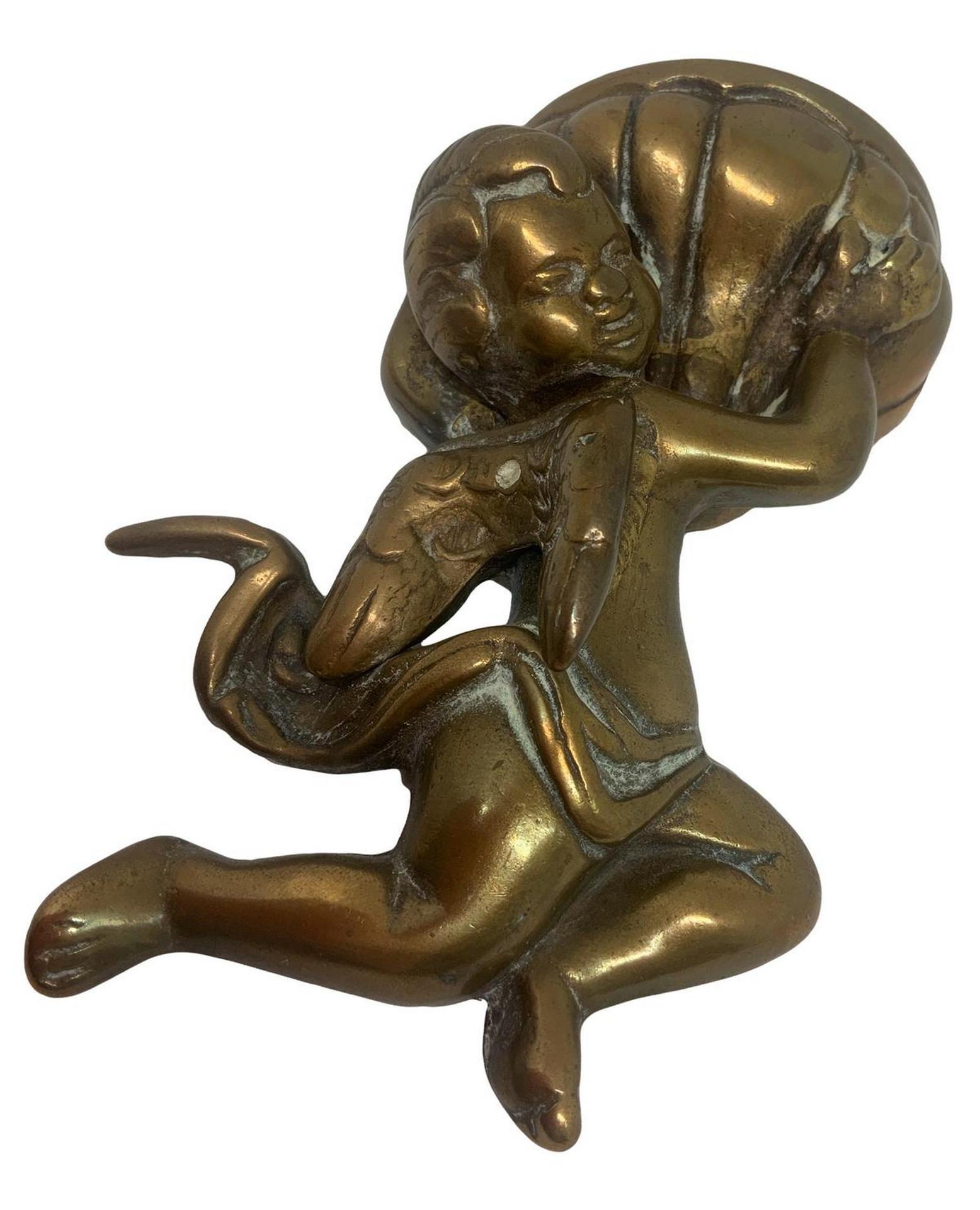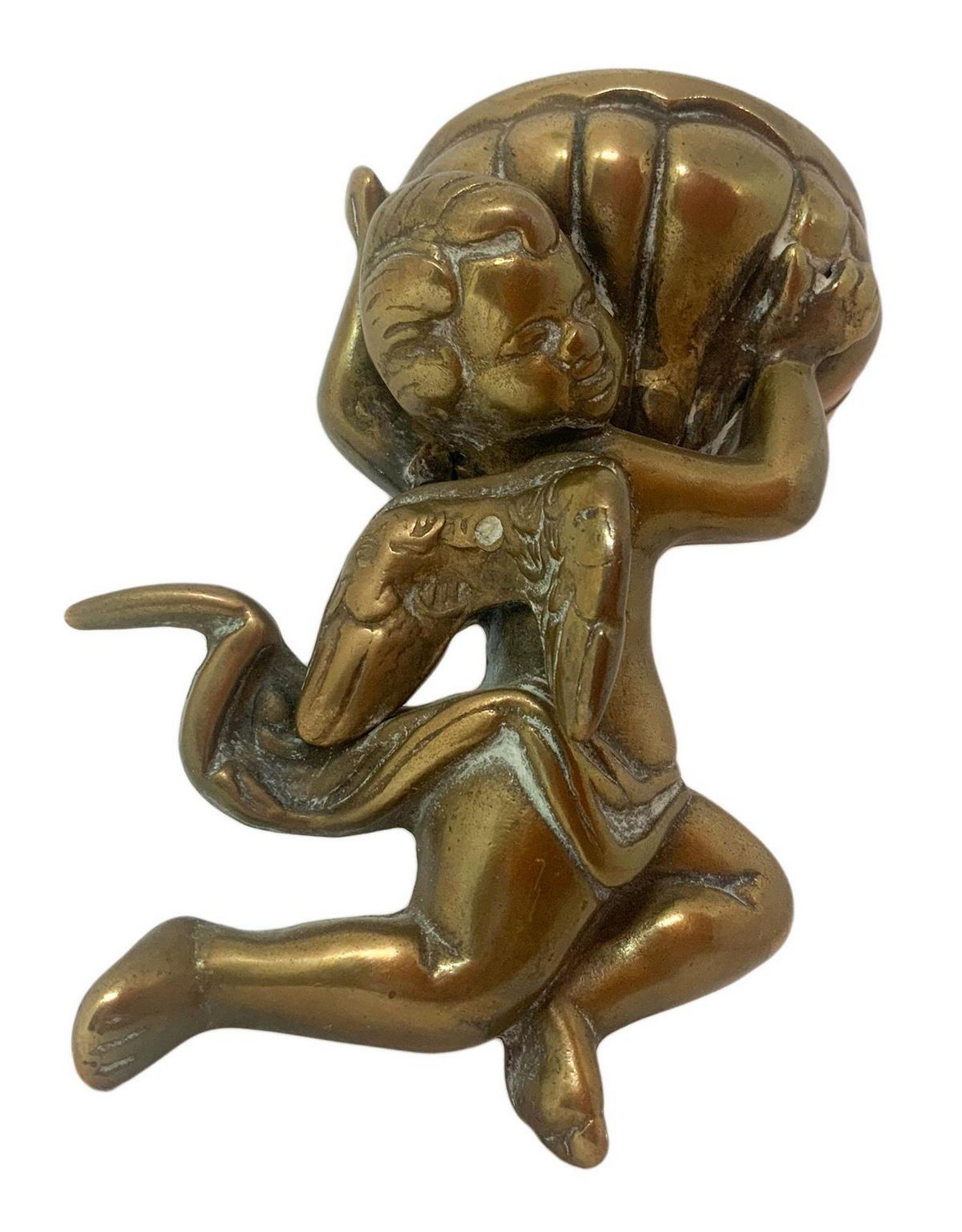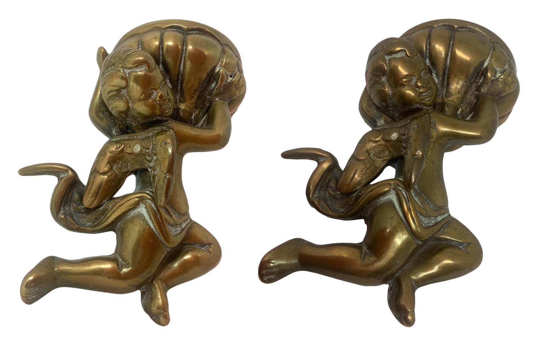 Coppia di acquasantiere in bronzo dorato con angeli alati che sostengono con le mani l'acquasantiera, XX secolo. Cm 14