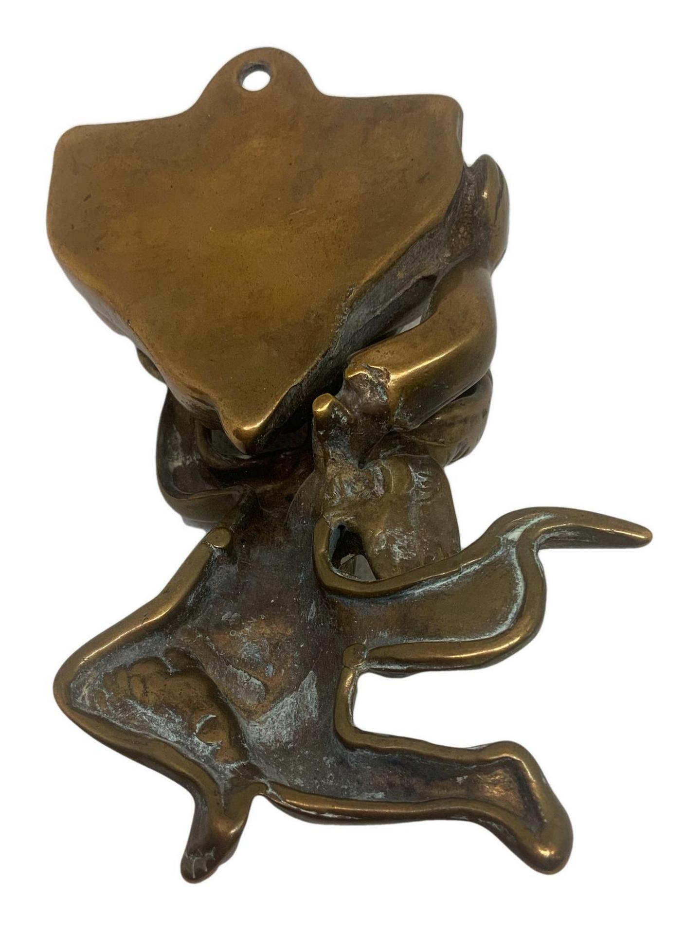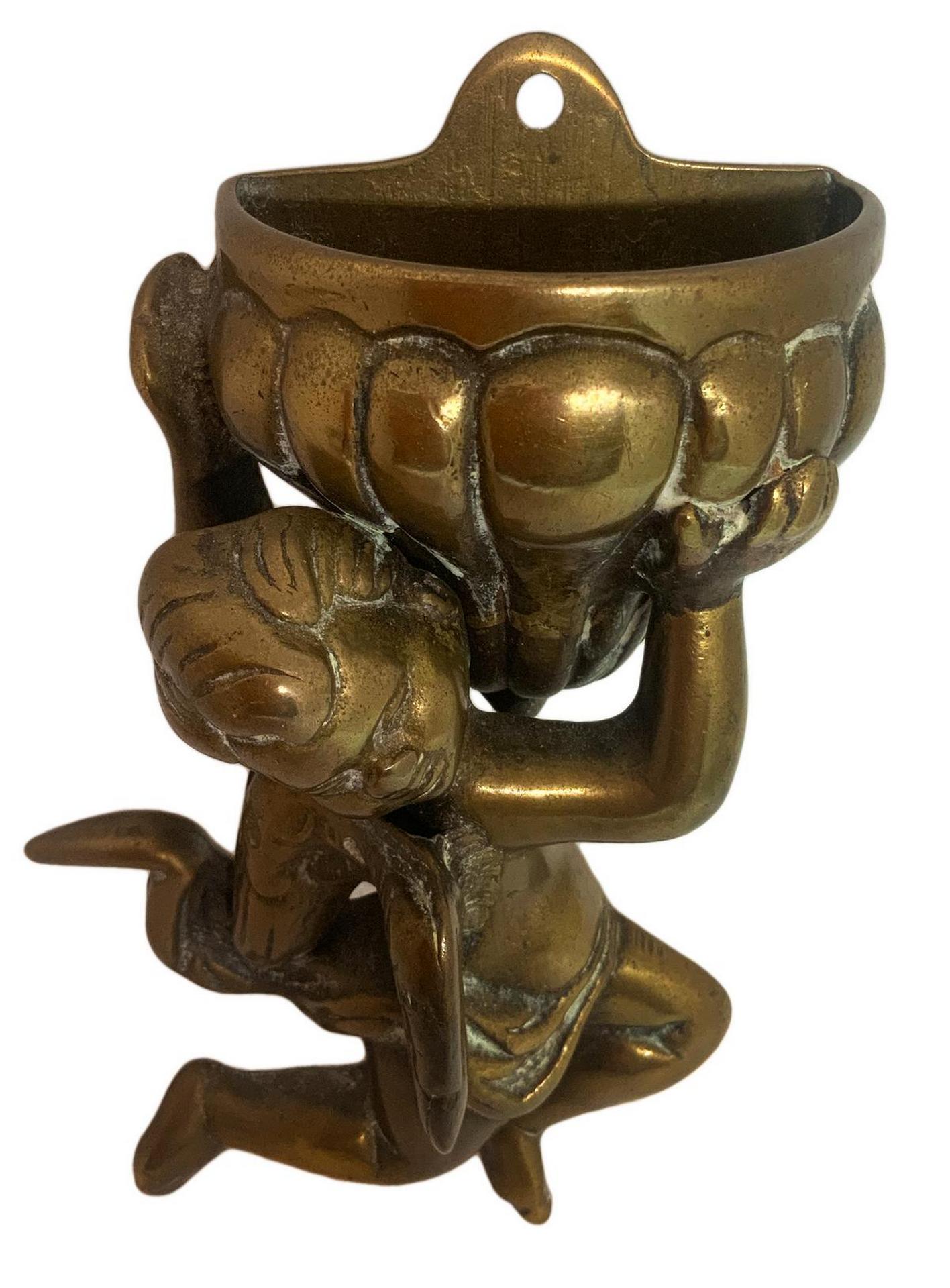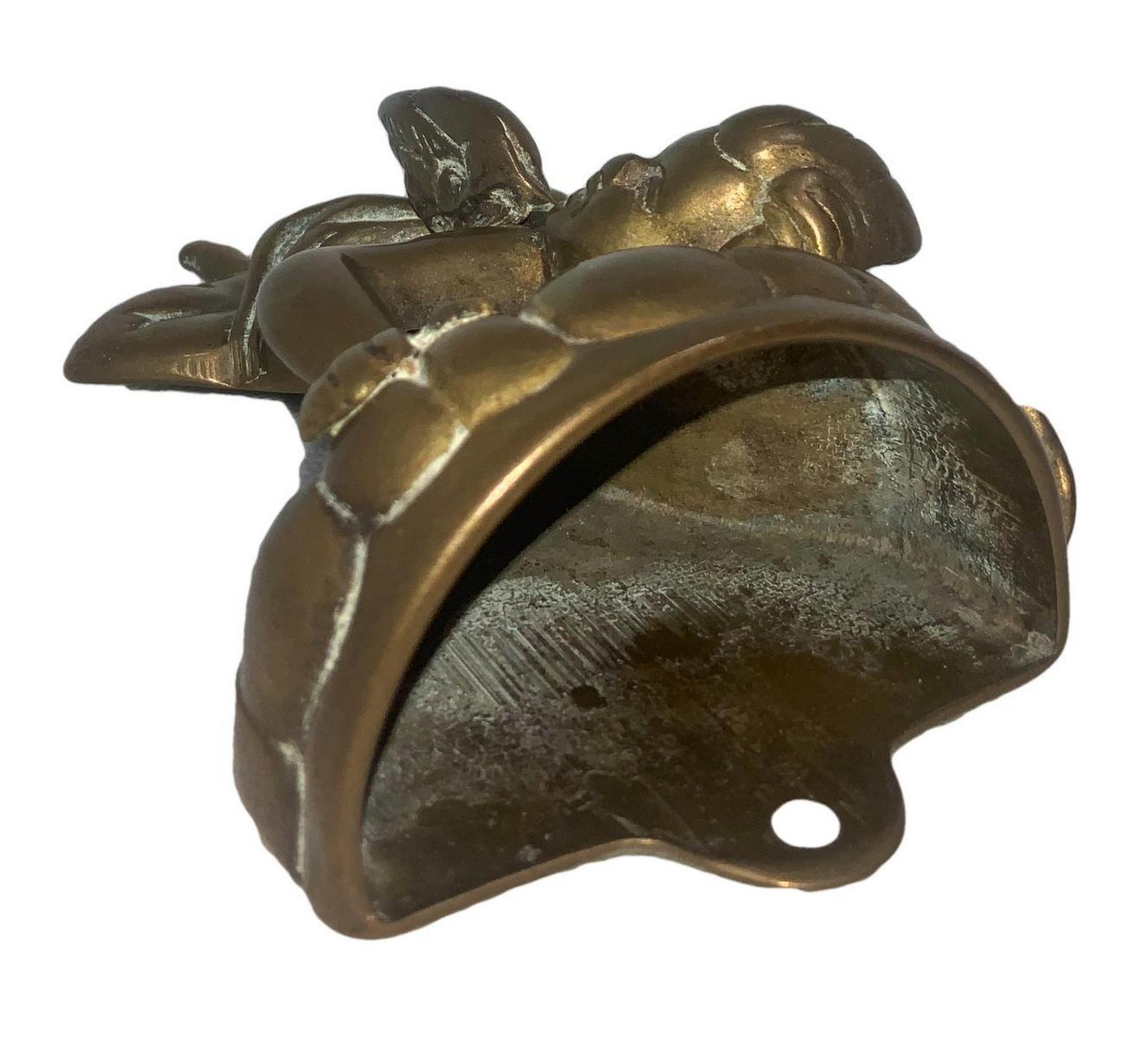 Coppia di acquasantiere in bronzo dorato con angeli alati che sostengono con le mani l'acquasantiera, XX secolo. Cm 14