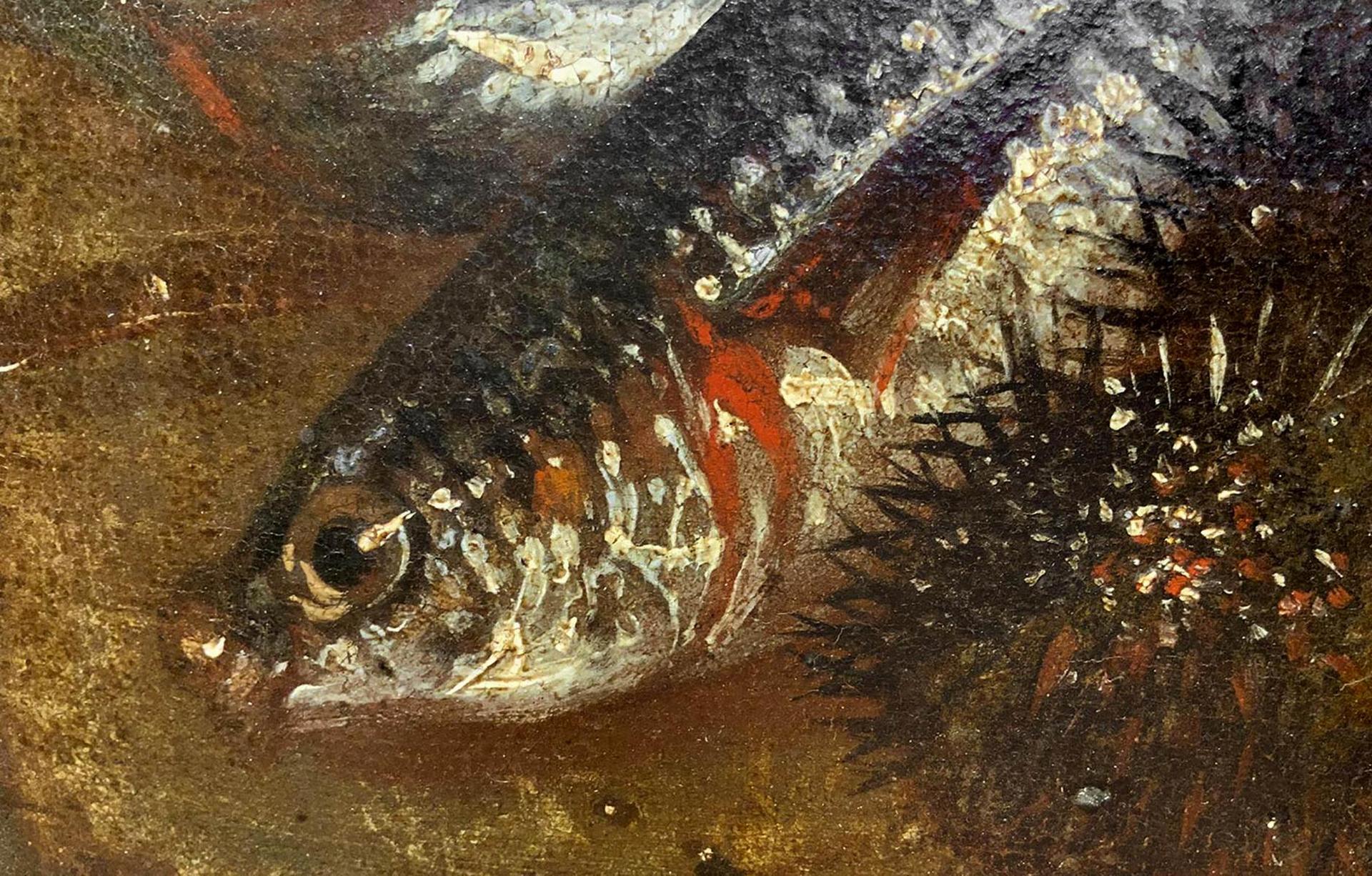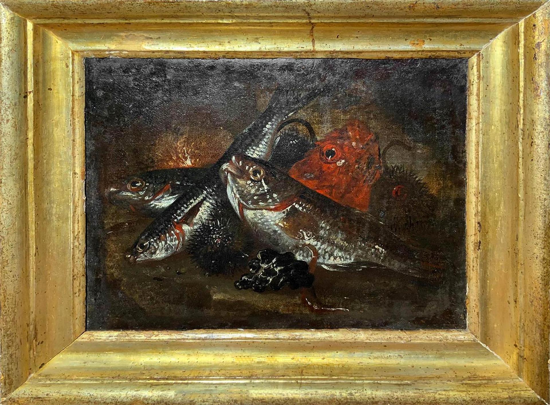 Giuseppe Recco (Napoli, 1634 – Alicante, 1695), Attrib. Natura morta di pesci. 40x48, olio su tela, con cornice cm 52x60. "Uno dei maggiori rappresentanti della natura morta napoletana, la cui produzione artistica é vastissima e variegata, specialista di nature morte con pesci. La sua formazione trova riferimenti assai vari essendo venuto a contatto con la cultura e gli ambienti romani, spagnoli e fiamminghi. Infatti il dipinto in questione trova elementi tipici fiamminghi nel trattamento coloristico. Inoltre da notare come l'umile materia della natura morta viene trasfigurata con tocchi di luce sul fondo chiaroscurale e assurge a dimensioni neocaravaggiste, trascendendo da influenze barocche tipiche del suo tempo. Luce, colore e brillantezza sono i canoni della sua pittura." STUDIO ASOR