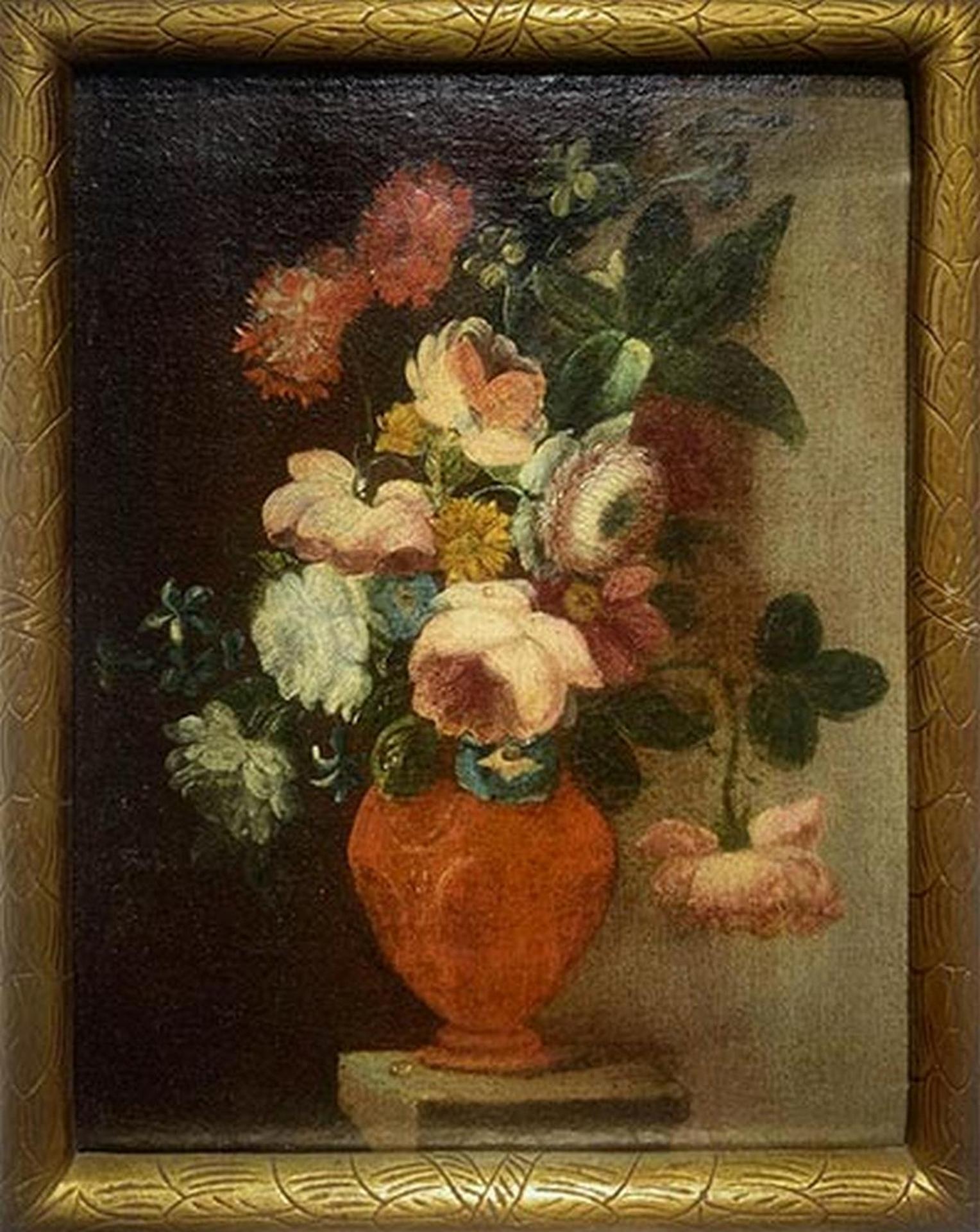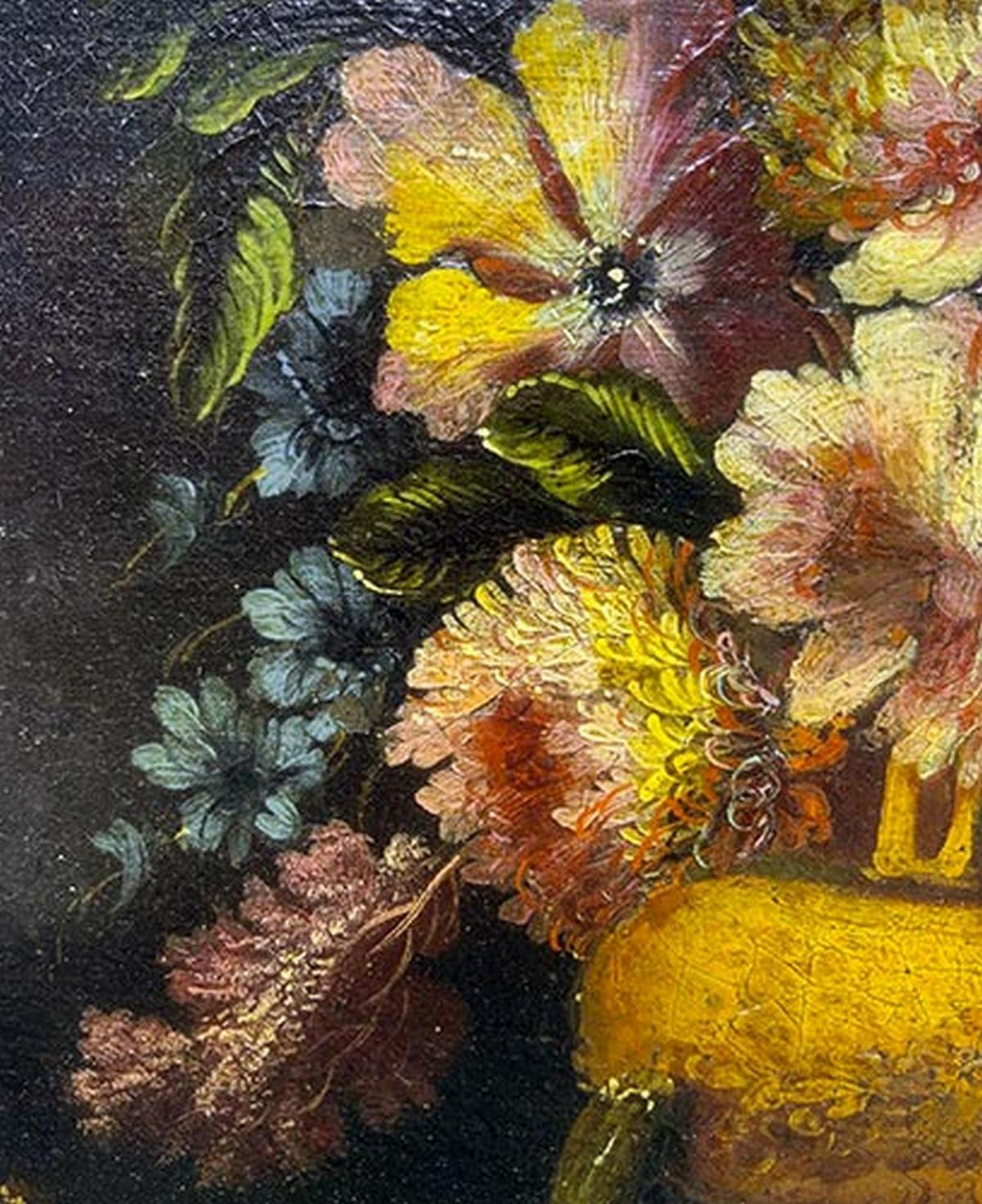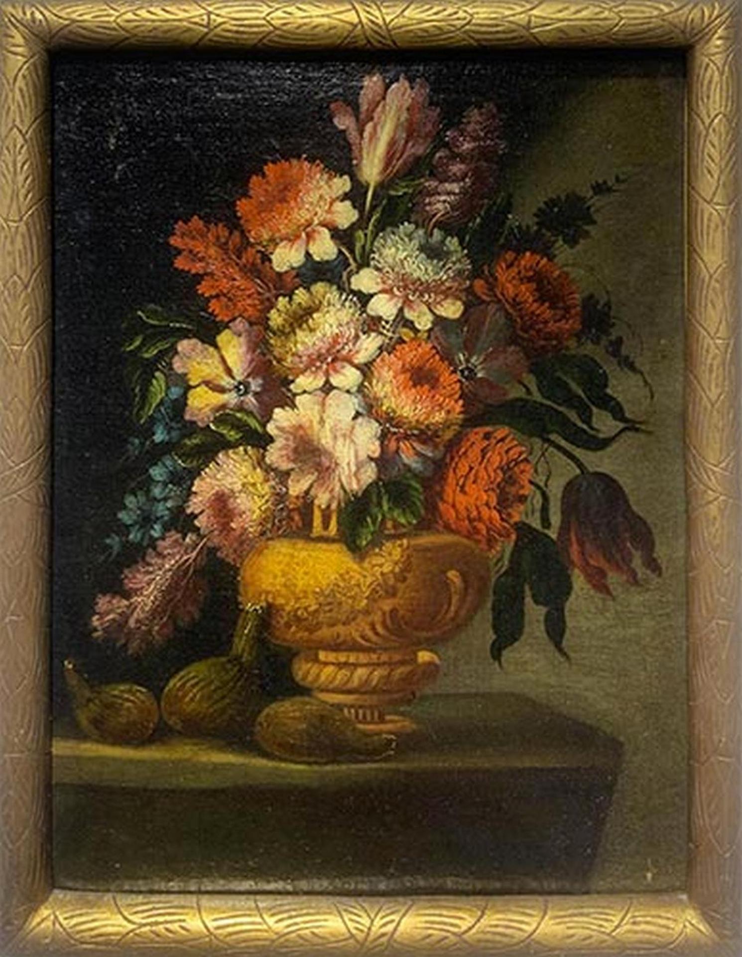 Coppia di dipinti ad olio su tela raffiguranti natura morta di fiori, pittore del XVII secolo. Cm 47,5x35,5, olio su tela. "Scuola toscana del XVII-XVIII secolo, cerchia di Andrea Scacciati (1644-1710). Ciascuna disposta in vaso, in elegante equilibrio geometrico, opere di un pittore toscano che risente di reminiscenze fiamminghe e del modo di dipingere romano. I caratteri delle composizioni fanno propendere per un artista vicino alle caratteristiche del fiorentino Andrea Scacciati. Infatti le opere, pur evidenziando una connotazione toscana, si configurano come anello di congiunzione tra la scuola fiamminga e quella toscana, evidenziando altresì una maniera di dipingere alla romana o meglio alla Mario dei Fiori con la messa in ombra di parte della composizione che valorizza e da plasticità al corpo del dipinto nella sua centralità sul fondo scuro." STUDIO ASOR