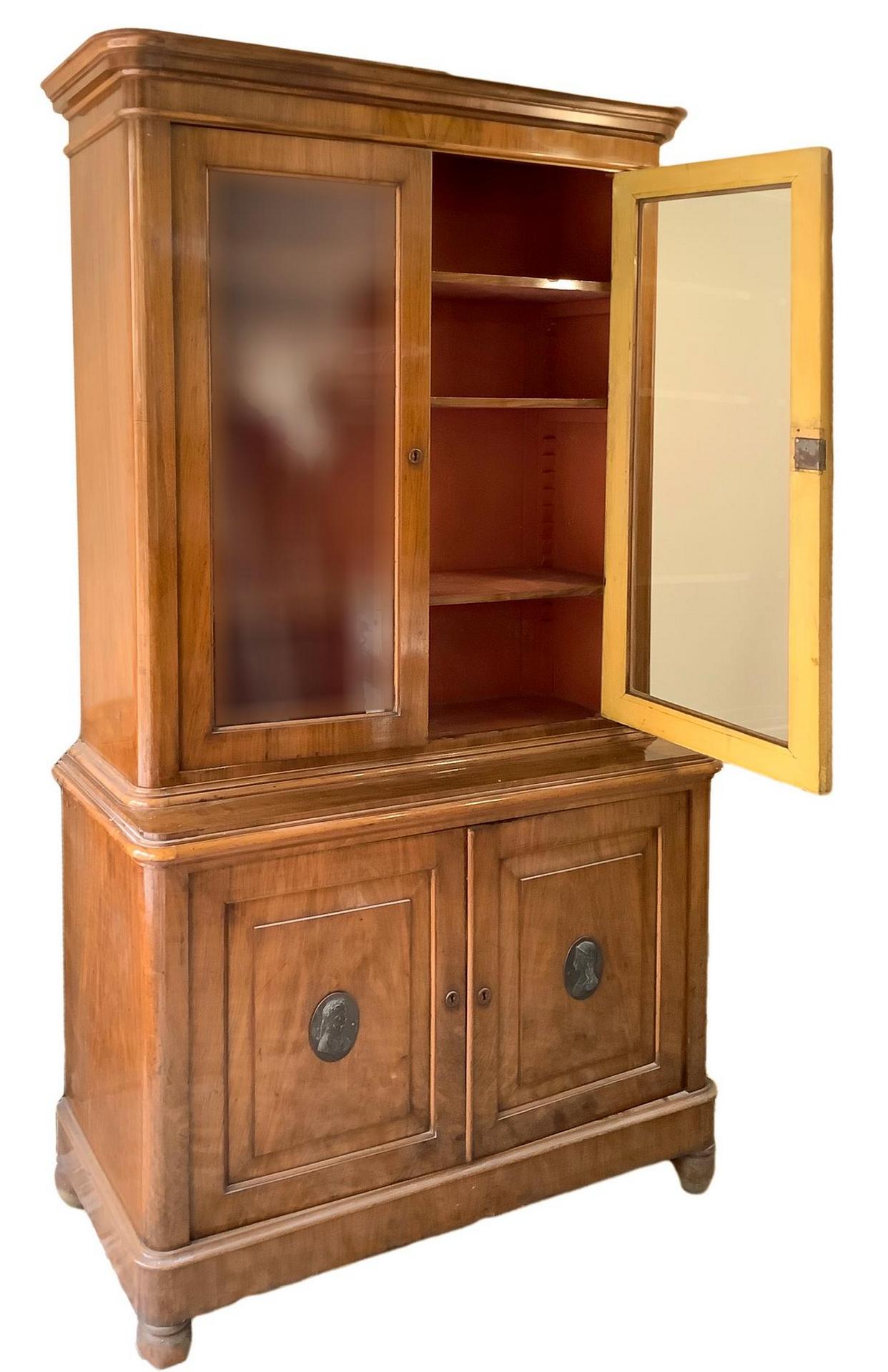 Credenza in legno di noce con sportelli alla base e vetri sul corpo superiore. H cm 217. Larghezza cm 125. Profondità cm 55