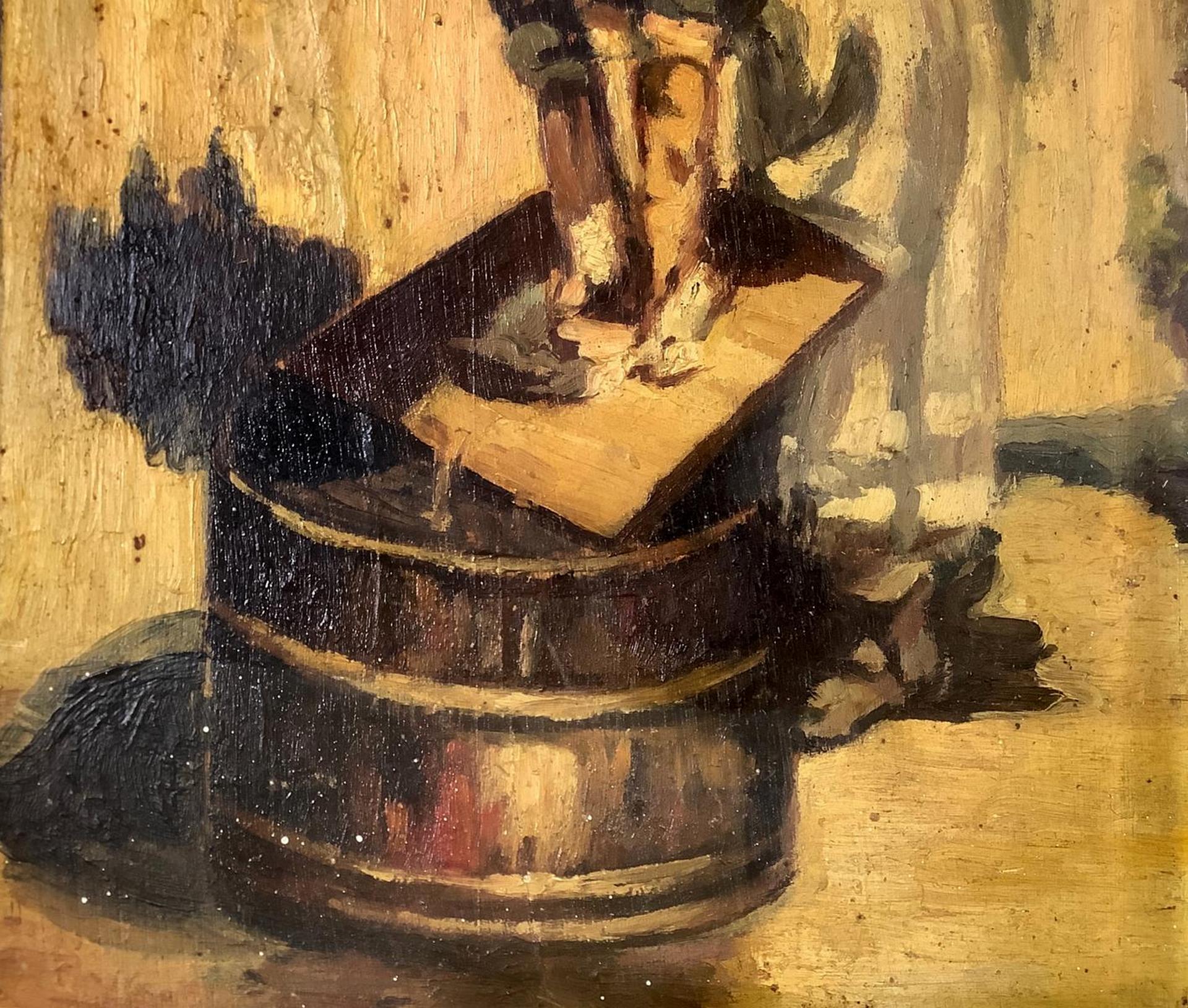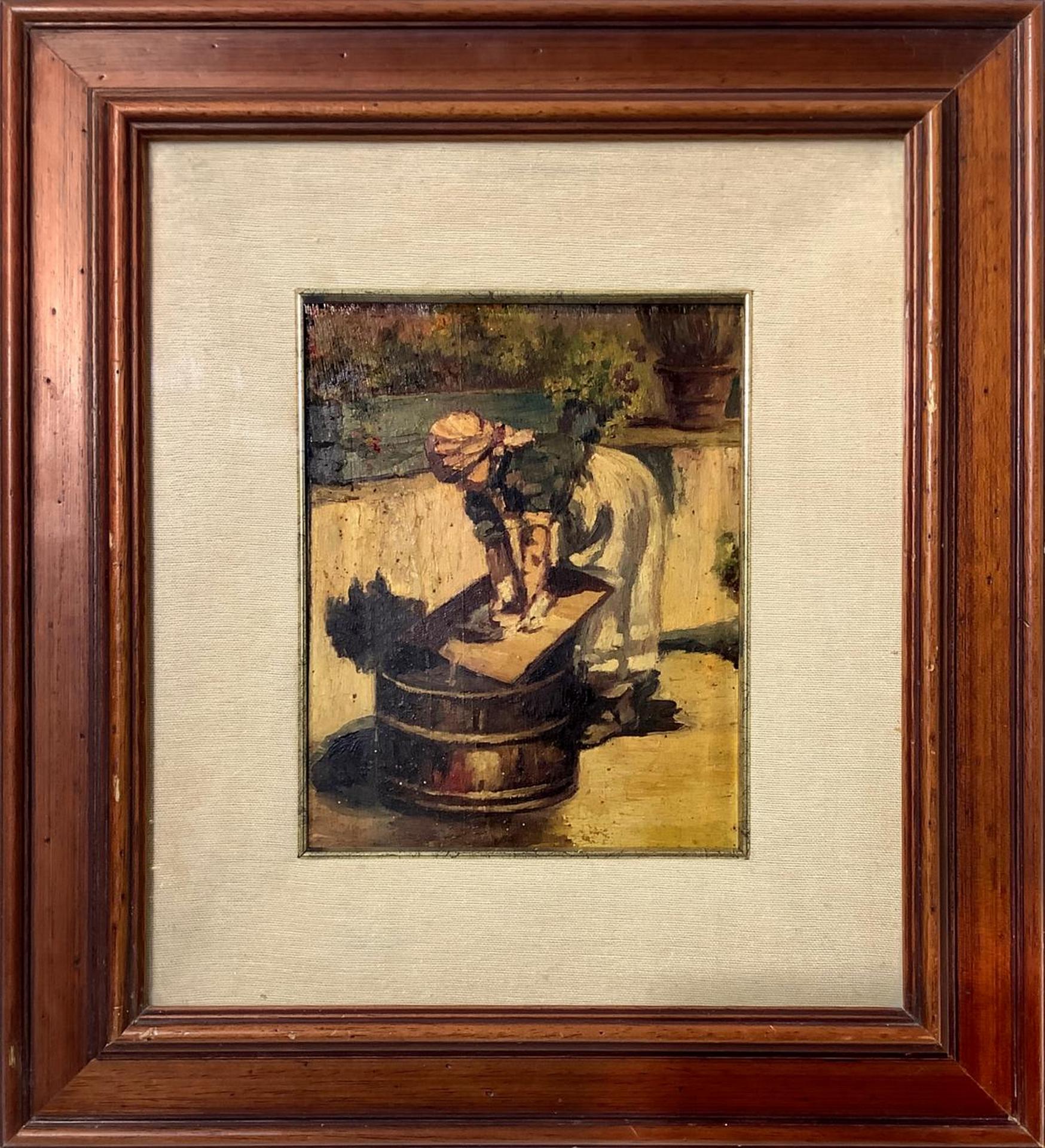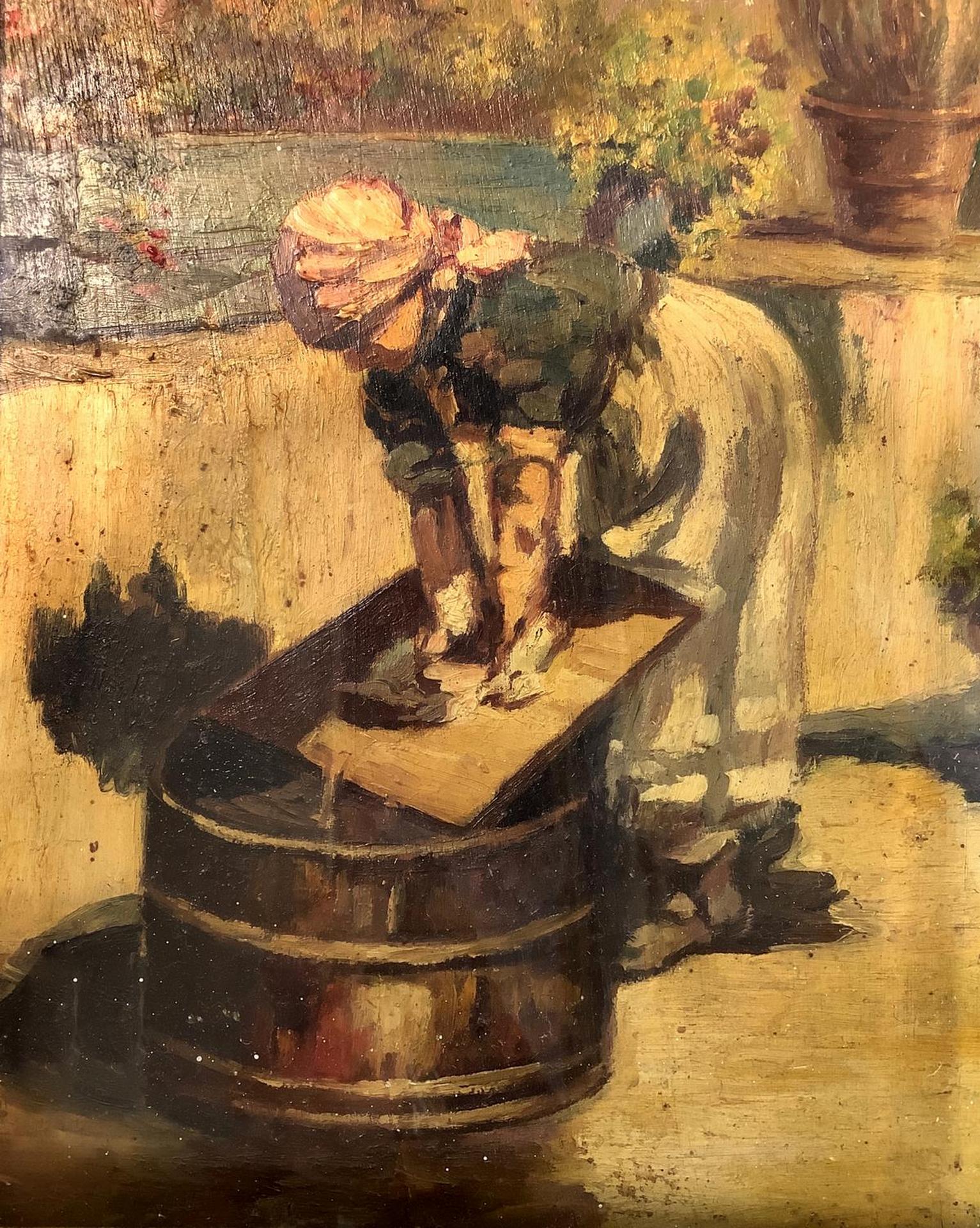 Dipinto ad olio su tavola raffigurante lavandaia. Cm 25x21,5. In cornice cm 49x44.