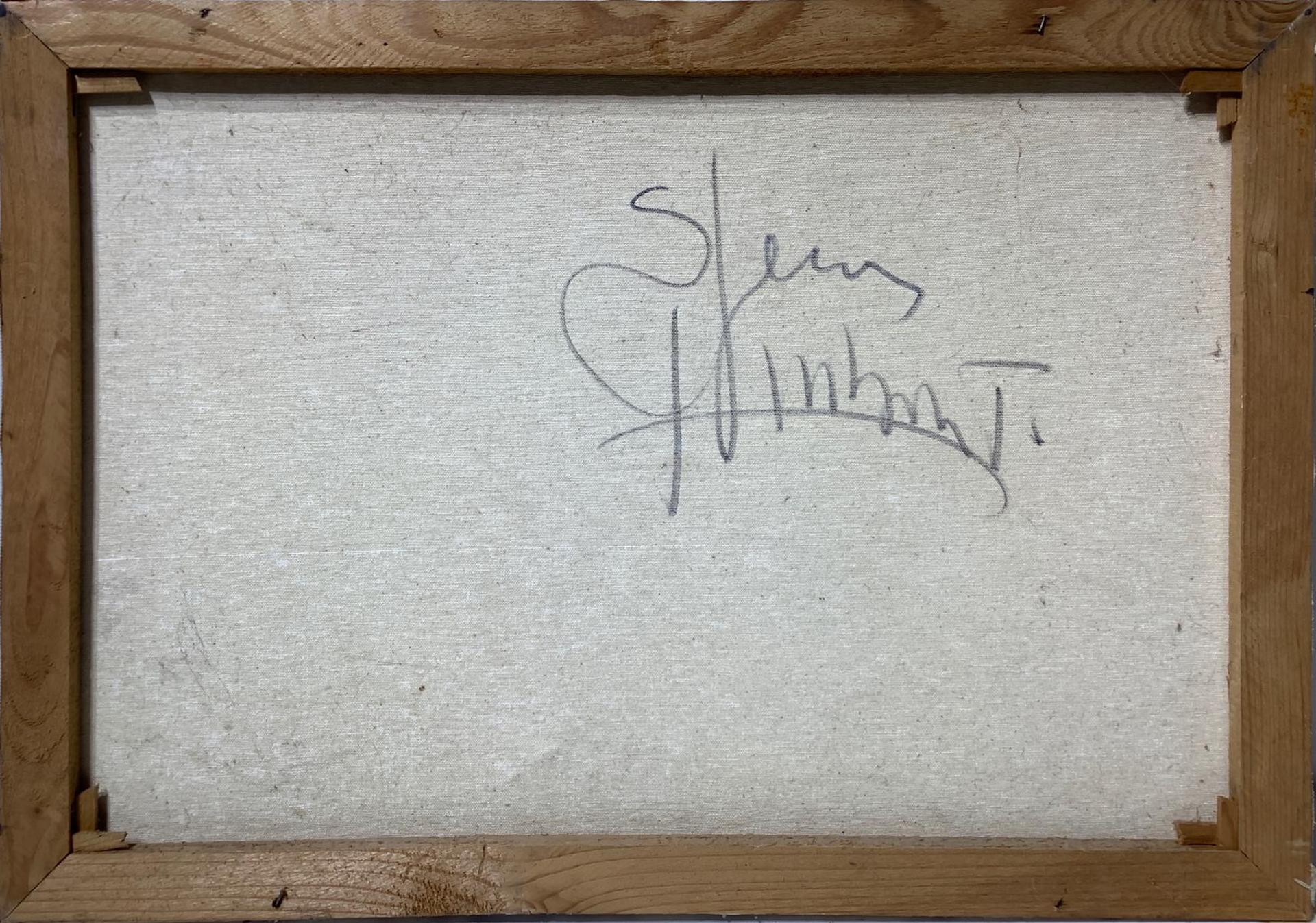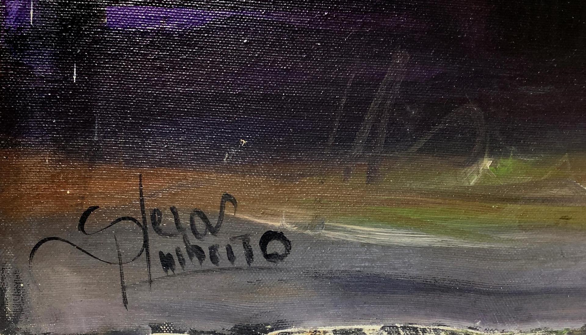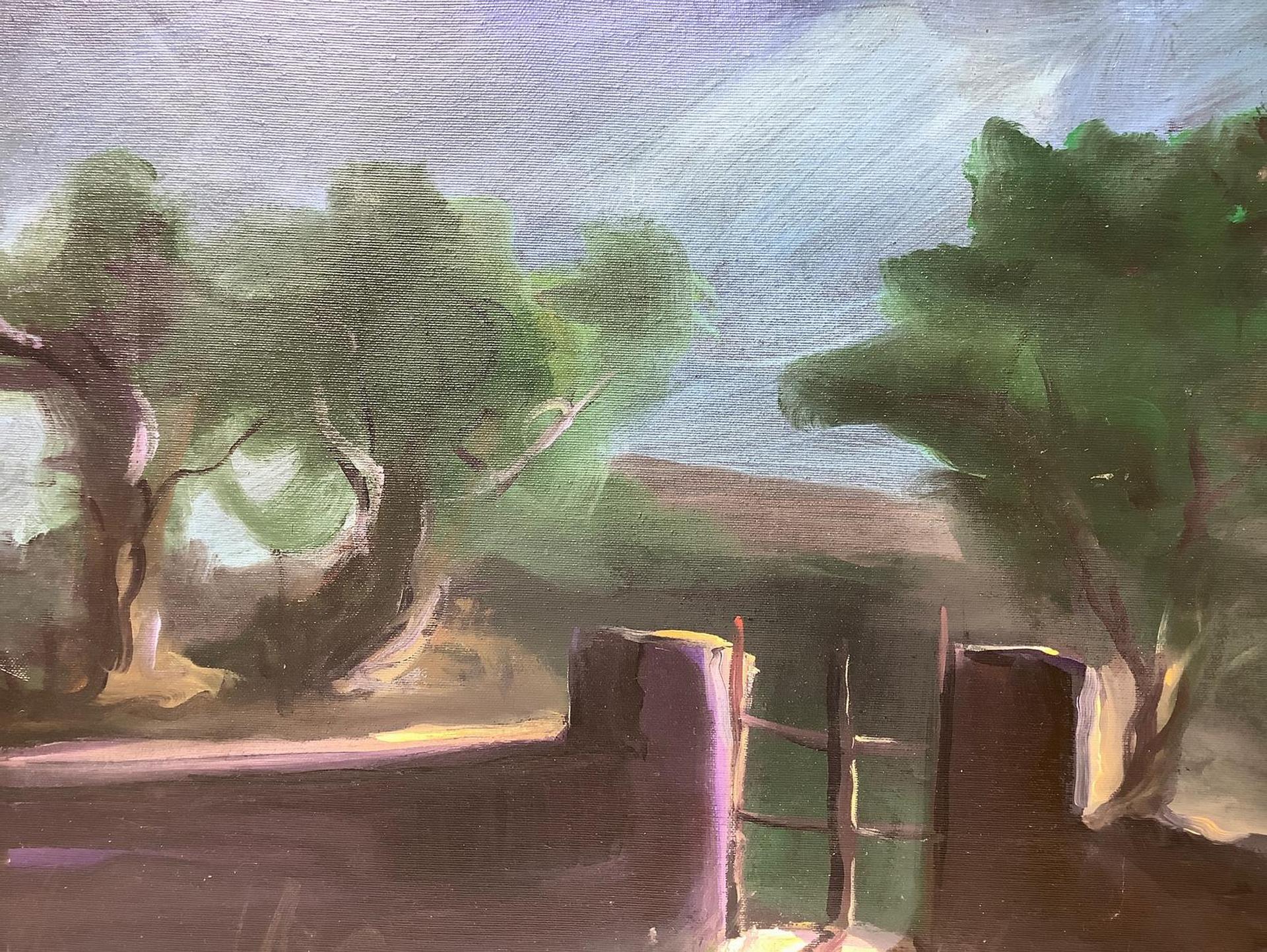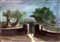 Dipinto ad olio su tela raffigurante paesaggio con muretto e cancello,...