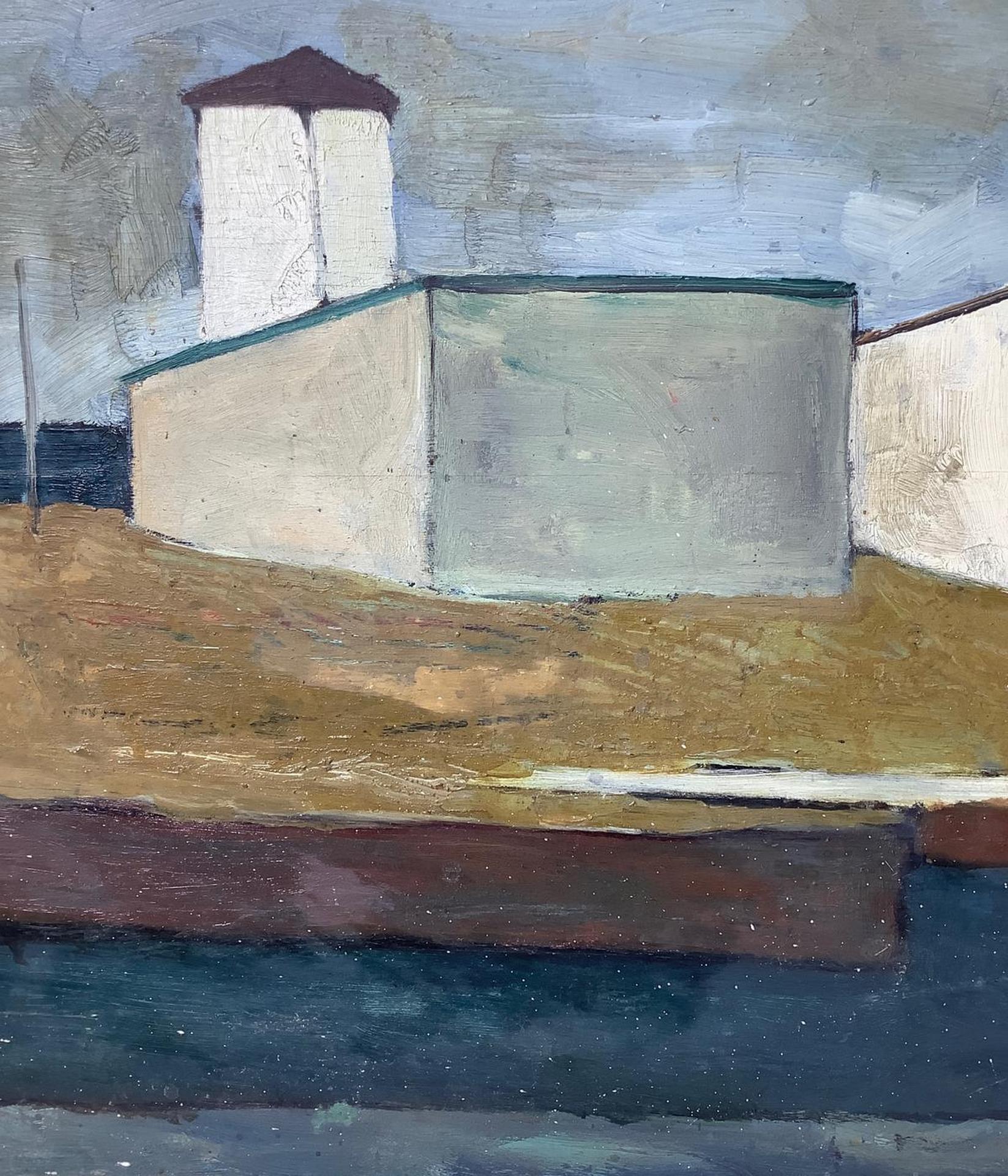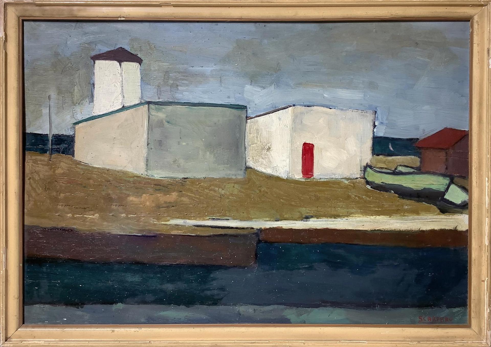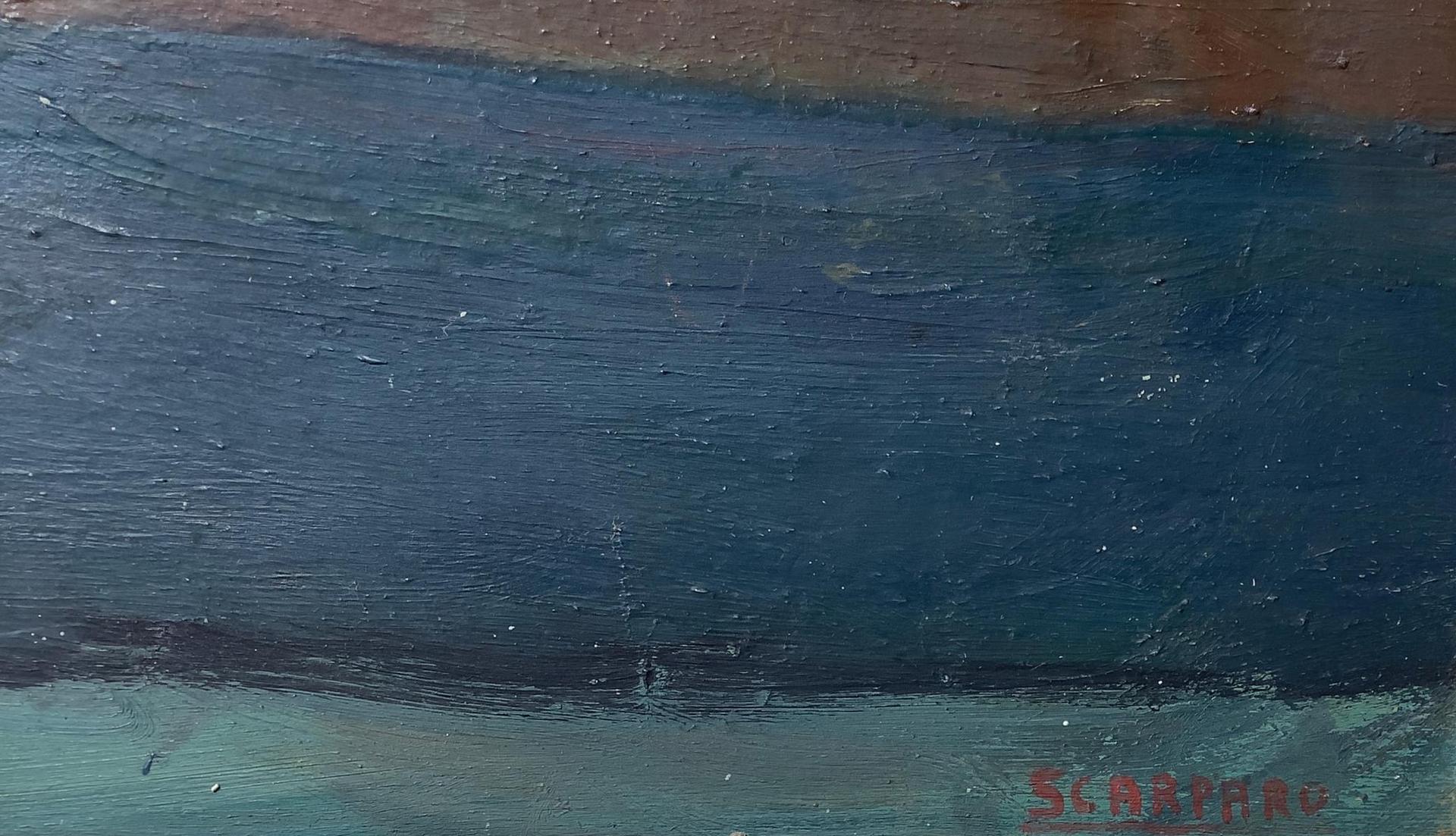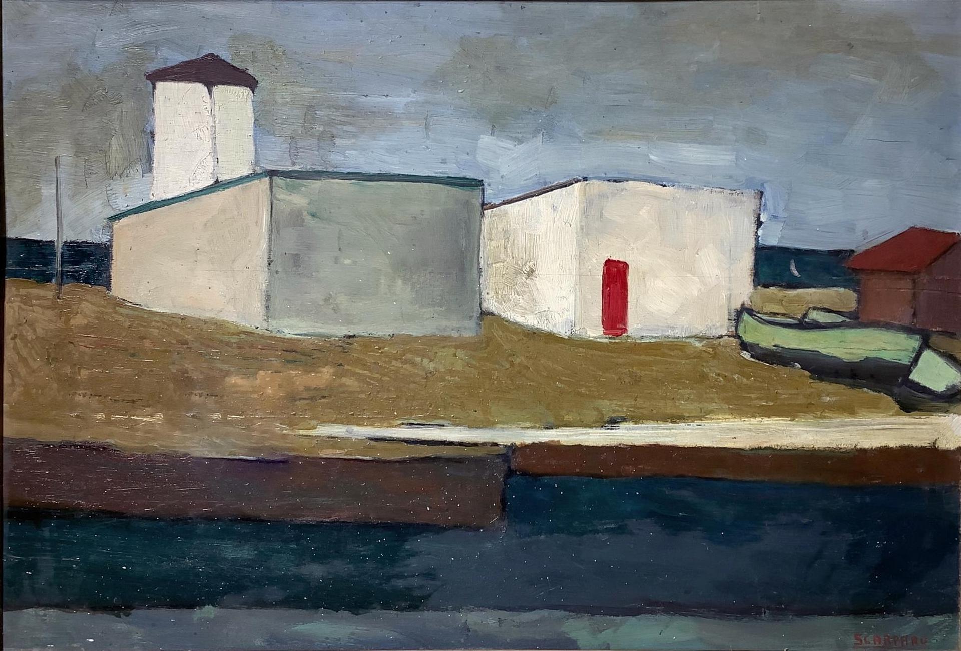 Dipinto ad olio su tavola, raffigurante marina con case, firmato in basso a destra Scarparo. Cm 45x65, in cornice cm 51x71