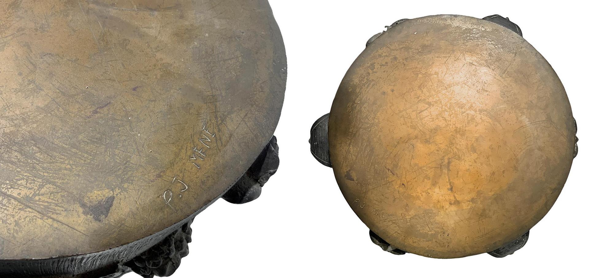 Guéridon in bronzo sbalzato. H cm 72. Base con piedi leonini cm 50. Firma sul piano P.J. Mene. Pierre - Jules Mêne (Francia 1810 - 1879)