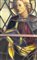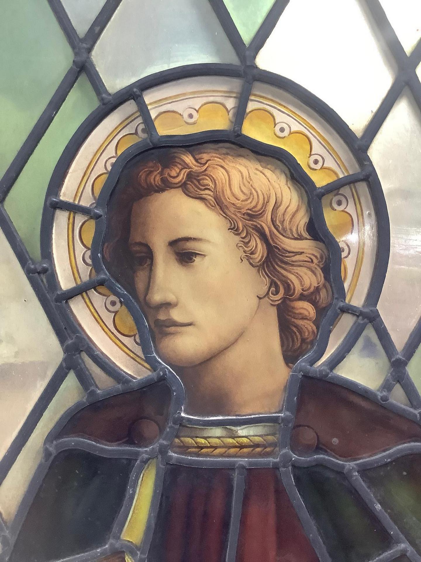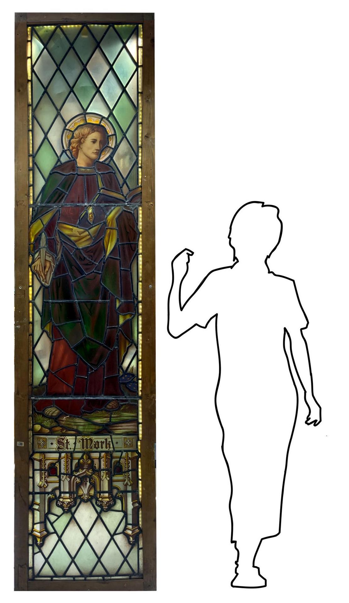 Antica vetrata rilegata a piombo con immagini a infusione nel vetro raffigurante San Mark, l'Evangelista. In telaio in legno, larga cm 6.H cm 255. Larghezza cm 60. Retroilluminata.